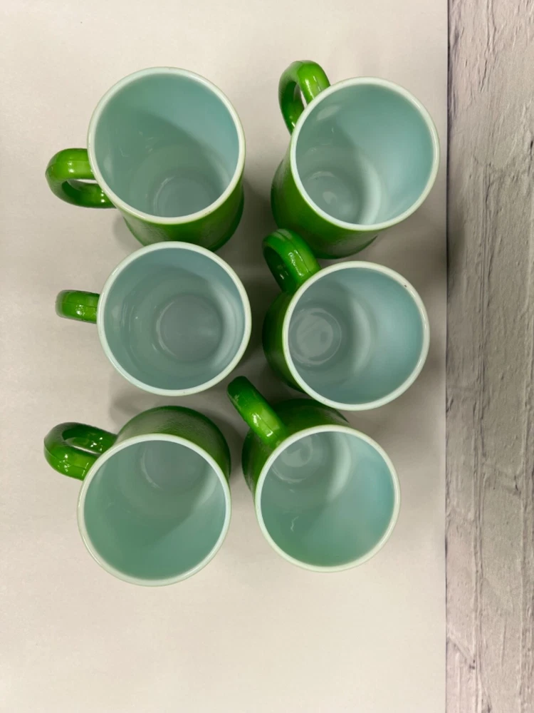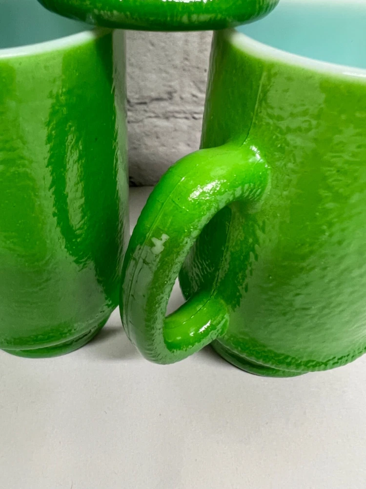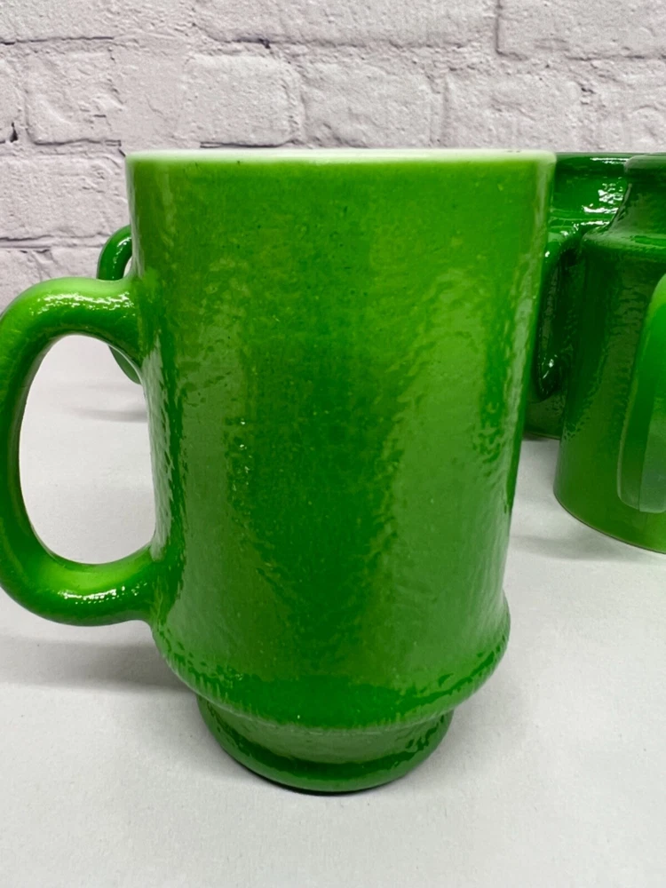 Good vintage condition. No chips, cracks or breaks. There is some slight color wear. One handle has a small are where the green color is worn off. The glass is heavy and textured. Approximately 4.75”x 2.75” and 10oz. Please see photos for condition. Thanks for looking.