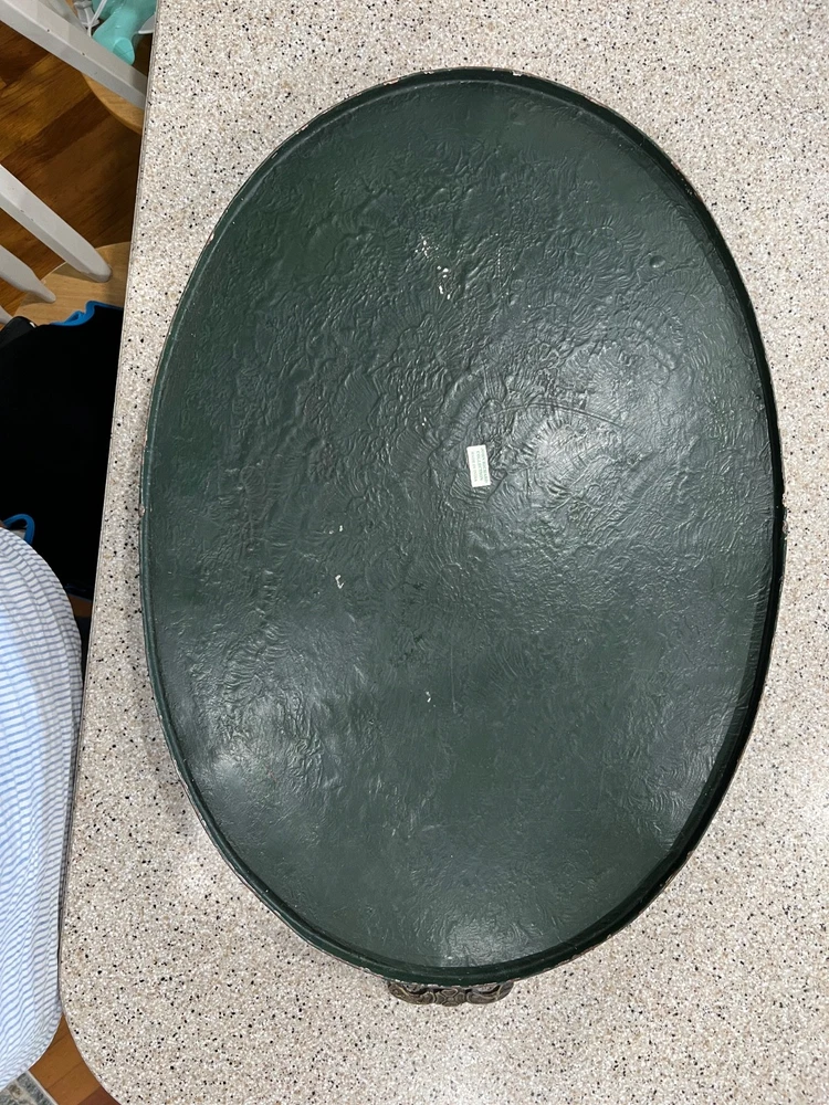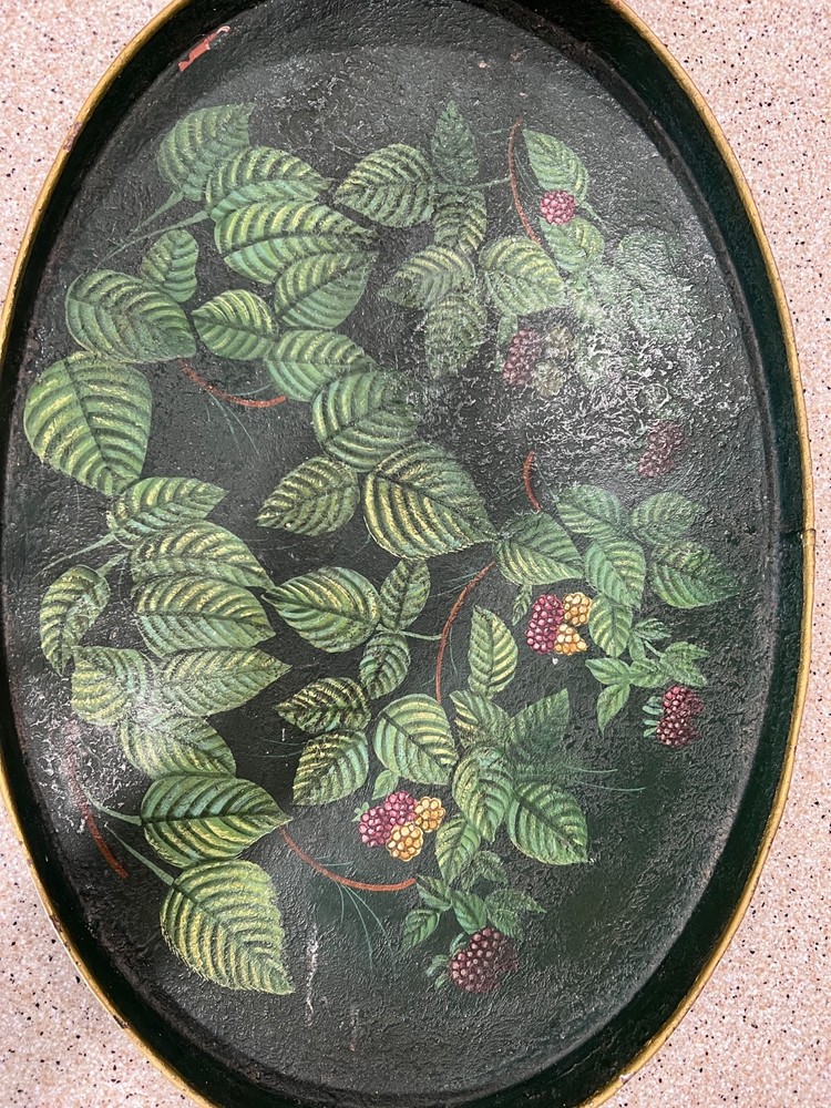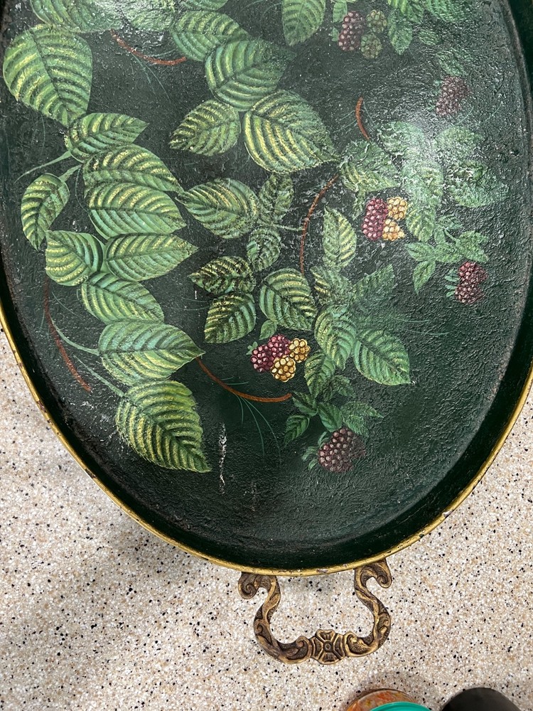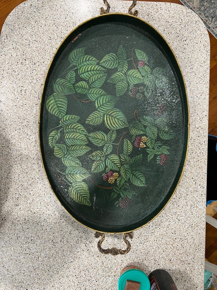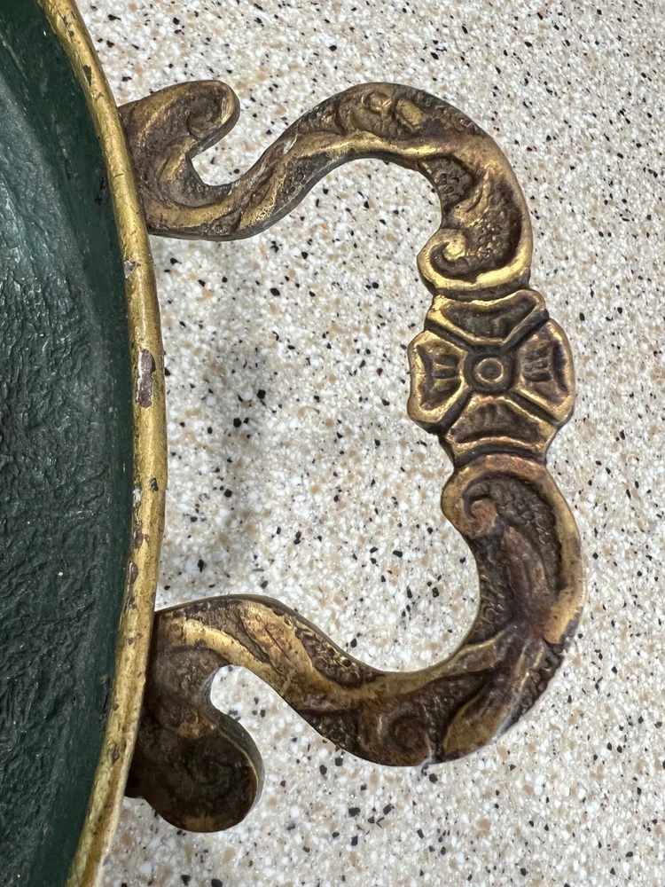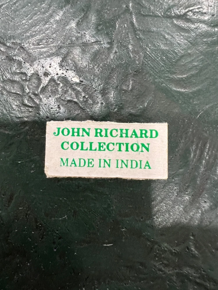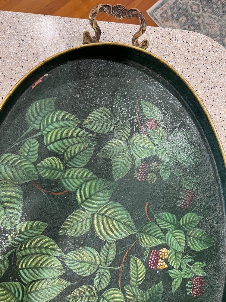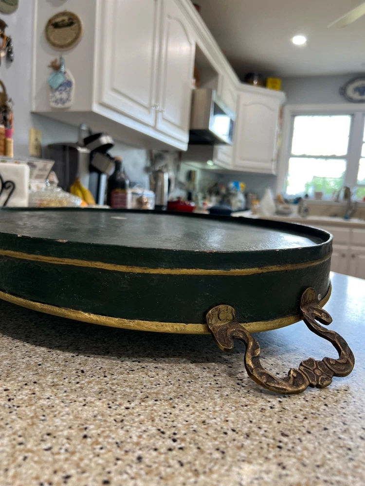 The Vtg John Richard Collection hand painted metal tray with brass handles is a vintage serving tray that is perfect for all occasions. The tray features a multicolor painted finish and is made of brass and metal. With its unique design and antique vintage appeal, this tray adds a touch of elegance to any kitchen or dining area. The tray has a single compartment, brass handles, and is lightweight at 5 lbs, making it easy to carry and use for serving beverages or snacks.