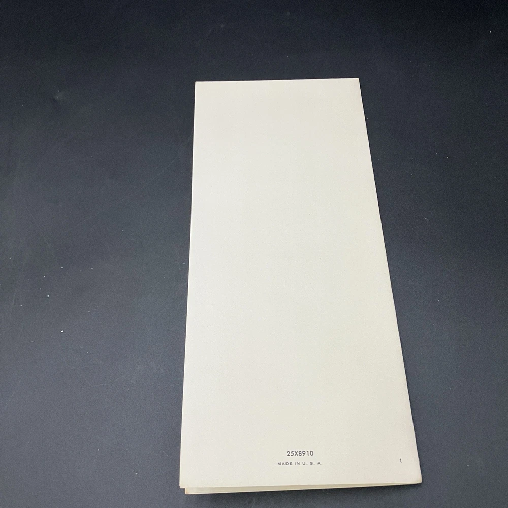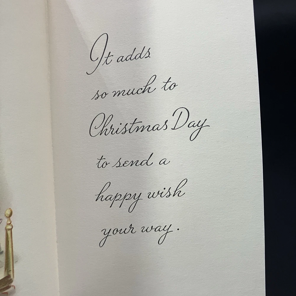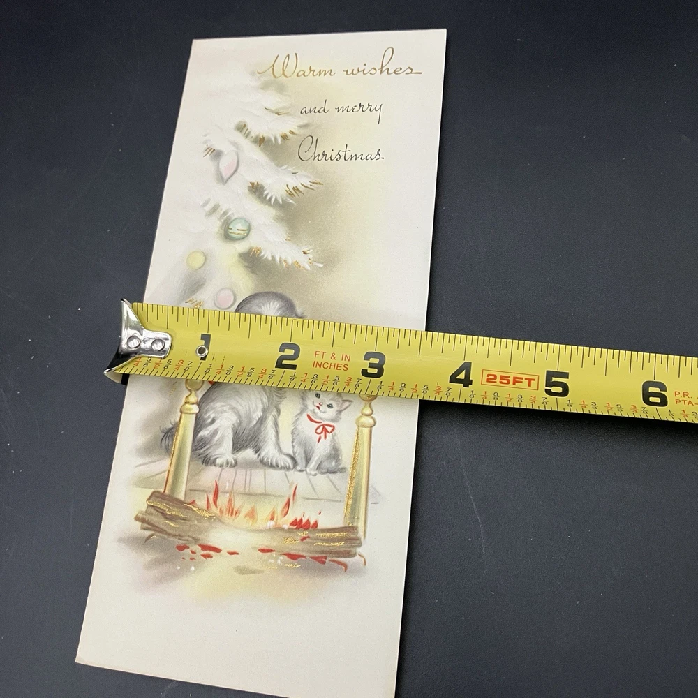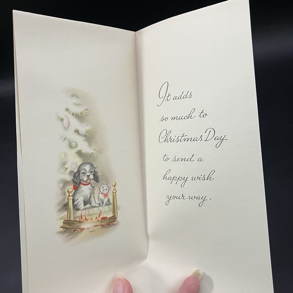 Charming vintage mid-century modern Christmas greeting card featuring a gray puppy with red bow and a fluffy kitten by the fireplace, next to a white Christmas tree decorated with pastel ornaments. Beautifully embossed with gold accents. • Size: approx. 7.5” x 3.5” • Inside: “It adds so much to Christmas Day to send a happy wish your way.” with illustration of puppy and kitten by the tree • Back: Marked “25X8910 Made in U.S.A.” • Condition: Excellent vintage condition, unused, no writing. Slight age toning consistent with age. • No envelope included. Wonderful addition to a vintage ephemera collection, or perfect for framing and display during the holidays.