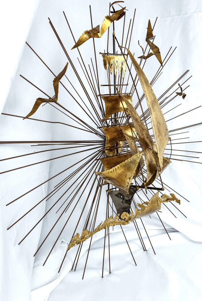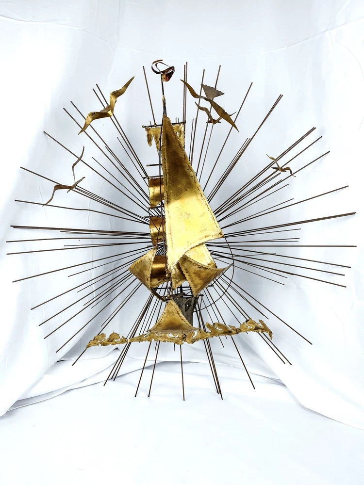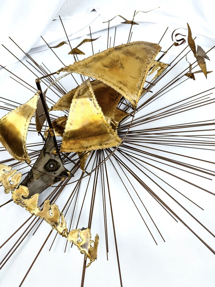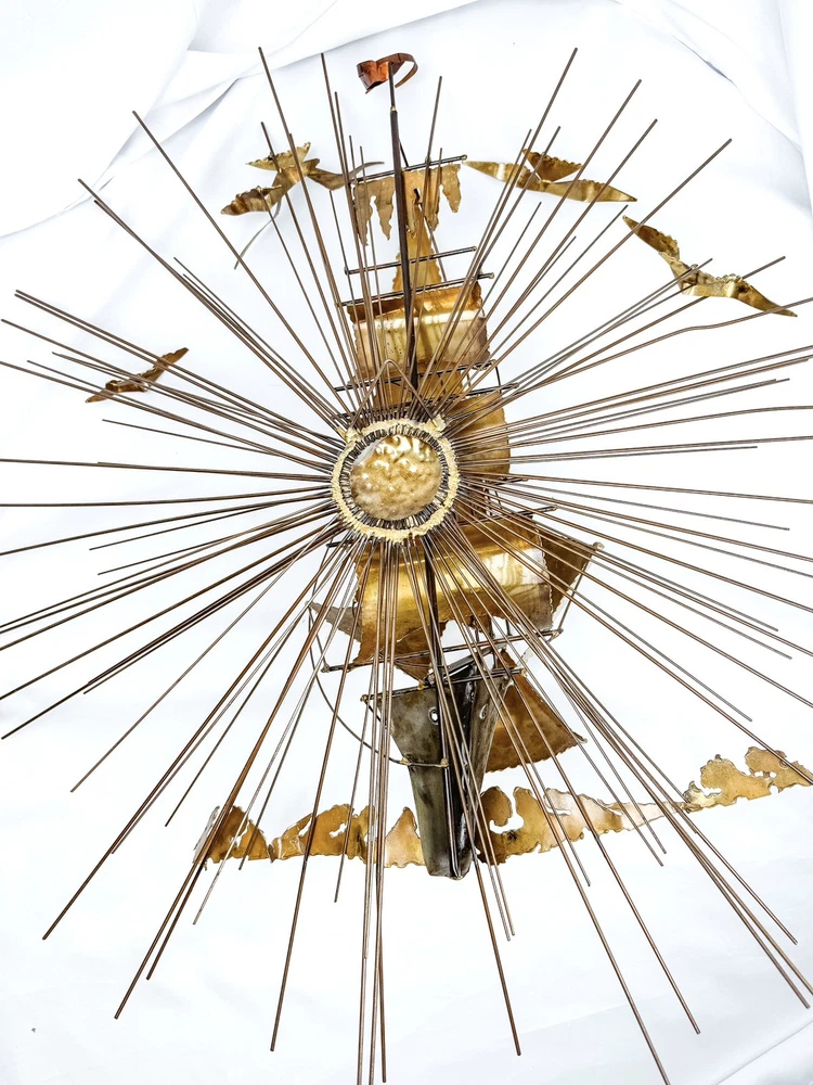 gtin13:Does not applyStyle:ModernismPeriod:Post-War (1940-1970)UPC:Does not applyCountry/Region of Manufacture:United StatesSize:LargeSubject:Ships, SunburstTime Period Produced:1970-1979Handmade:YesFormat:Wall ArtItem Height:30 inYear of Production:1978Material:MetalItem Length:30 inType:SculptureProduction Technique:MetalworkItem Width:9 inOriginal/Licensed Reproduction:OriginalSigned:YesTheme:Art, NatureArtist:Unknown