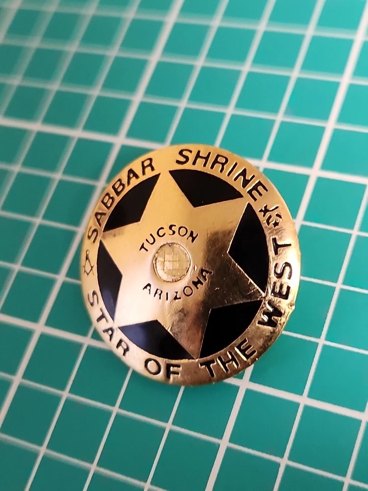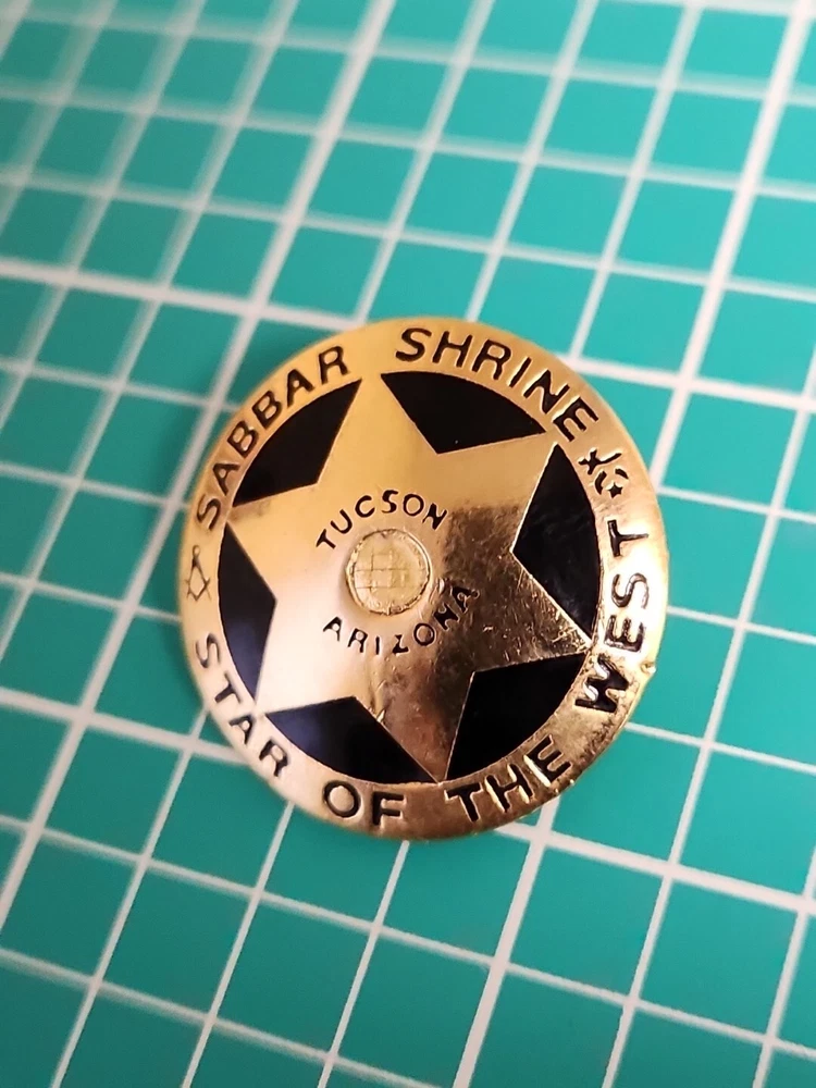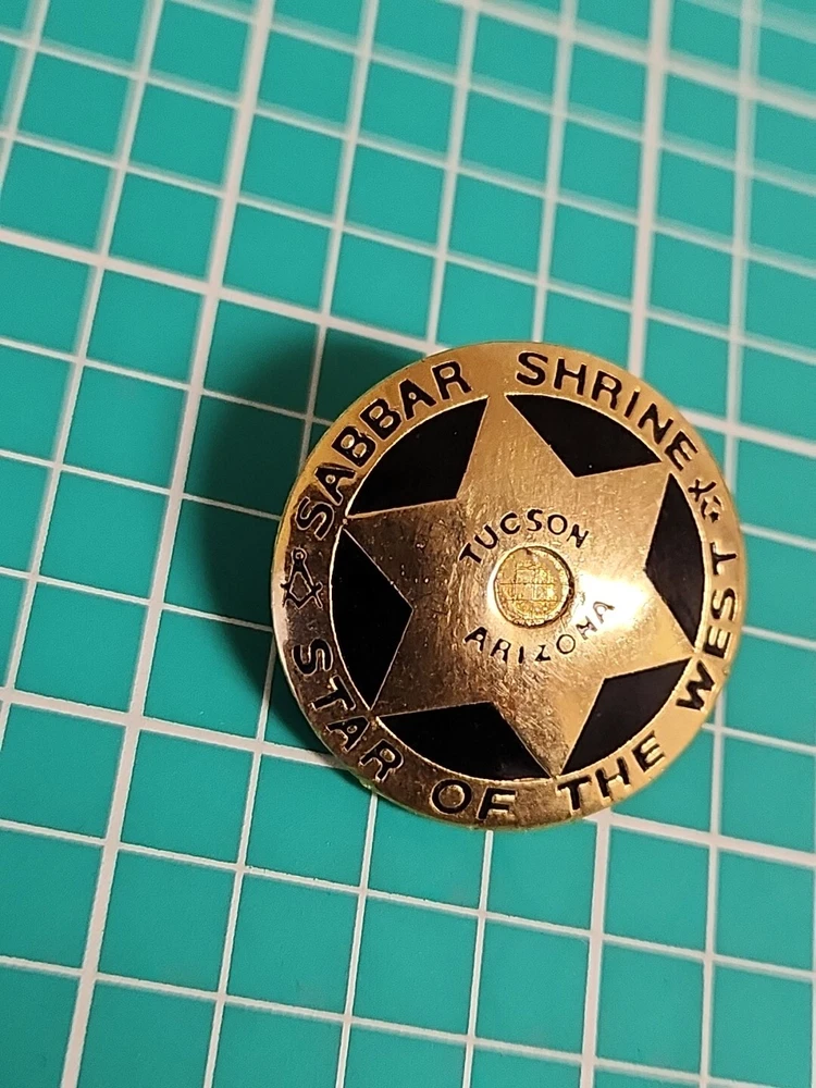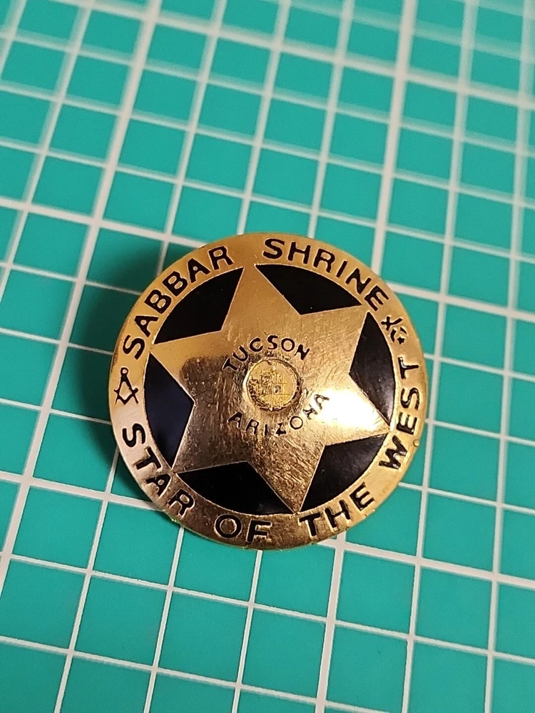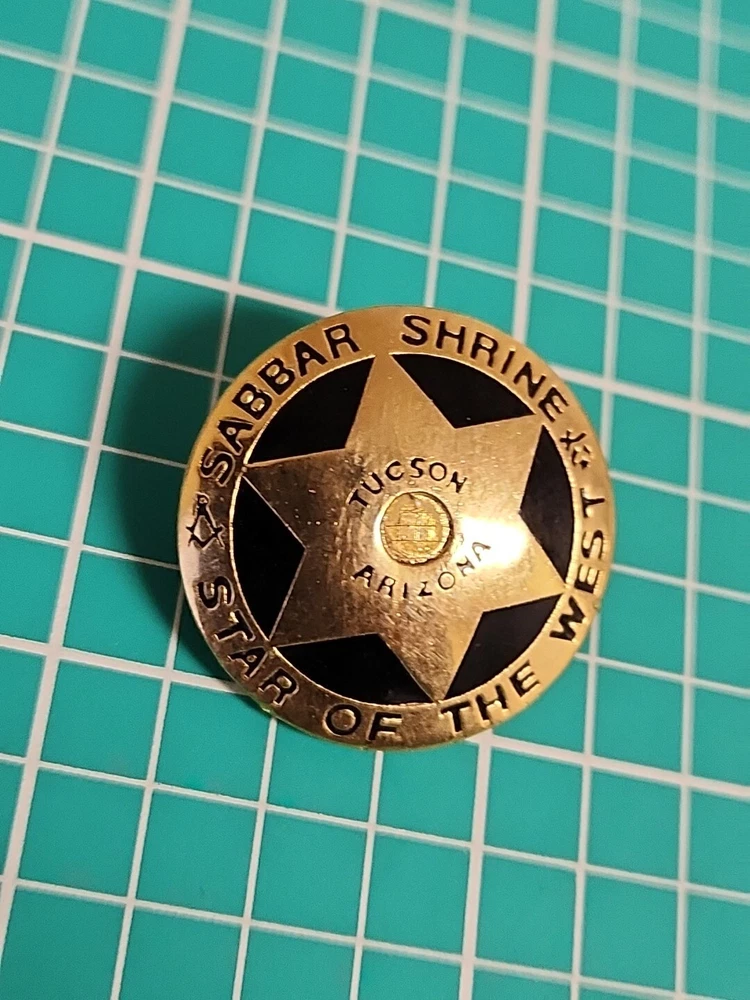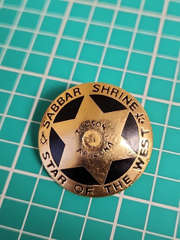This vintage lapel pin is a unique addition to any collection. It features the iconic symbol of the Mason Shriner Sabbar Shrine Star of the West in a beautiful gold tone. Perfect for hats or lapels, this pin is a great way to show your love for the Shrine and its history. The pin is not handmade and is a great find for collectors of pinbacks and other collectible items.