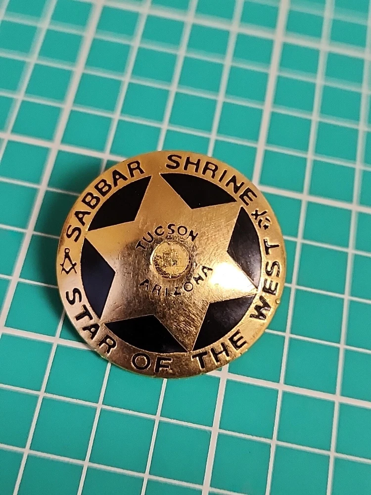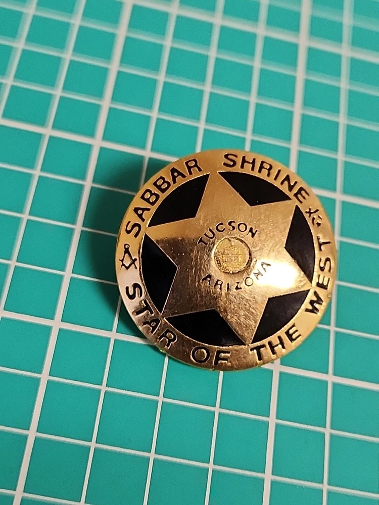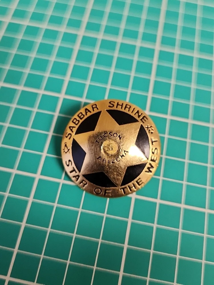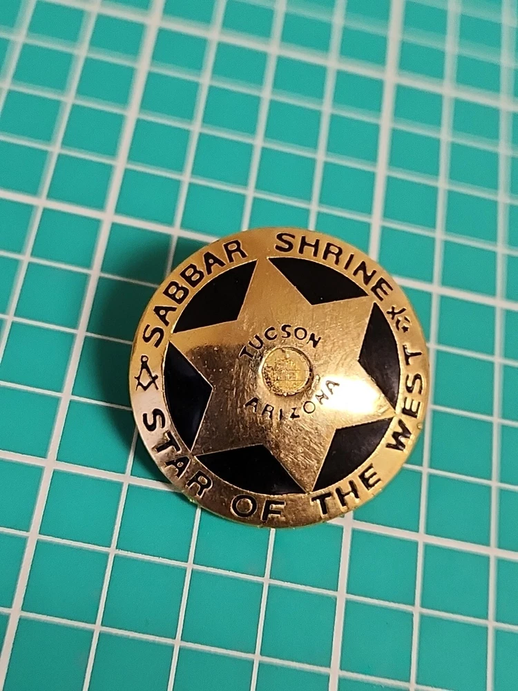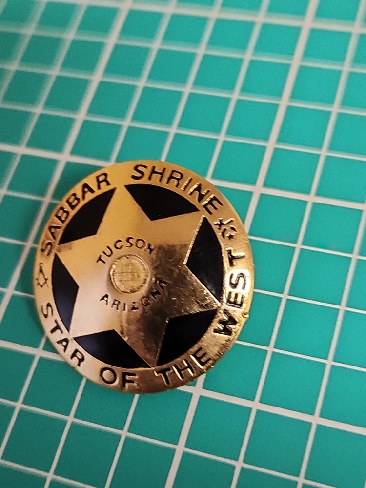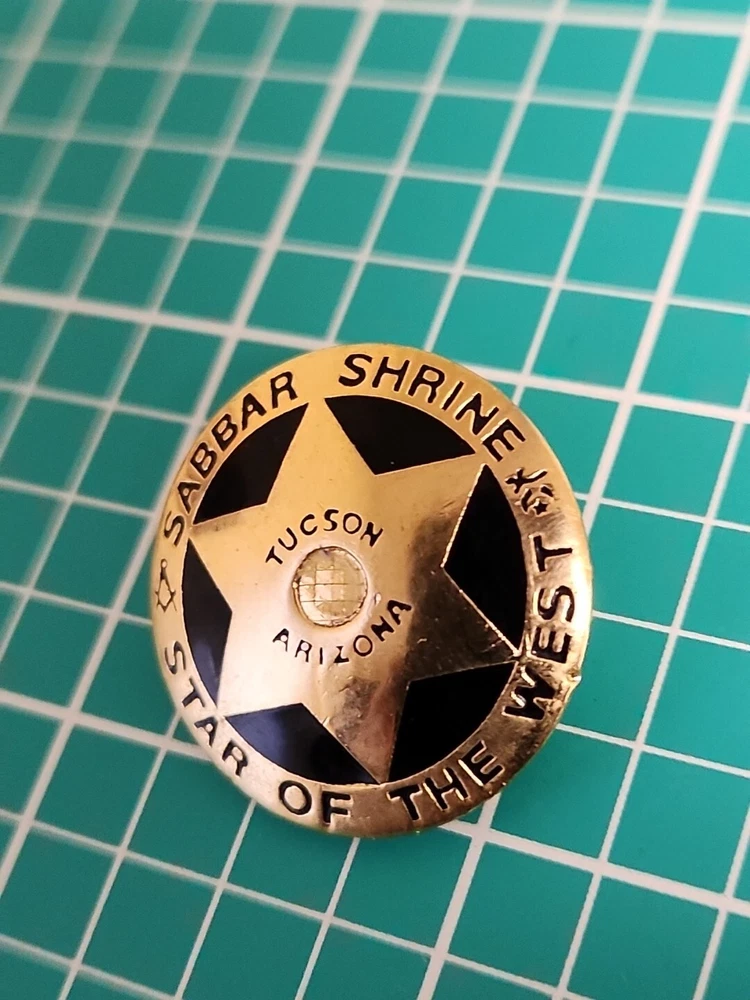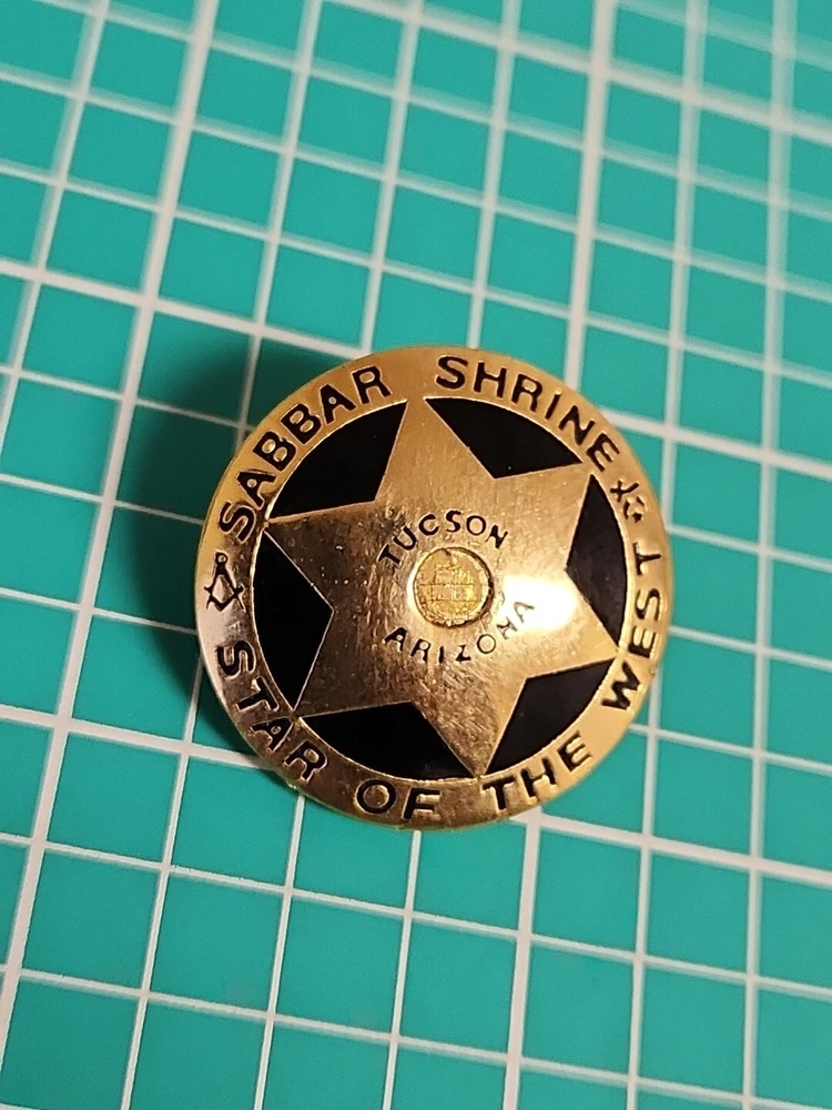 This vintage lapel pin is a unique addition to any collection. It features the iconic symbol of the Mason Shriner Sabbar Shrine Star of the West in a beautiful gold tone. Perfect for hats or lapels, this pin is a great way to show your love for the Shrine and its history. The pin is not handmade and is a great find for collectors of pinbacks and other collectible items.