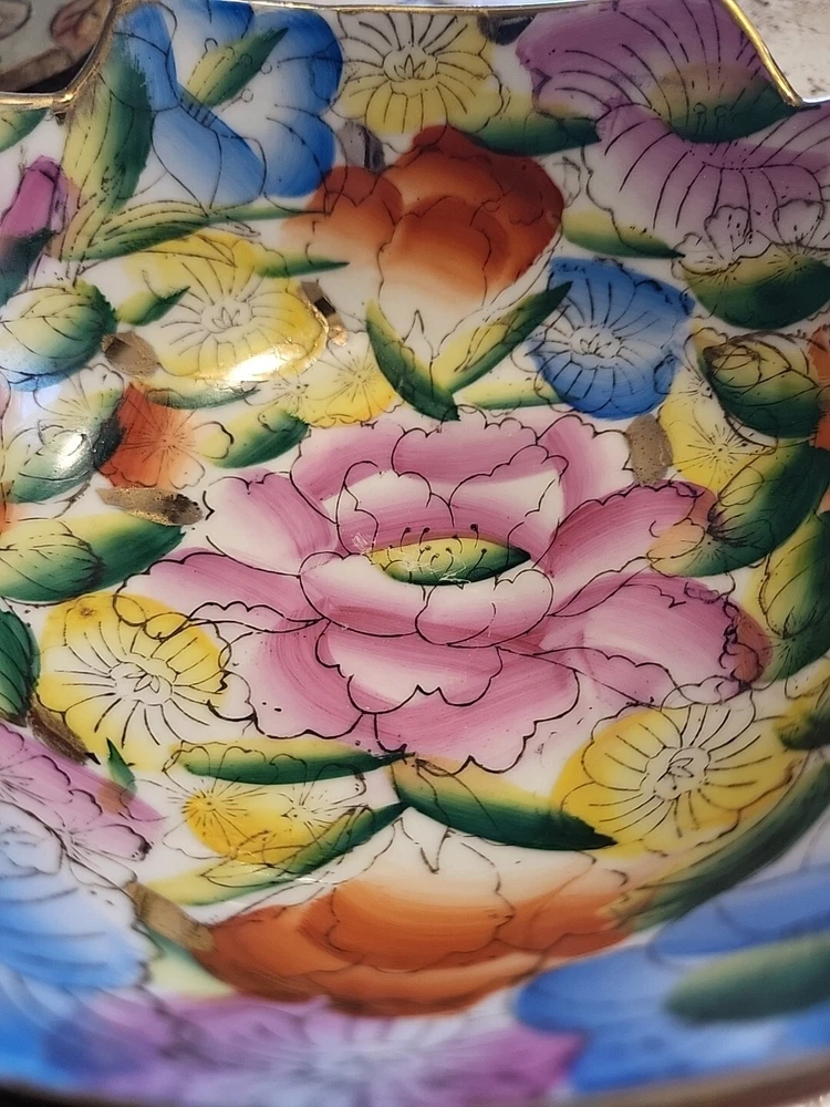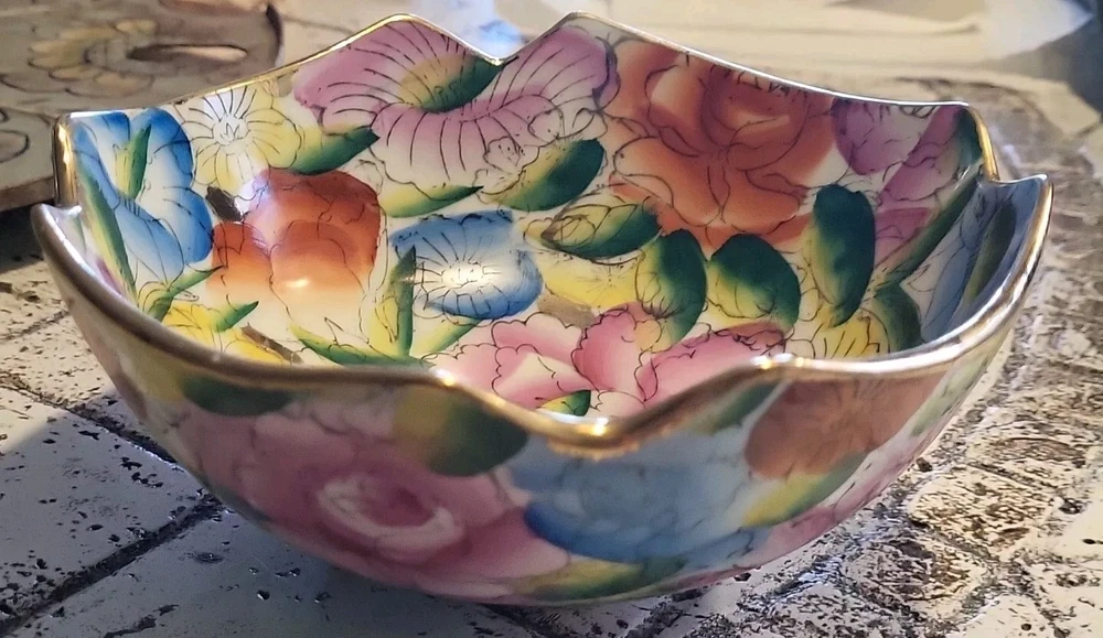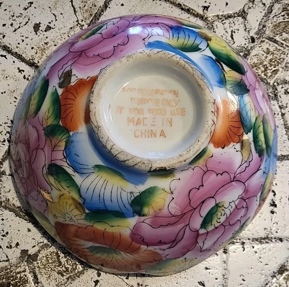 This vintage porcelain bowl is hand-painted with a vintage floral pattern and gold trim, making it a stylish and elegant piece. Made in China in 1940, it features a round shape with a glossy finish, measuring 6 inches in width and 2 inches in depth. This art pottery bowl is for decoration only and showcases an Asian style, perfect for display. The vibrant multicolor floral design adds a touch of charm to this timeless piece. Very colorful. Beautiful. No chips or damage. Very nice for trinkets. See pictures. Needs cleaned.
