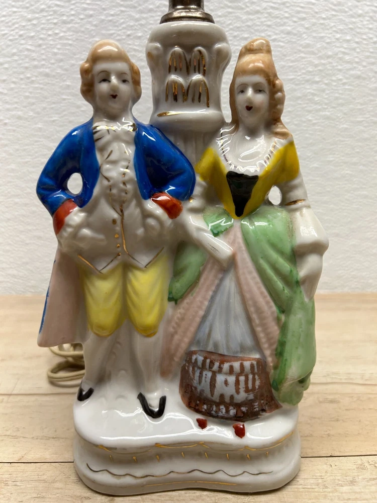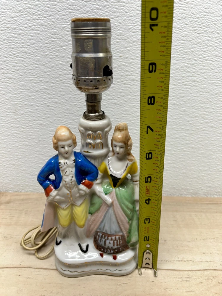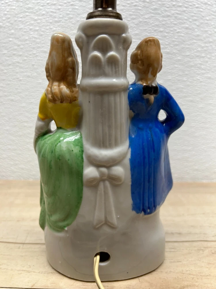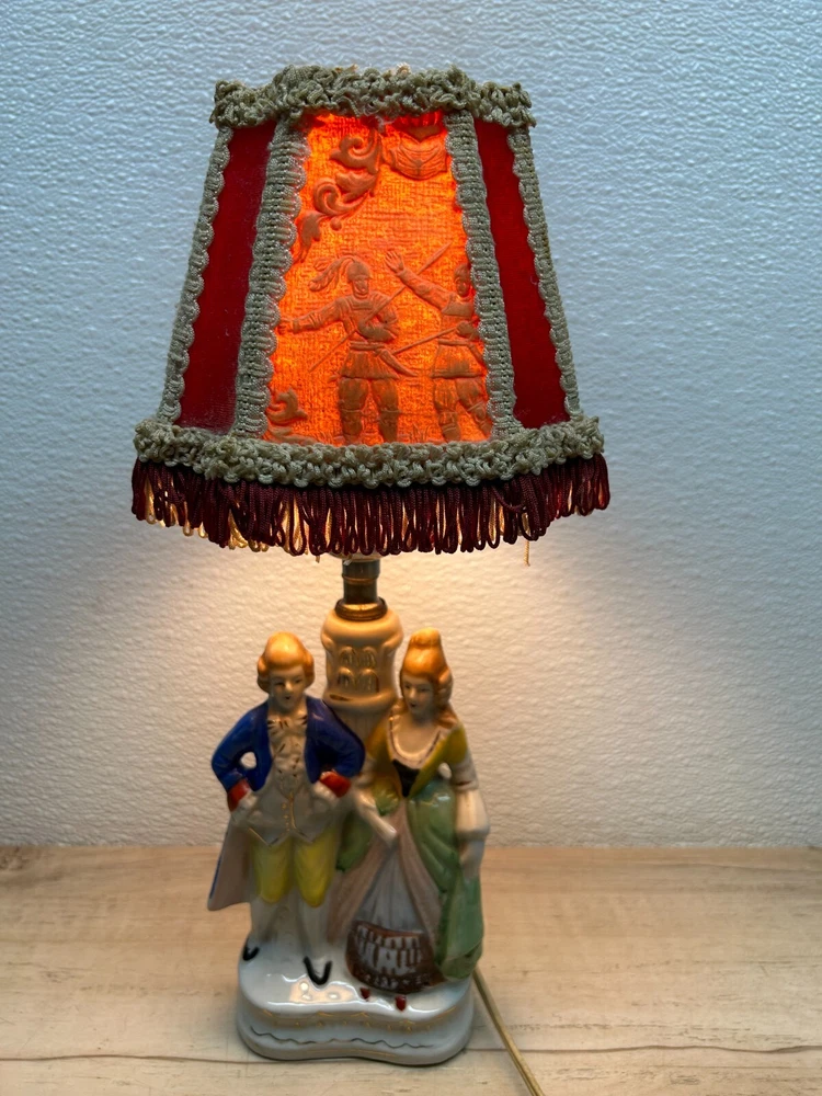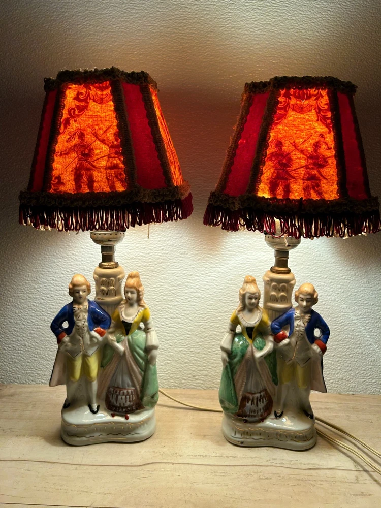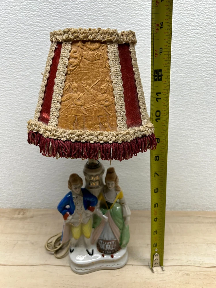 Vtg Porcelain Victorian Couple Night Stand Lamps Set Of 2 Original Shades Japan.The lamp shades are paper with 3D effect.The shades have signs of age and use.One of the shades have paper damage on one side-PLEASE see all pictures for details.Bulbs are NOT included