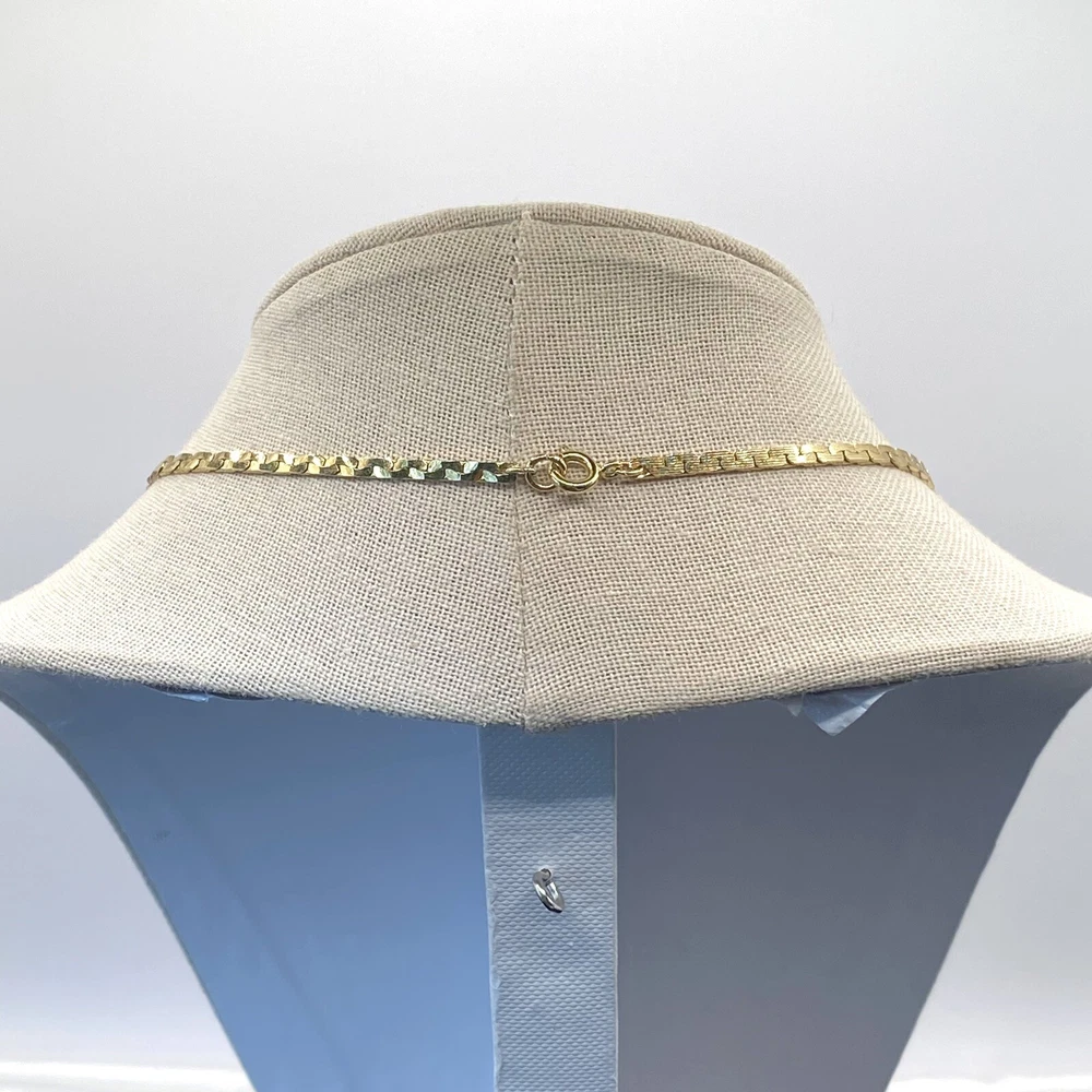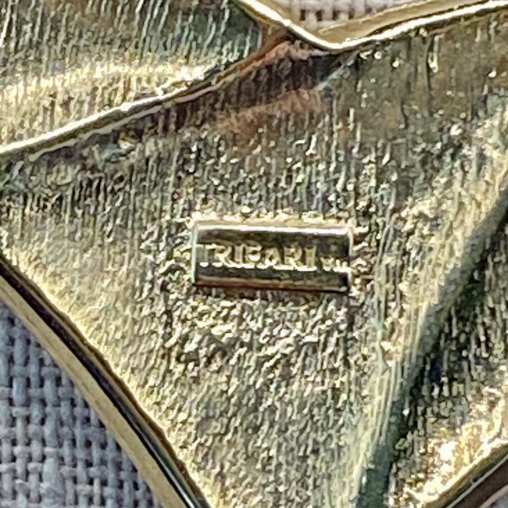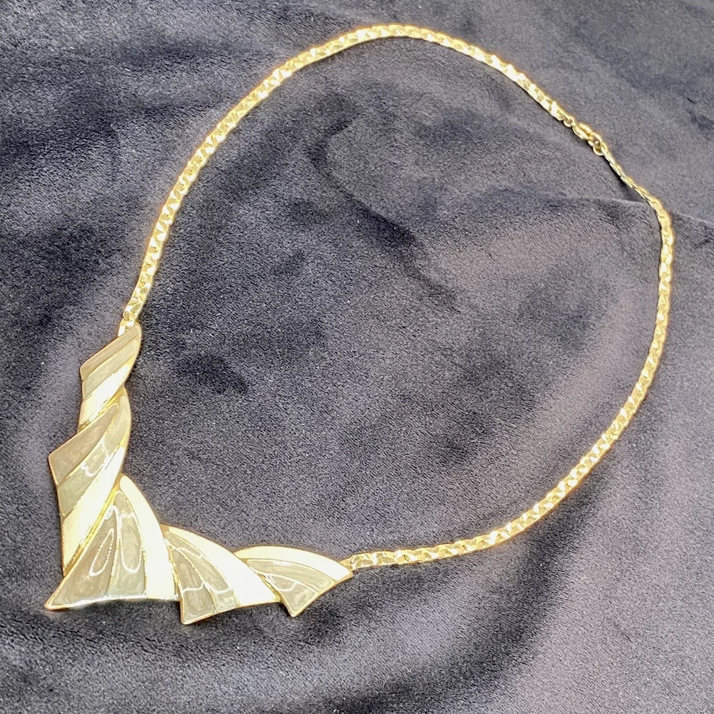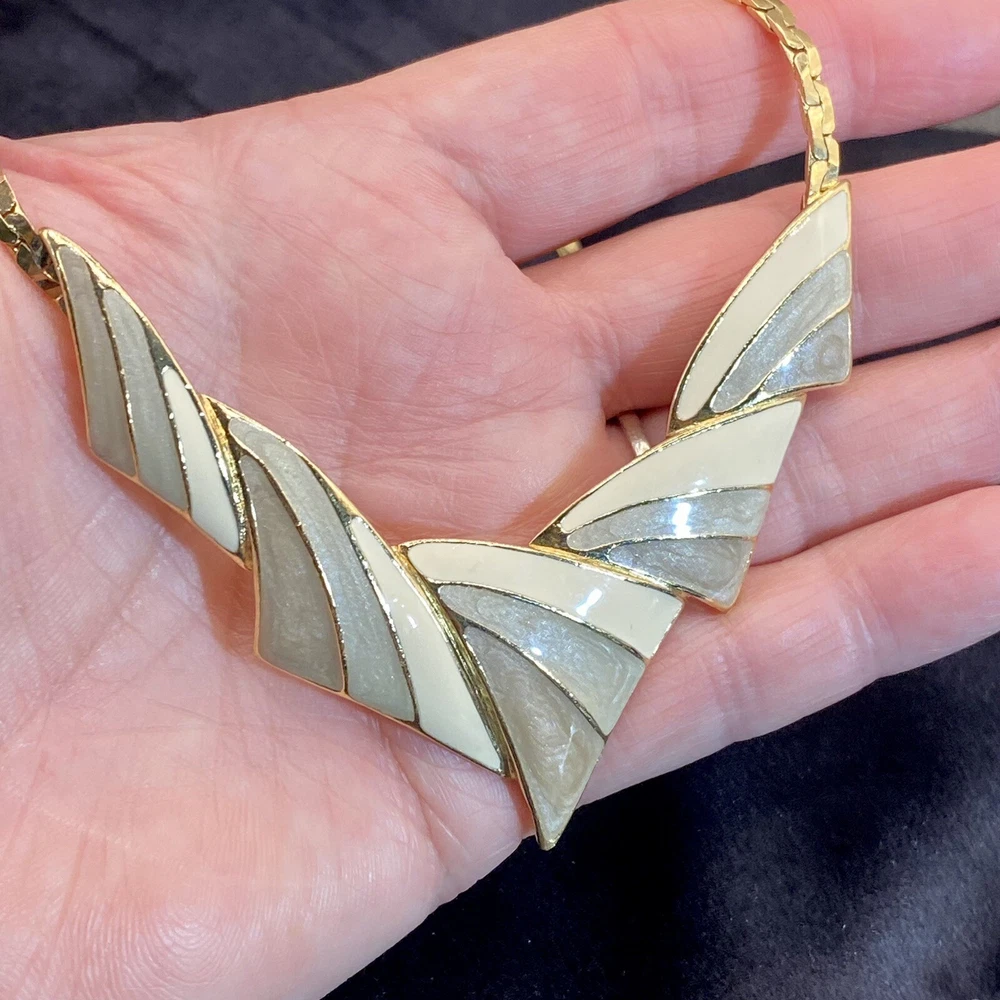 Add a touch of vintage beauty to your outfit with this rare Trifari necklace. The gold-tone metal necklace features a unique triangle-shaped pendant with a stunning eye-clean gemstone clarity grade. The pendant is spring-ring closed and hangs on an 18-inch chain with a spring-ring closure. The necklace is perfect for any occasion, including engagement, wedding, anniversary, graduation, birthdays, Father's Day, Mother's Day, Christmas, and Valentine's Day. The necklace is also customizable, making it a great gift for your loved ones. This one-of-a-kind necklace is signed by the renowned Trifari brand. The necklace is a perfect addition to any fashion jewelry collection. The pendant is made of metal and has a beautiful gold cream, gray, and green color. The necklace is an original piece, and it is not customized. The necklace is perfect for anyone who loves beauty, art, family and friends, and travel and places. Vintage Trifari GoldTone Enamel Necklace Choker Bib Tri Color Estate Statement Z This is a pre-owned piece. It may require cleaning. There may be scratching, fading, chips, normal wear, missing stones, etc… See Photos. If you have any questions, please feel free to contact me via eBay messaging. Thank you for stopping by. Make sure to check out other items in my store. Your satisfaction is my priority. Have a wonderful blessed day!