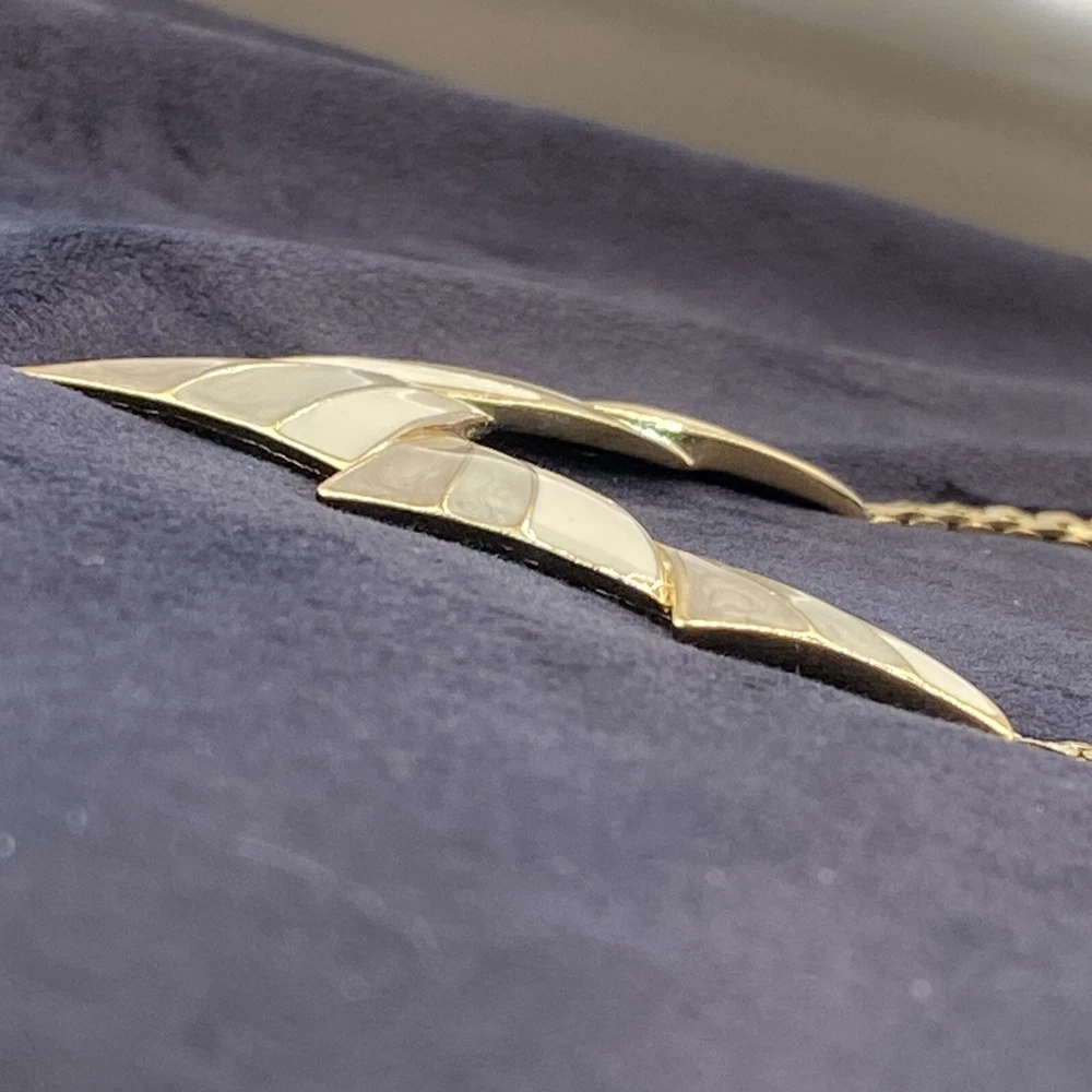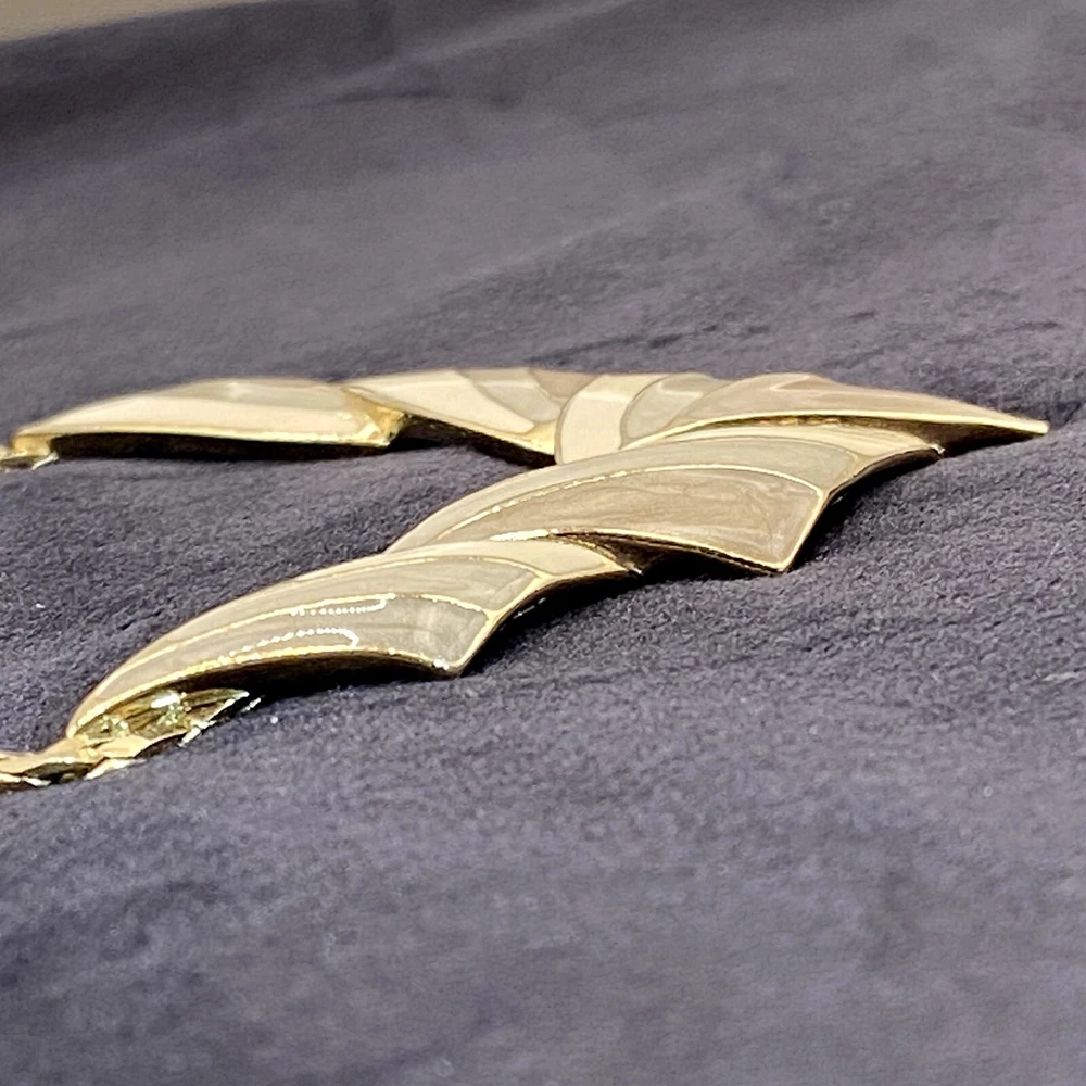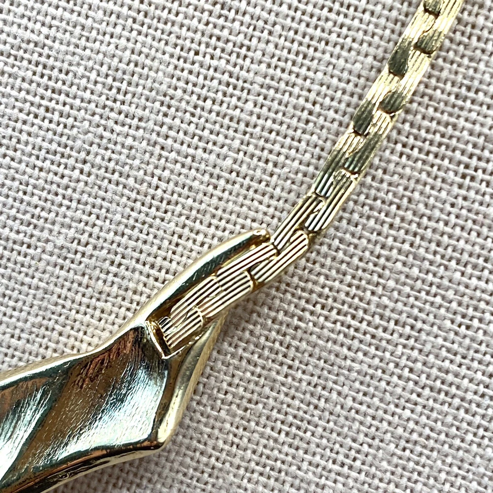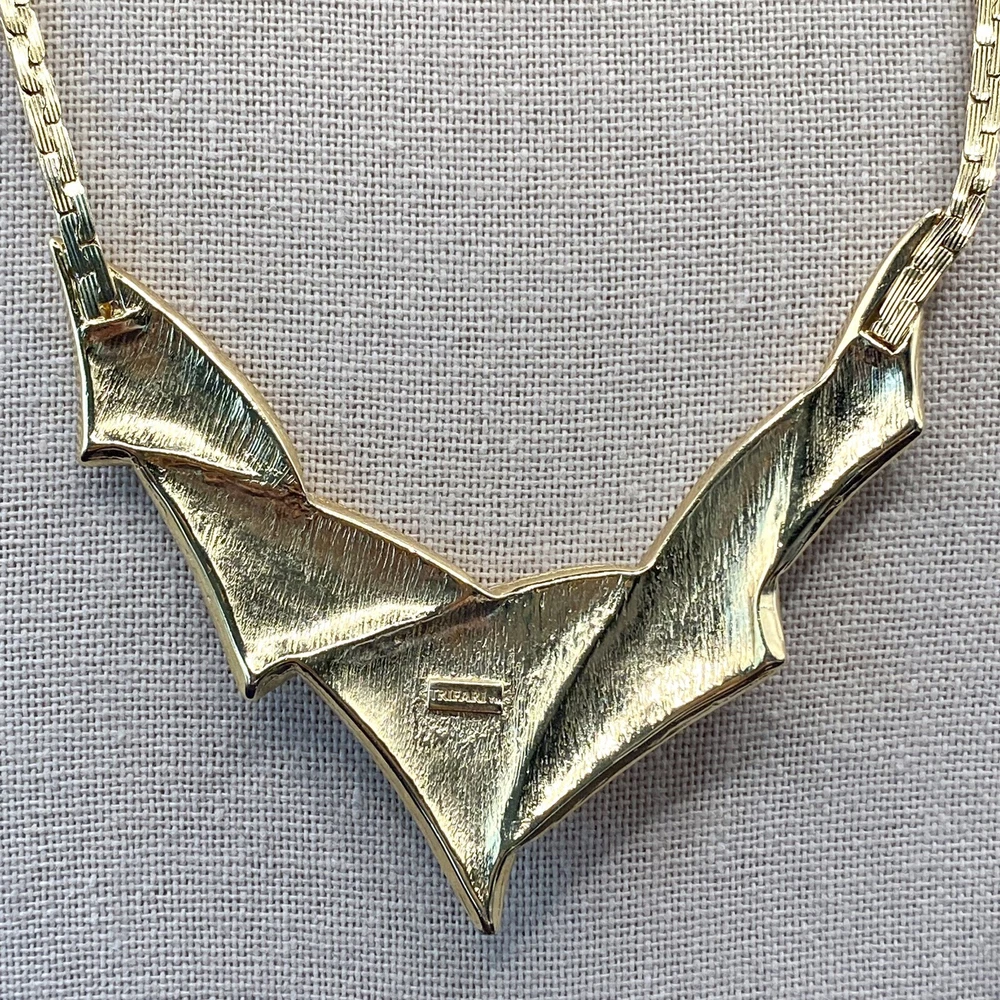 Add a touch of vintage beauty to your outfit with this rare Trifari necklace. The gold-tone metal necklace features a unique triangle-shaped pendant with a stunning eye-clean gemstone clarity grade. The pendant is spring-ring closed and hangs on an 18-inch chain with a spring-ring closure. The necklace is perfect for any occasion, including engagement, wedding, anniversary, graduation, birthdays, Father's Day, Mother's Day, Christmas, and Valentine's Day. The necklace is also customizable, making it a great gift for your loved ones. This one-of-a-kind necklace is signed by the renowned Trifari brand. The necklace is a perfect addition to any fashion jewelry collection. The pendant is made of metal and has a beautiful gold cream, gray, and green color. The necklace is an original piece, and it is not customized. The necklace is perfect for anyone who loves beauty, art, family and friends, and travel and places. Vintage Trifari GoldTone Enamel Necklace Choker Bib Tri Color Estate Statement Z This is a pre-owned piece. It may require cleaning. There may be scratching, fading, chips, normal wear, missing stones, etc… See Photos. If you have any questions, please feel free to contact me via eBay messaging. Thank you for stopping by. Make sure to check out other items in my store. Your satisfaction is my priority. Have a wonderful blessed day!