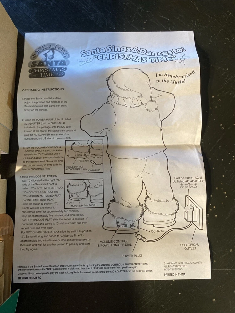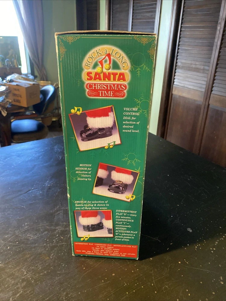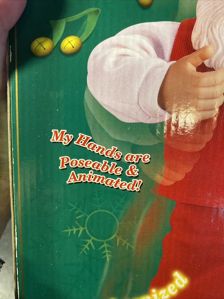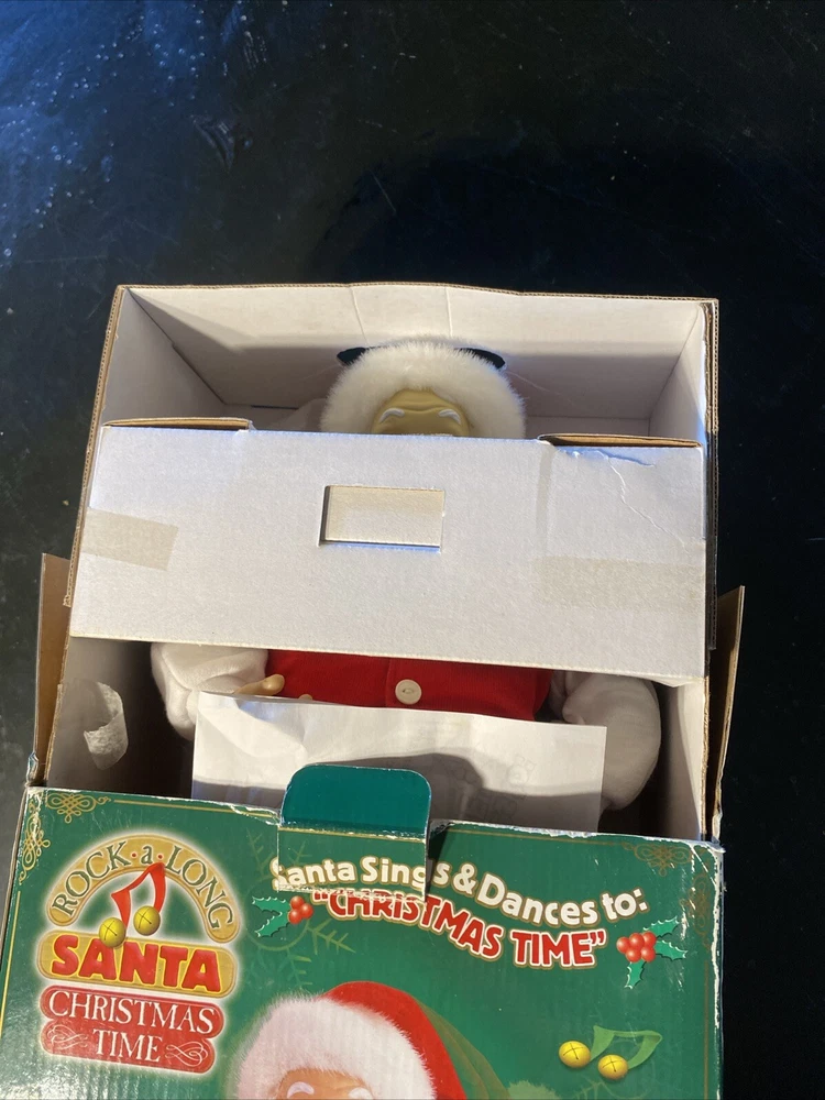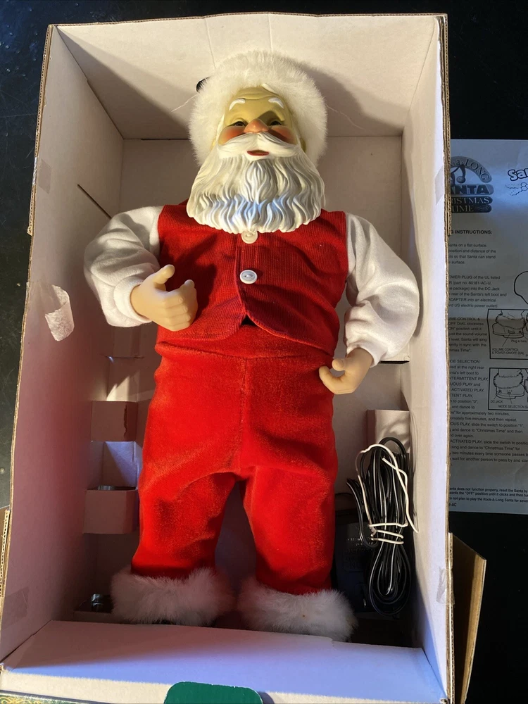 New old stock. Never taken out of box or used. Original box does show wear, however. Please see pics carefully. 1999 animated Santa. Sings and dances to “Christmas time”. Hand head and hips rock to the music. Hands or opposable and animated. Great new condition. Ships the next business day after payment.😊