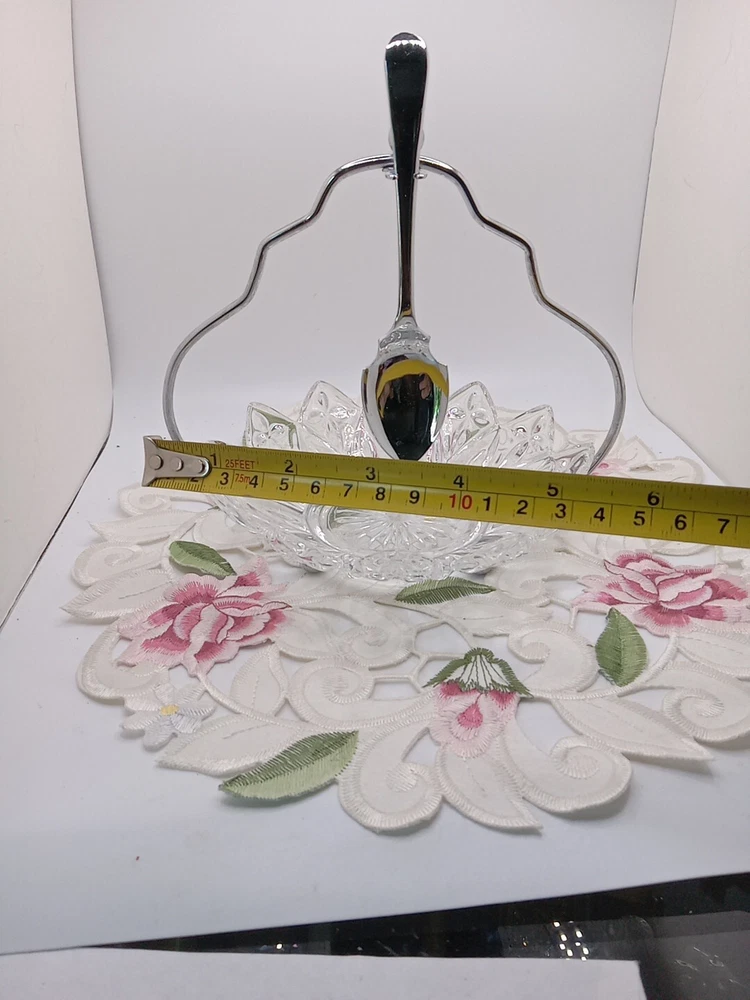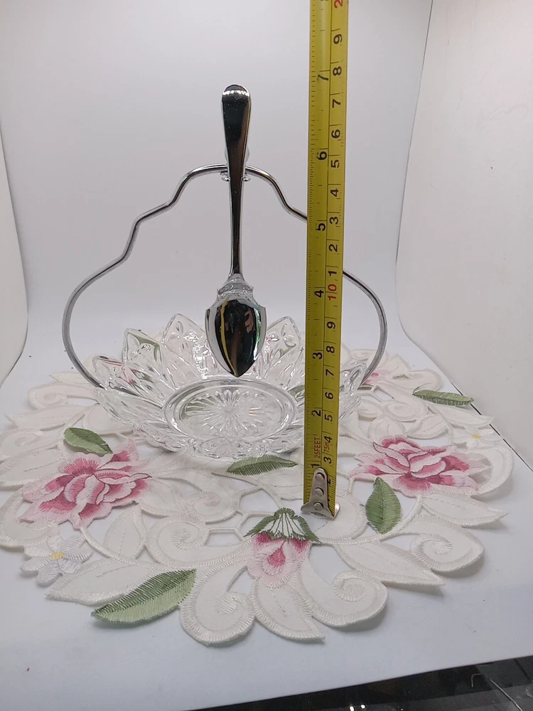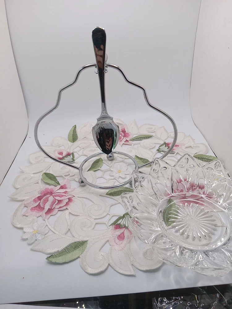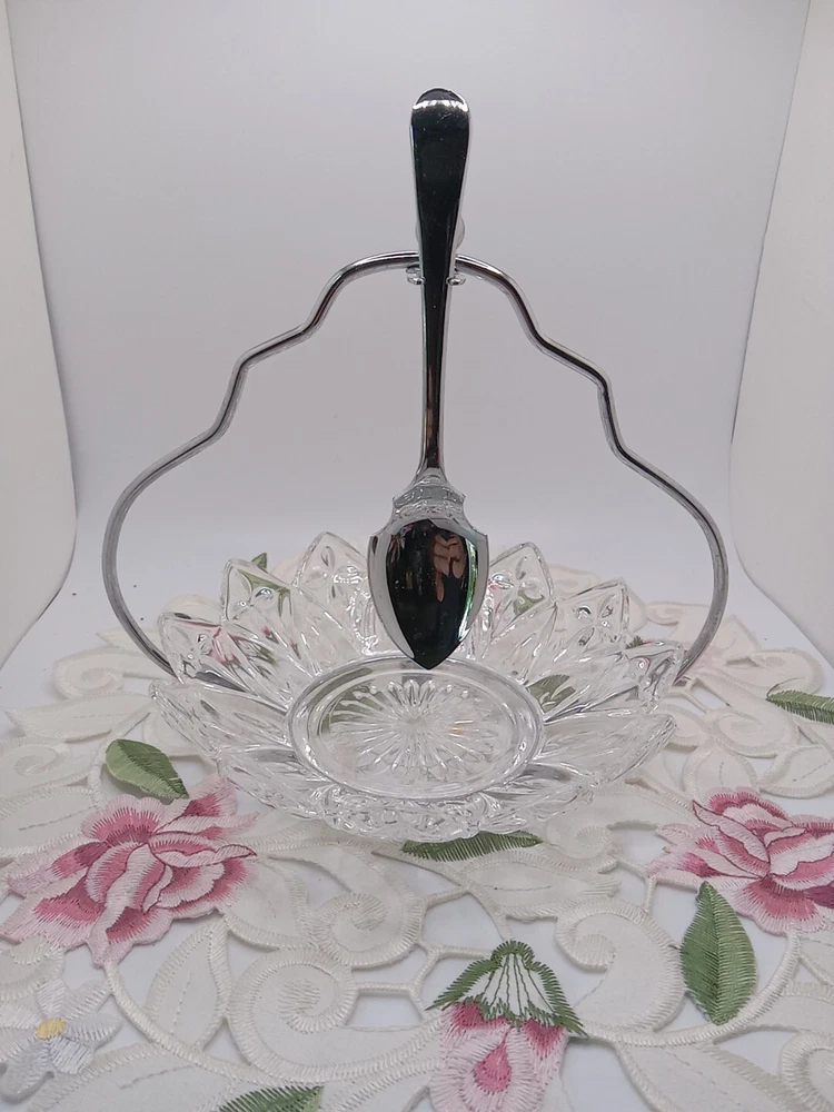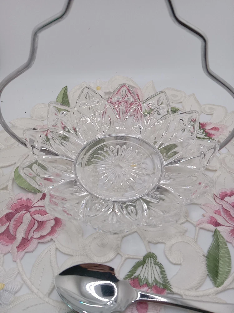 This vintage Sheffield serving set is the perfect addition to any kitchen or dining room. The set includes a glass dish, chrome stand, and spoon holder, all in a charming pair shape. The clear glass dish has one compartment and measures 6 inches in diameter, while the stand and spoon holder are both stylish and functional. The set is perfect for all occasions and is sure to impress your guests with its retro 1950s style. The shiny finish and sleek design make it a great addition to any collection, and it is easy to fill with your favorite jams or relishes. This original Sheffield No. 305C set is unboxed and was manufactured in the United Kingdom, adding to its unique and authentic design. Please see my other auctions for my other thrift store finds.