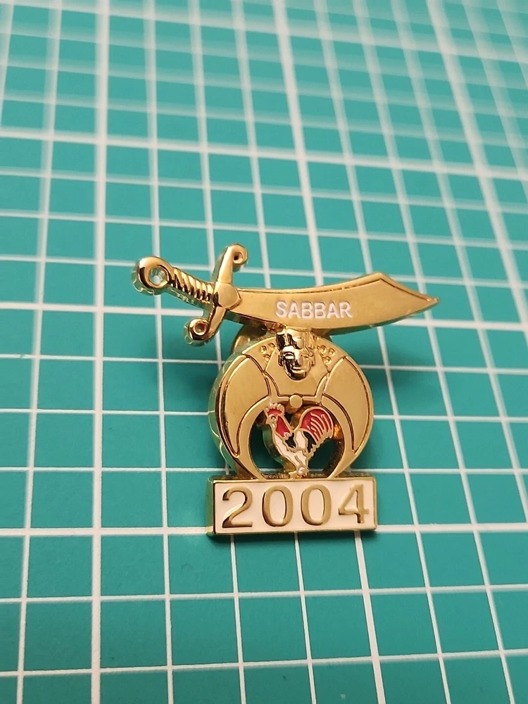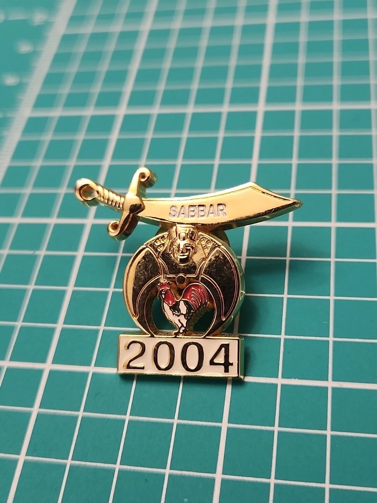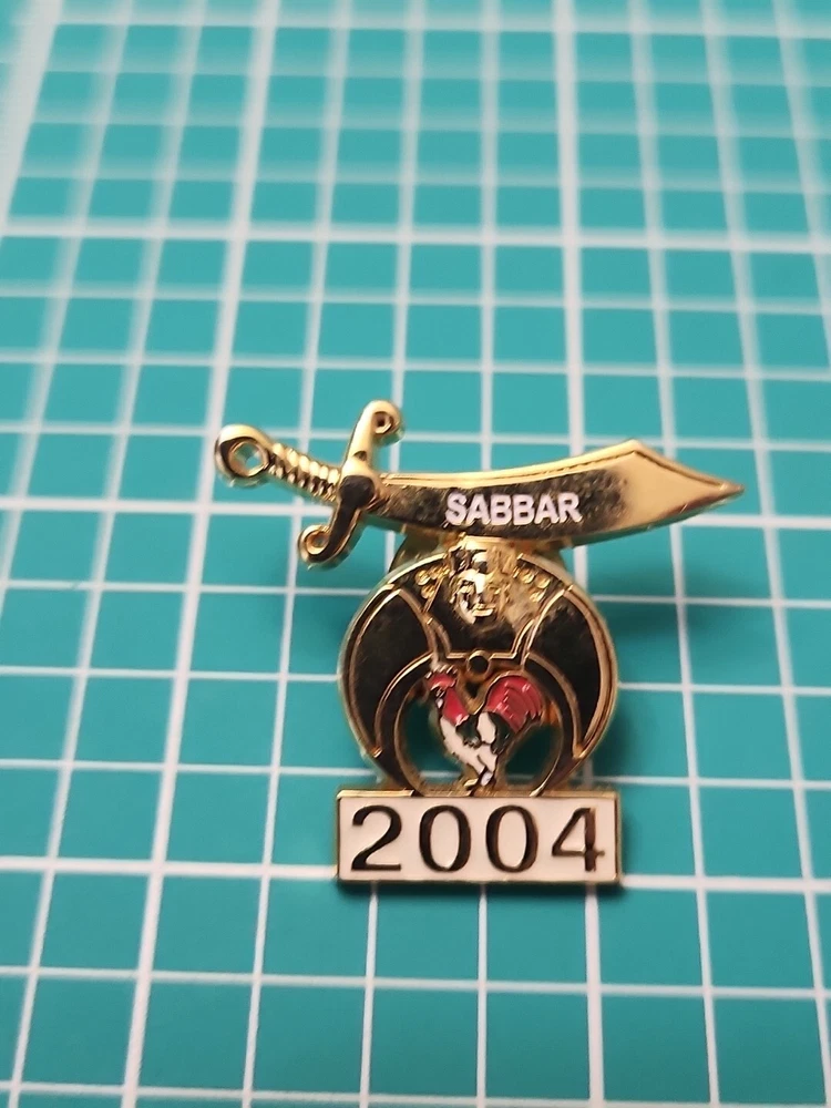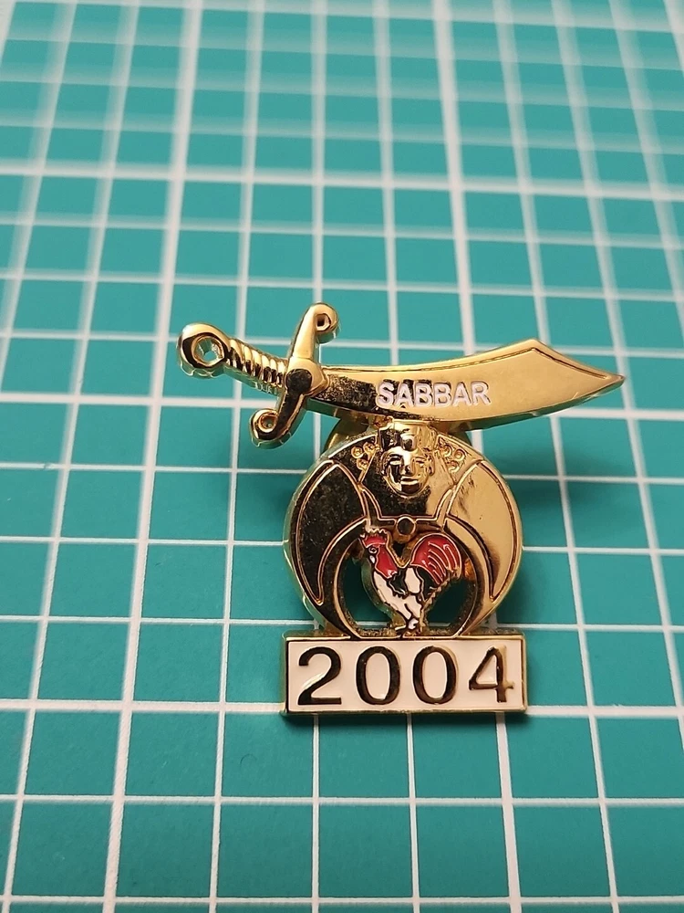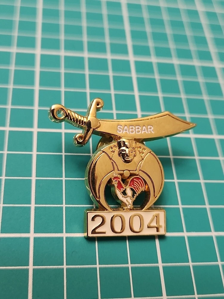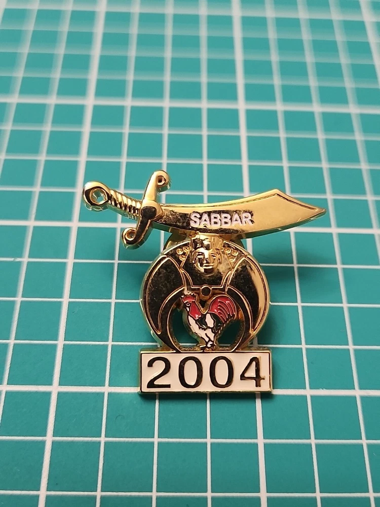 This vintage Shriner Sabbar Temple lapel pin is a perfect addition to any collection. With a beautiful gold tone finish, it is sure to catch the eye. The pin features the emblem of the temple and the year 2004, making it a unique piece of memorabilia. Ideal for hat or lapel, this pin will add a touch of elegance to any outfit.