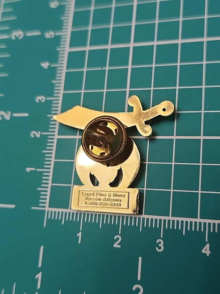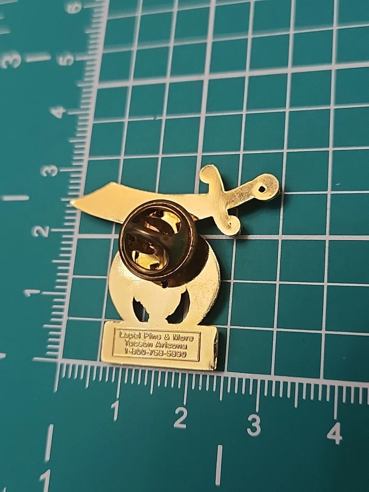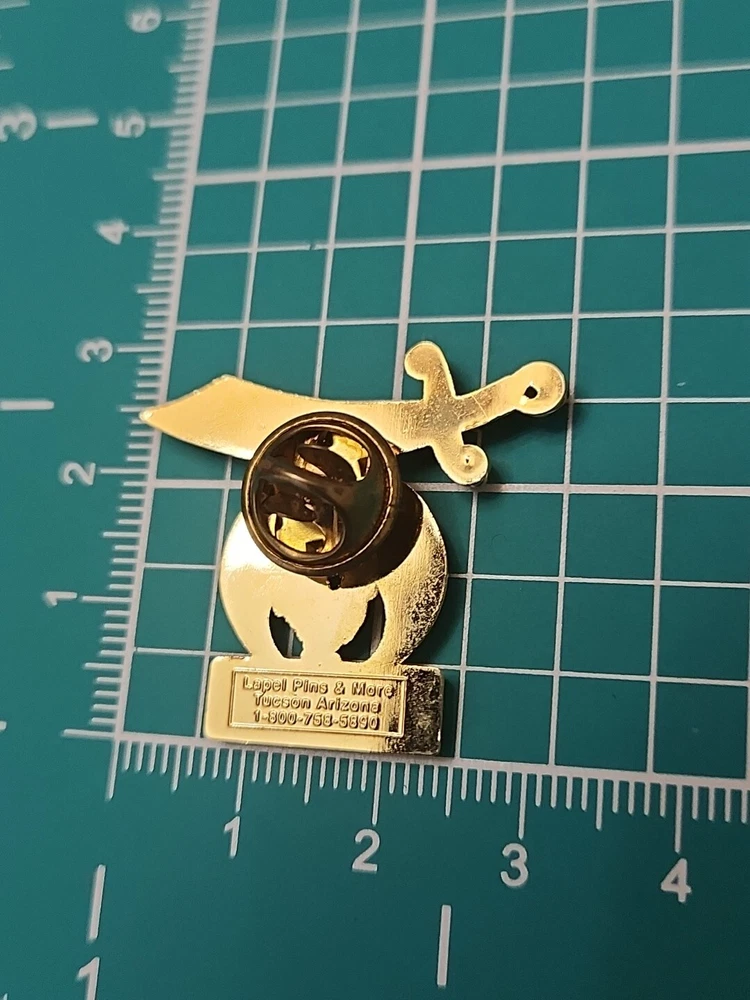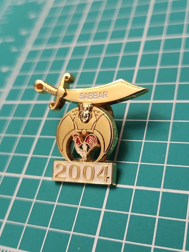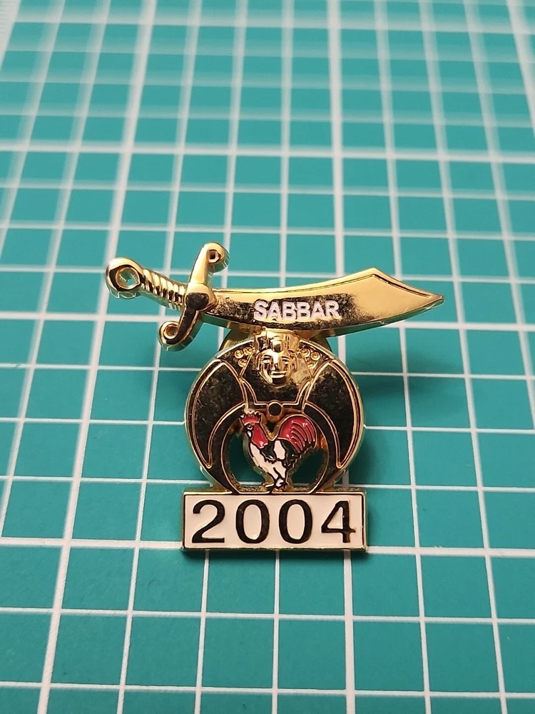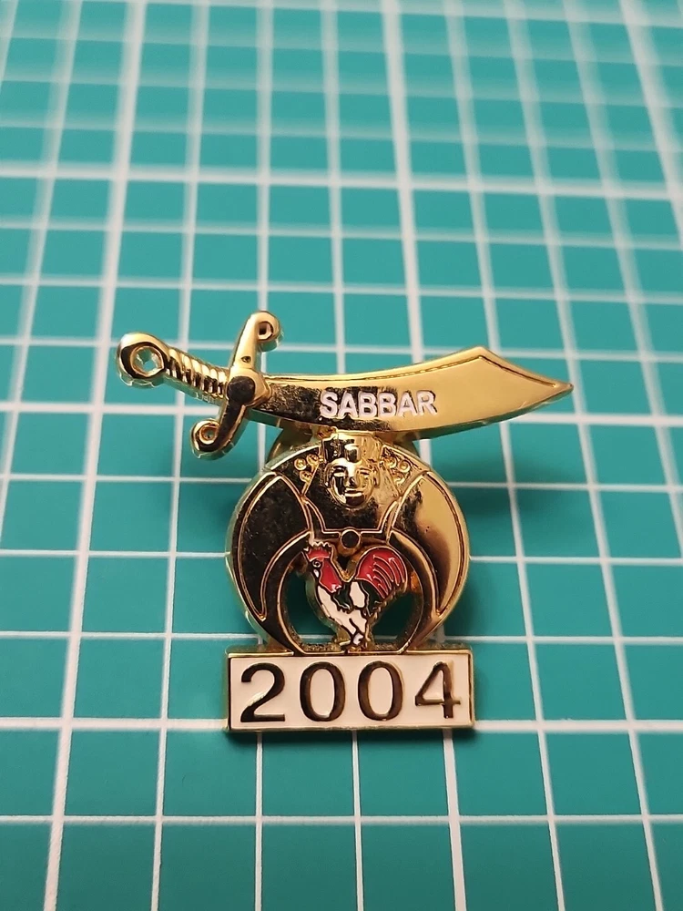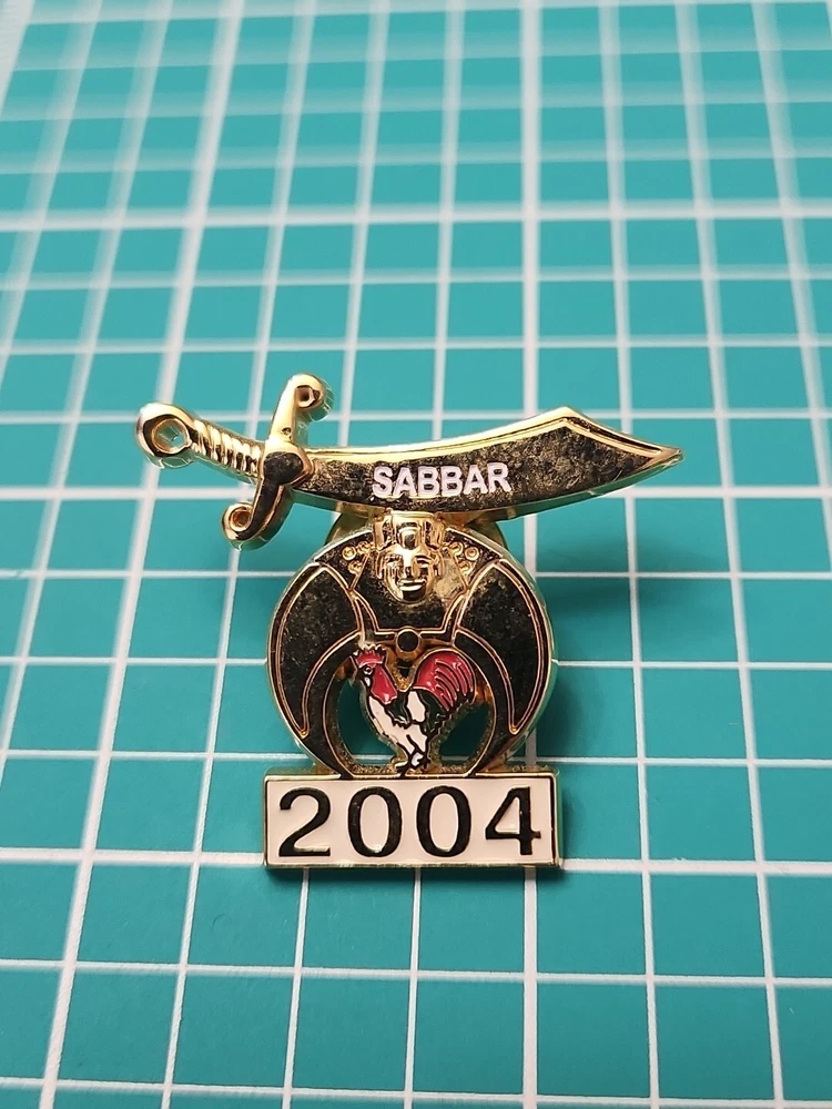 This vintage Shriner Sabbar Temple lapel pin is a perfect addition to any collection. With a beautiful gold tone finish, it is sure to catch the eye. The pin features the emblem of the temple and the year 2004, making it a unique piece of memorabilia. Ideal for hat or lapel, this pin will add a touch of elegance to any outfit.