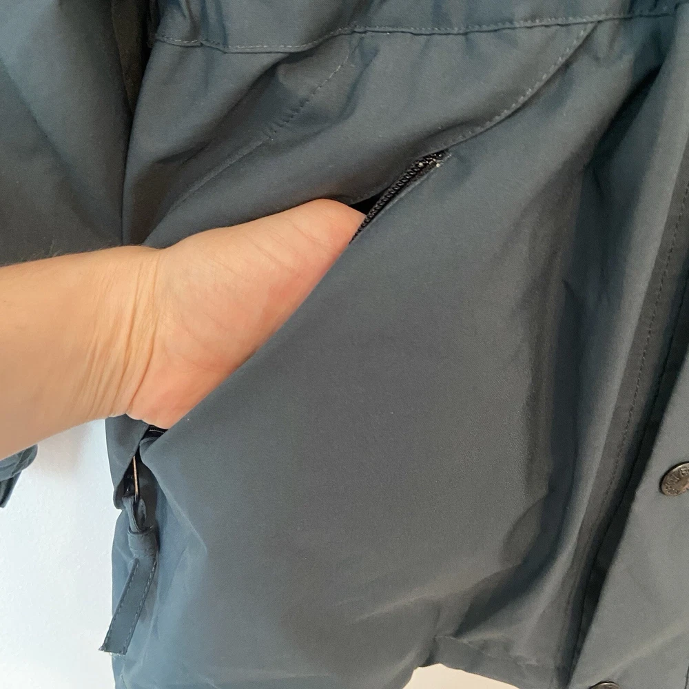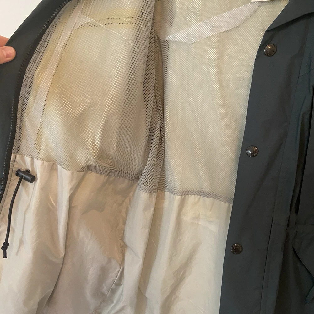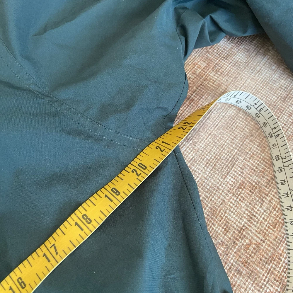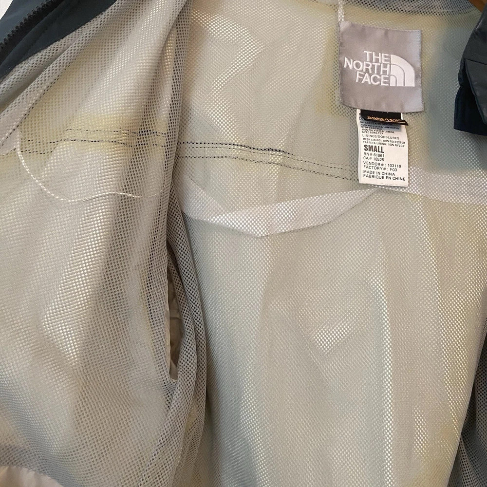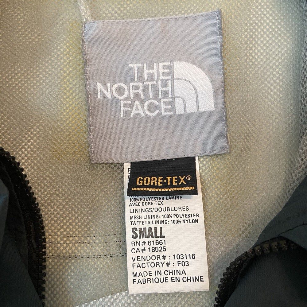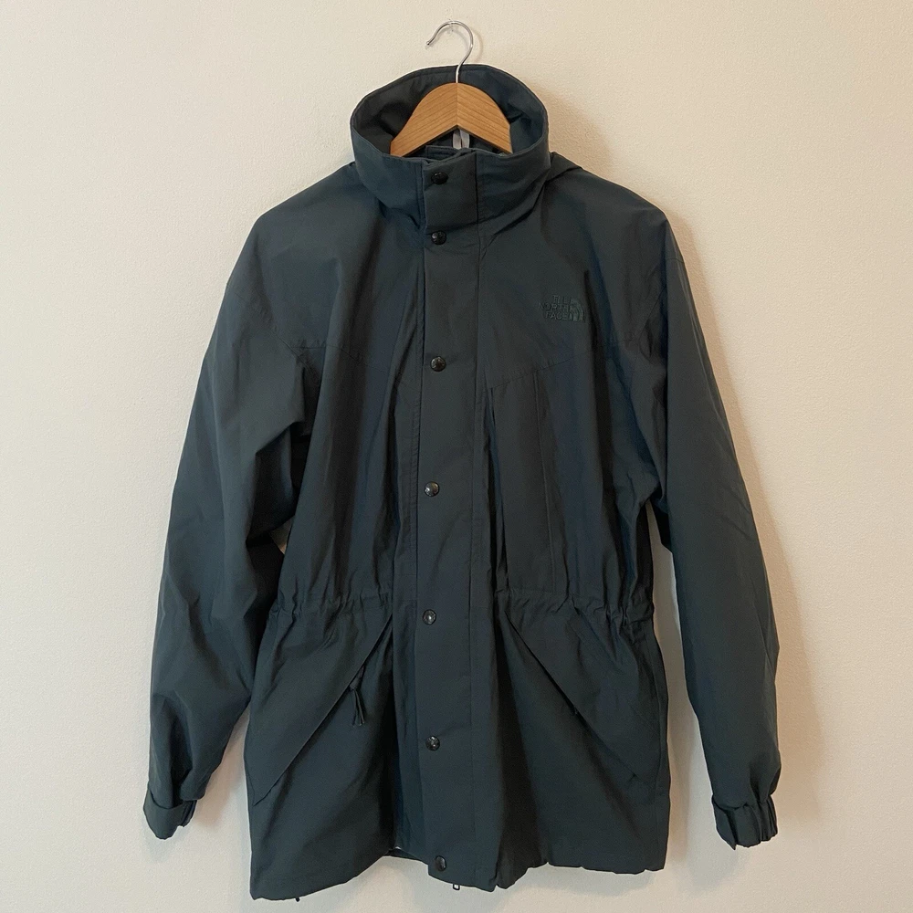Vtg The North Face Rain Jacket Small Approx 21” pit to pit Approx 30” shoulder to hem Dark Green Gortex Parka with Hood, Full Zip, Button Front, cinch waist, zip pockets, hook and loop wrist closure Preowned Condition: exterior is clean with no known flaws, interior has some yellowing to lining due to aging. Also the vinyl strip covering the interior thread seams has started to come off (see photos) but the structural integrity of the jacket is intact. Ships from smoke and pet free environment