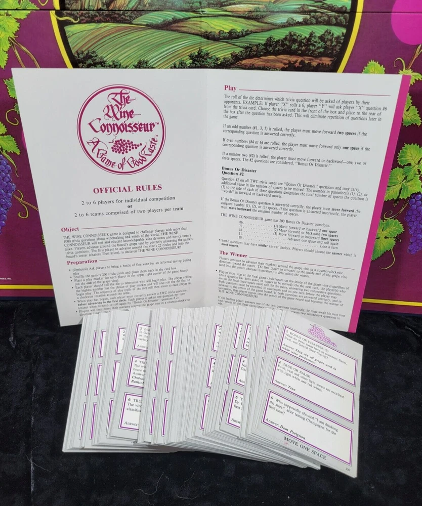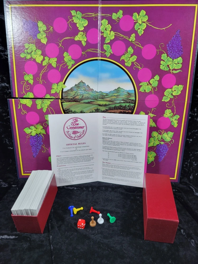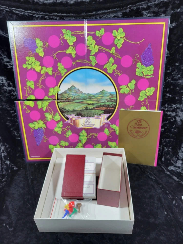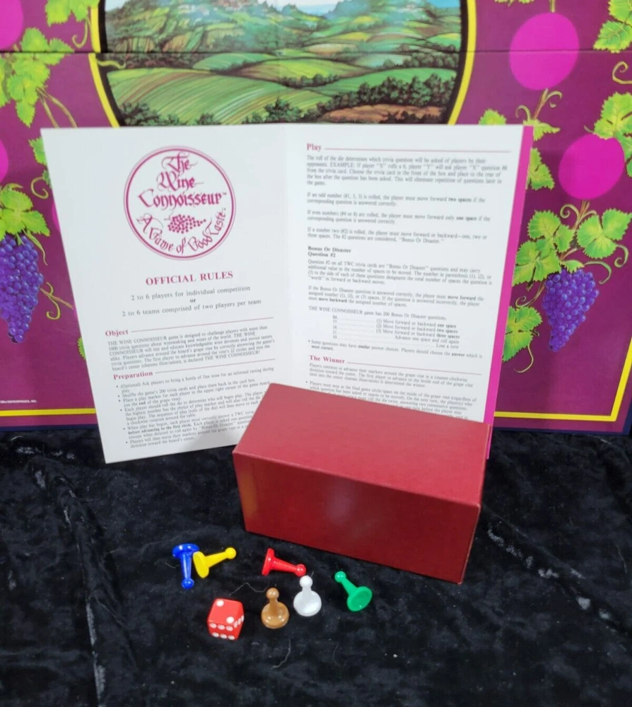 Vintage The Wine Connoisseur - A Game of Good Taste - Board Game The Wine Connoisseur game is designed to challenge players with more than 1000 trivia questions about winemaking and wines of the world. The box is 10 1/4 in x 10 1/4 in x 3 in Each item is carefully packaged to prevent any damage and is shipped immediately with tracking.
