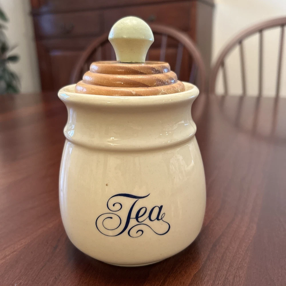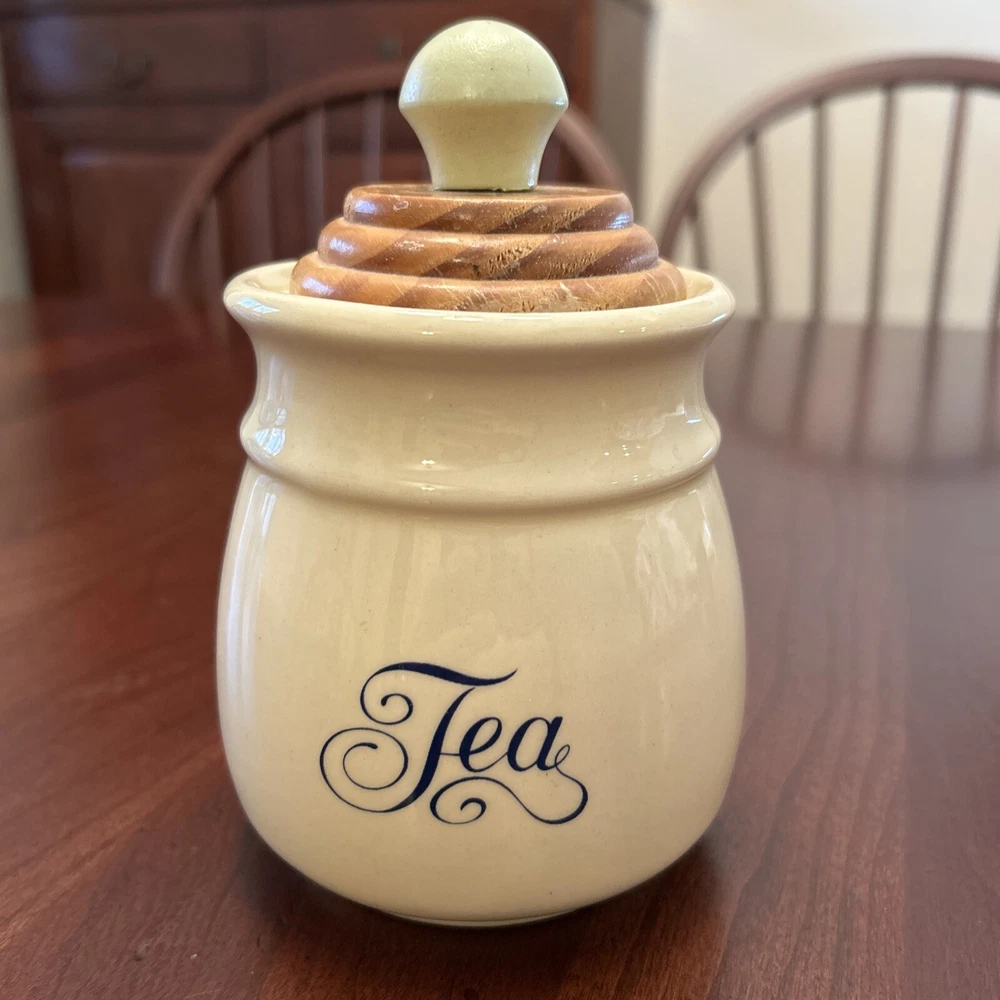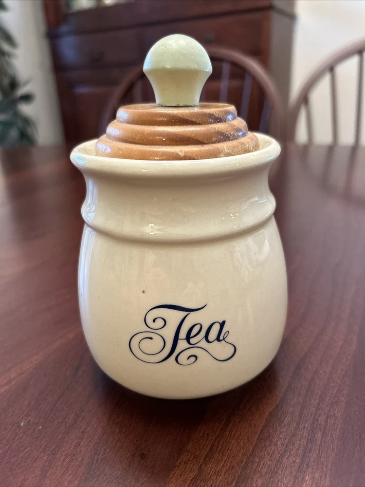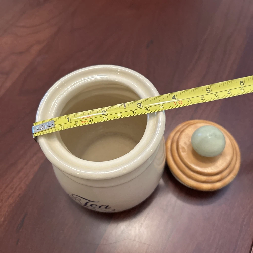 Vtg Towle National Housewares Tea Canister Wooden Top Ivory Farmhouse Cottagecore This vintage ceramic tea canister from Towle's National Housewares collection is the perfect addition to any farmhouse-style kitchen. The ivory and brown script color and wooden lid with a pale green knob give it a rustic, charming look that's sure to catch the eye of collectors and guests alike. Measuring 5 inches in height and 3 inches in width, it's the ideal size for storing your favorite tea blends or other kitchen essentials. The canister is a single item in the set and comes with a lid. Its style is farmhouse vintage, with a country theme that's perfect for collectors and enthusiasts of all kinds. Whether you're looking to add to your collection or just want a unique piece to display in your kitchen, this Towle tea canister is sure to impress. Pale Pastel Green Knob