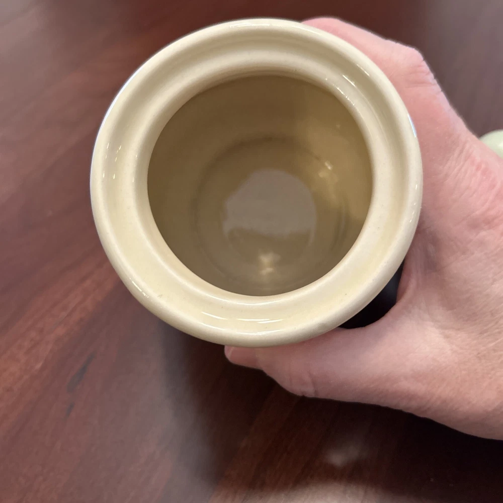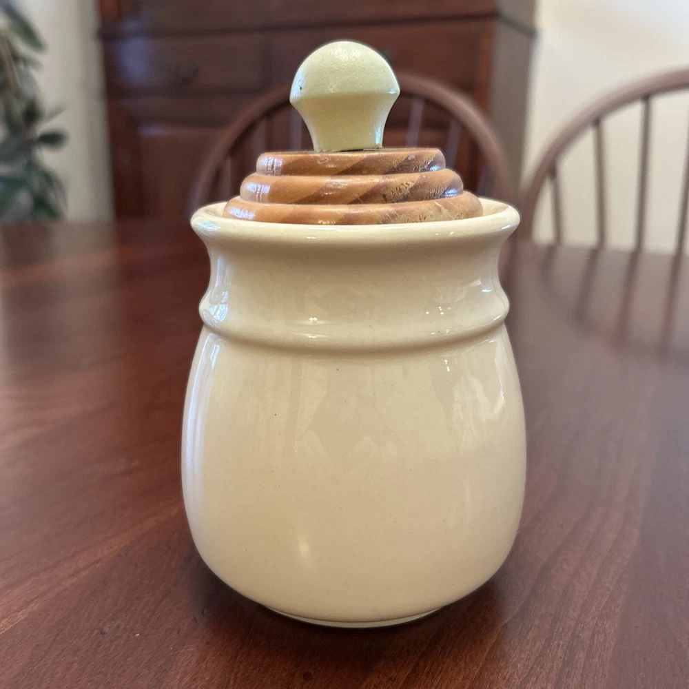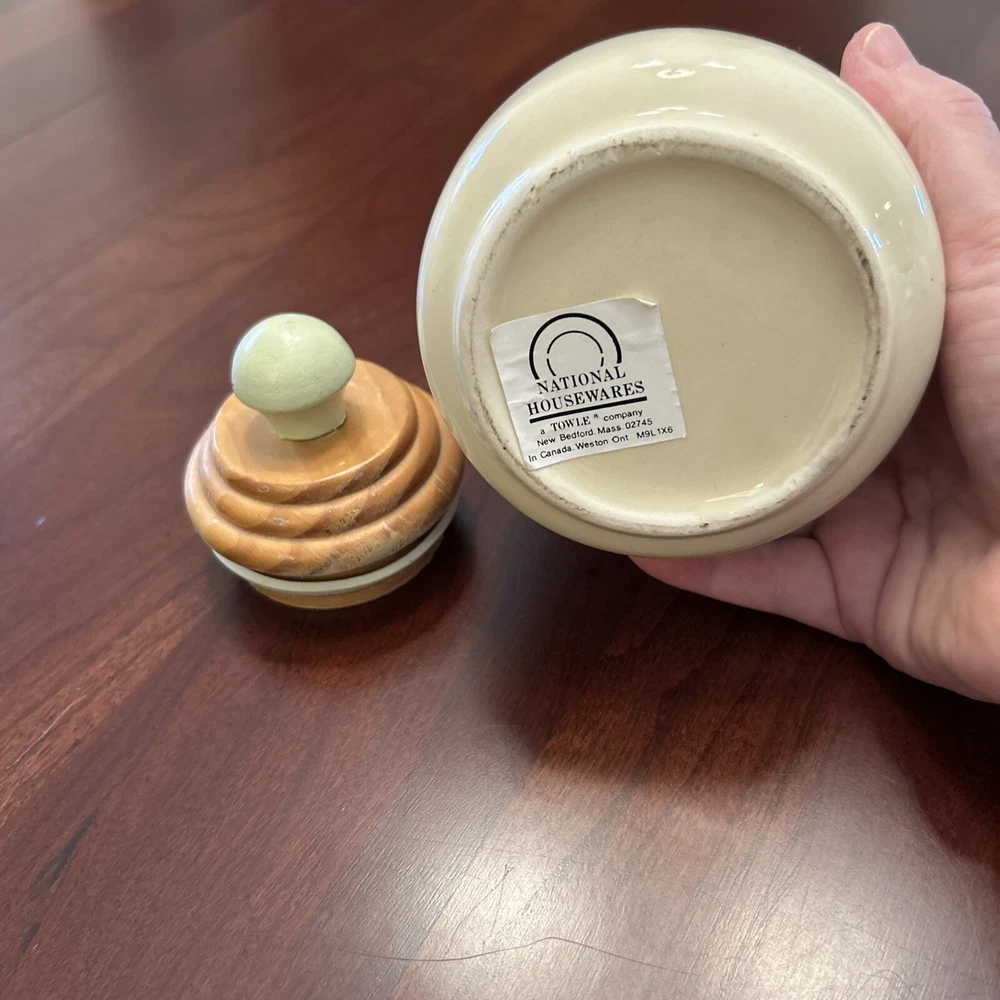 Vtg Towle National Housewares Tea Canister Wooden Top Ivory Farmhouse Cottagecore This vintage ceramic tea canister from Towle's National Housewares collection is the perfect addition to any farmhouse-style kitchen. The ivory and brown script color and wooden lid with a pale green knob give it a rustic, charming look that's sure to catch the eye of collectors and guests alike. Measuring 5 inches in height and 3 inches in width, it's the ideal size for storing your favorite tea blends or other kitchen essentials. The canister is a single item in the set and comes with a lid. Its style is farmhouse vintage, with a country theme that's perfect for collectors and enthusiasts of all kinds. Whether you're looking to add to your collection or just want a unique piece to display in your kitchen, this Towle tea canister is sure to impress. Pale Pastel Green Knob