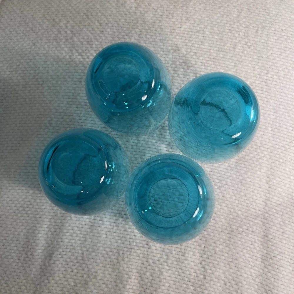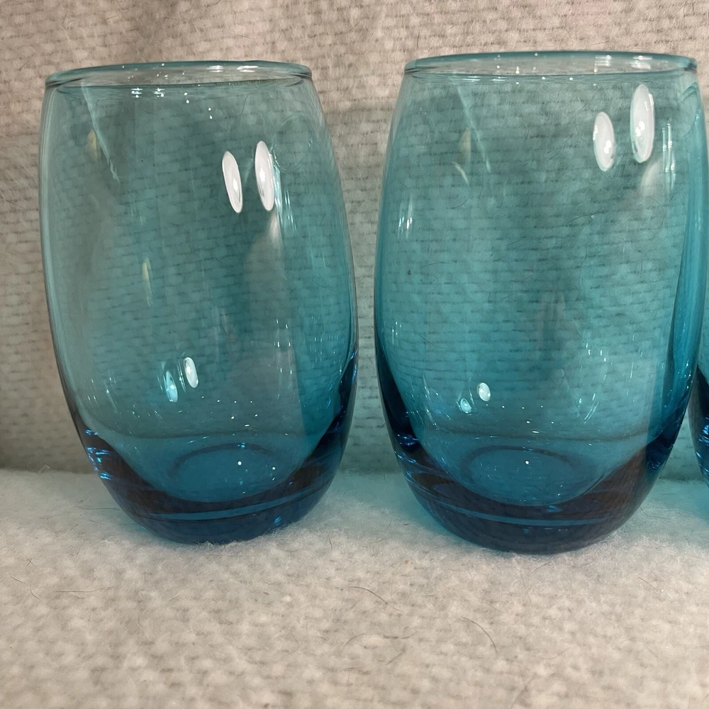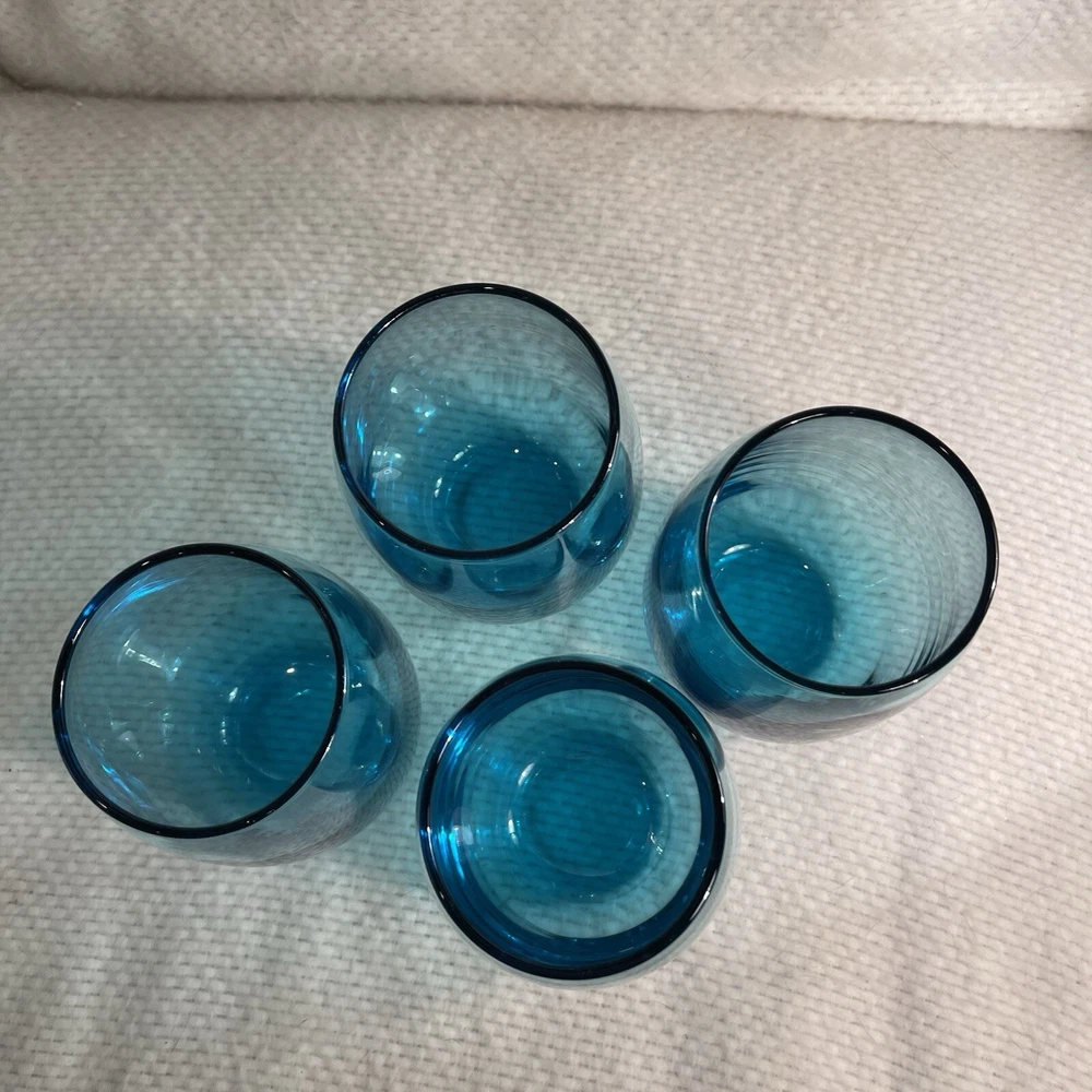 Add a touch of contemporary elegance to your drinkware collection with this vintage set of four stemless wine glasses. The glasses feature a solid turquoise color and a round shape with a diameter of 2.75 inches and a height of 5 inches. The glasses have a capacity of 16 ounces and come in a set of four, making them perfect for hosting a dinner party or a beach house getaway. Crafted from high-quality glass material, these wine glasses are both durable and stylish. The glasses are unmarked, adding to their contemporary appeal. The set is an original and is not a licensed reproduction. The glasses are both decorative and functional, making them a great addition to any home. Excellent condition. No chips or cracks.