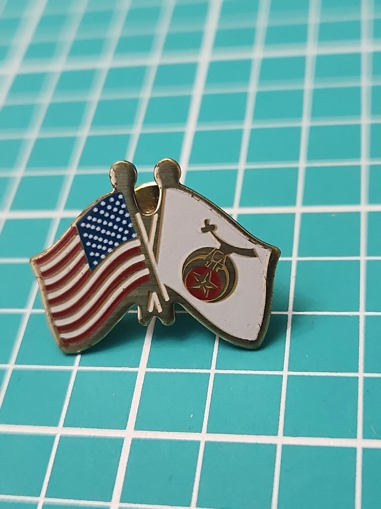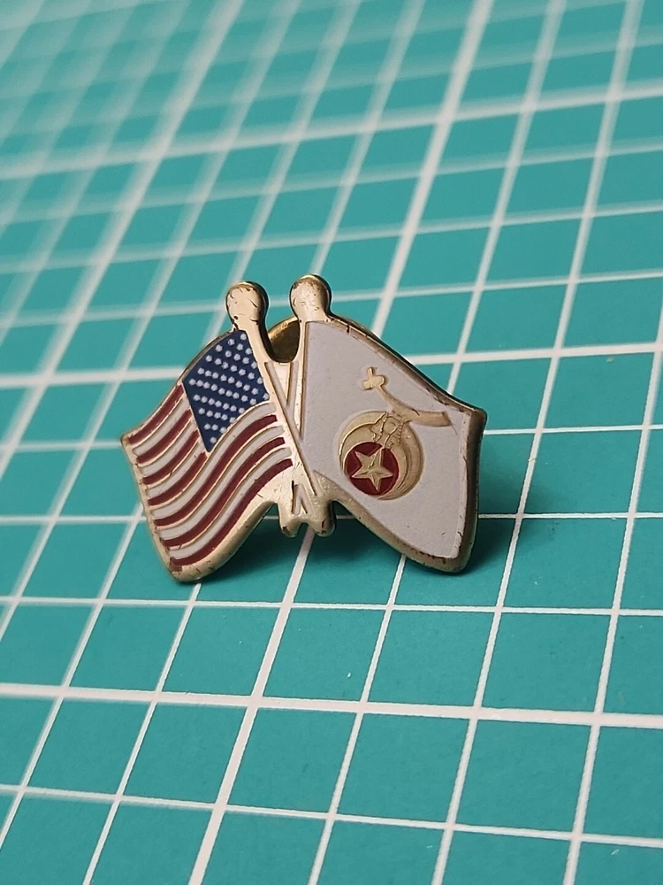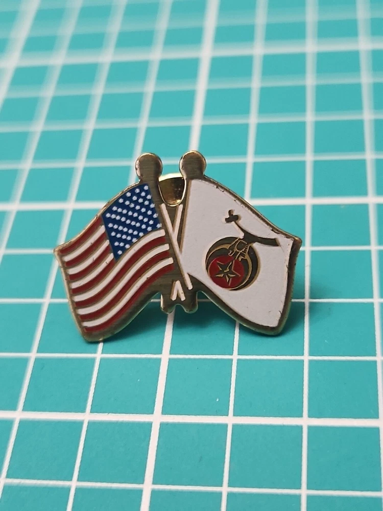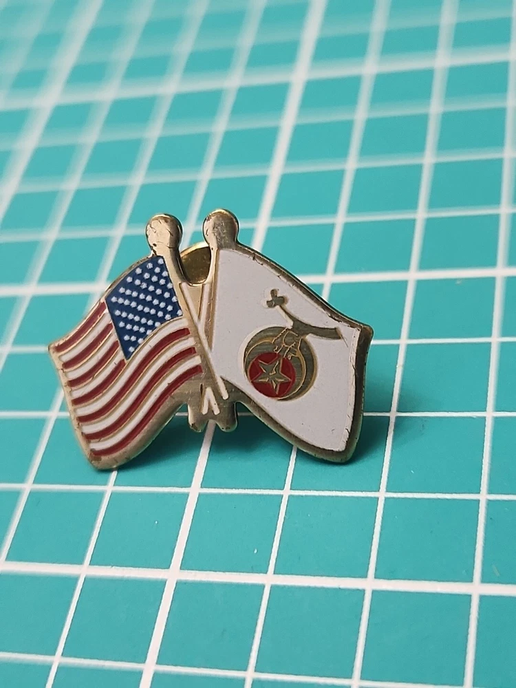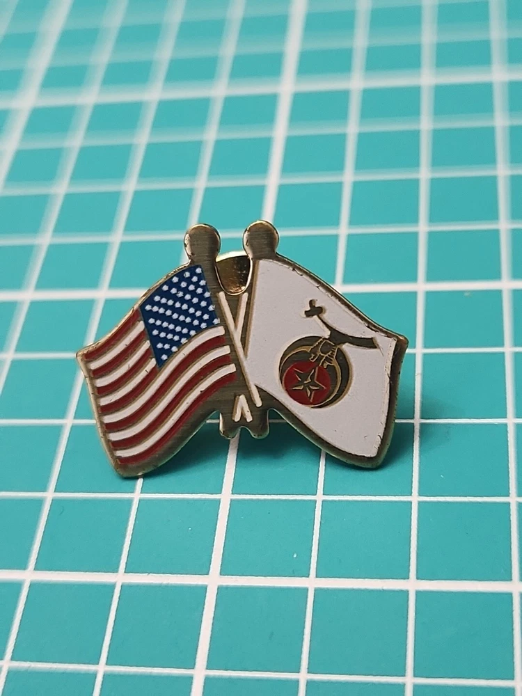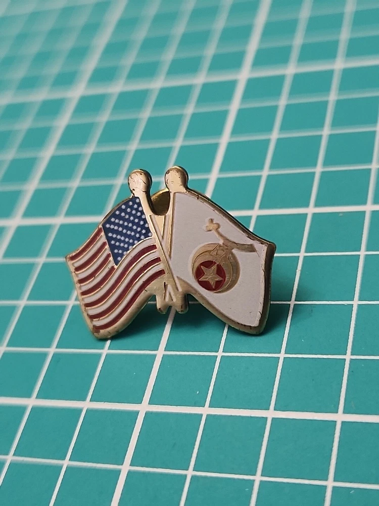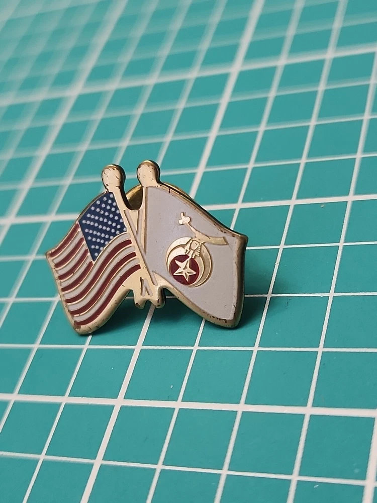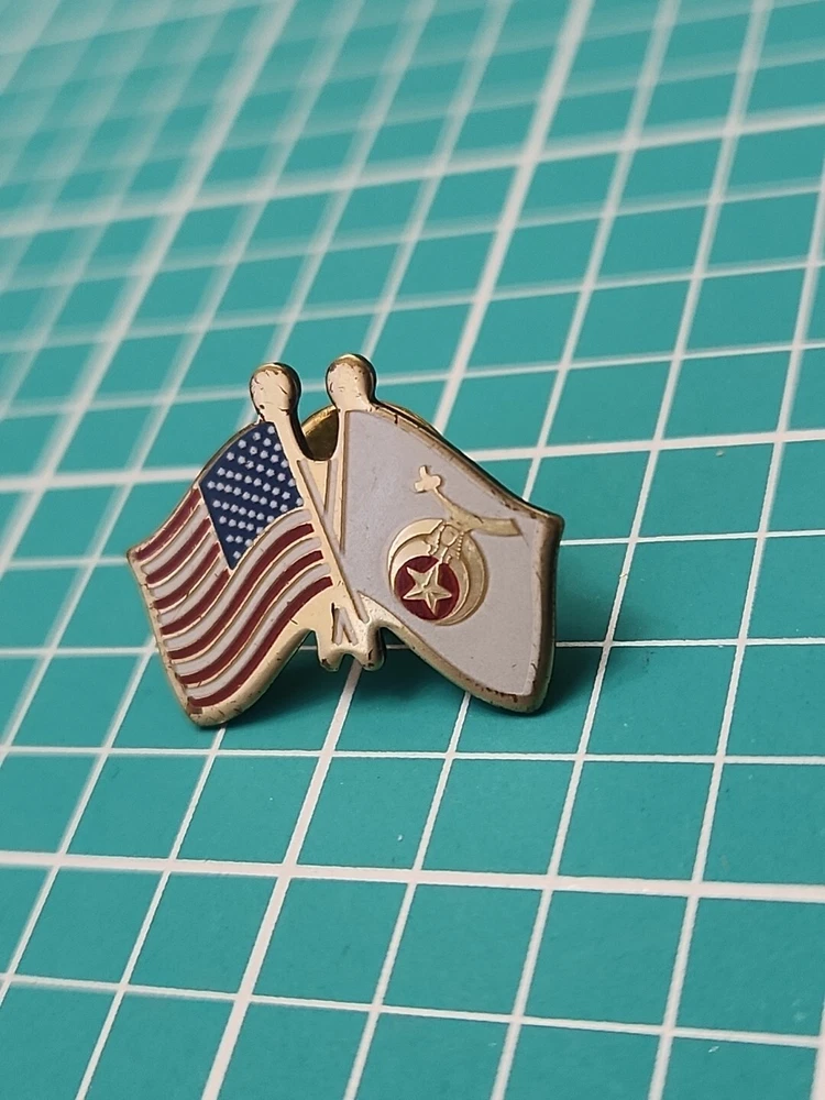 This vintage lapel pin features a gold tone Shriner Friendship Flag design, perfect for collectors and enthusiasts alike. The pin is in great shape, with no noticeable wear or tear. Its unique design and intricate details make it a great addition to any collection or outfit. The pin is perfect for those who are passionate about collectibles or just want to add a touch of nostalgia to their wardrobe. It can be worn on a hat, jacket, or even as a unique accessory on a bag. Don't miss out on this one-of-a-kind piece.