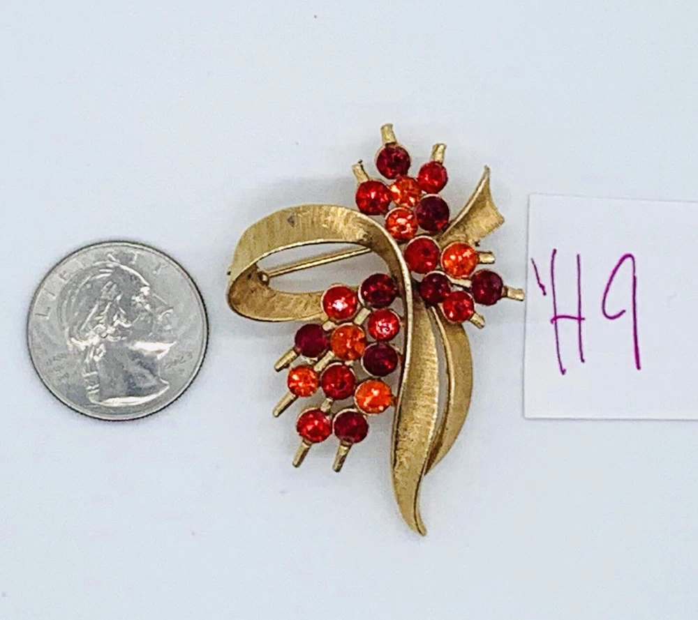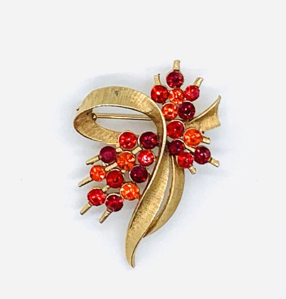 Antique: No Customized: No Main Stone: Rhinestone Secondary Stone: Rhinestone Handmade: No Country/Region of Manufacture: Unknown Item Length: See pics Brand: Unbranded Signed: No Country of Origin: Unknown Department: Unisex Adults Base Metal: Unknown Vintage: Yes Setting Style: Pavé Type: Brooch Jewelry Department: Fashion Material: Rhinestone, Metal Era: Undated Shape: Flower Bouquet Metal Purity: Unknown Main Stone Color: Orange Original/Reproduction: Original Main Stone Creation: Simulated Occasion: Anniversary, Birthday, Christening, Engagement, Mother's Day, Wedding, Weekend, Party Metal: Gold Tone Main Stone Shape: Marquise Theme: Art, Beauty, Fashion & Costumes, Flowers & Plants, Retro Color: Gold