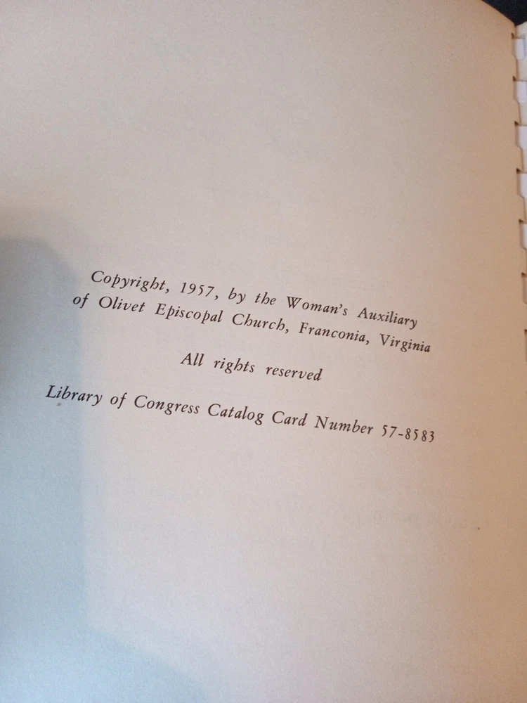 The product is a vintage Virginia cookery book from 1957. It features recipes that likely reflect traditional Southern cooking styles and flavors. This collectible item may offer a glimpse into the culinary heritage of Virginia, making it a valuable addition to any cookbook collection or of interest to those with a passion for Southern cuisine.