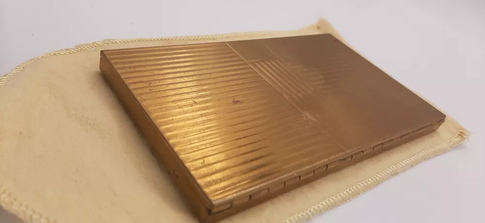 VINTAGE PREOWNED VOLUPTE CIGARETTE CASE WITH POUCH ENGRAVED "TO LIZ" "X CLUB" GOLDTONE 5.25"×3"×5/16" APPROXIMATELY SCRATCHES FROM USE AND AGE DISCOLORATION SOME SPOTS FROM AGE SOLD "AS IS" PLEASE SEE PHOTOS AS THEY ARE AN IMPORTANT PART OF THE DESCRIPTION! MADE IN USA