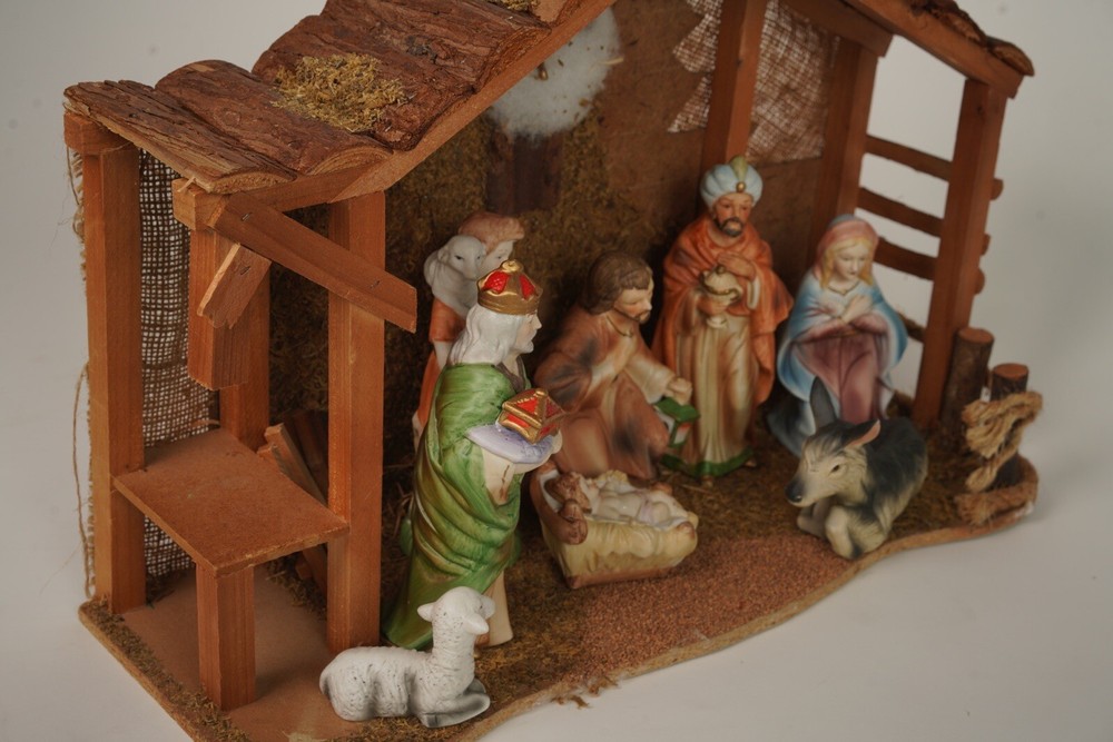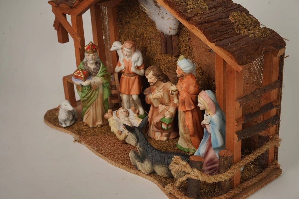 This listing includes 8 figurines and 1 stable only. The stable measures as 21"x8"x15". There is an optional broken 10th piece that only sent upon request. The 10th piece needs to be glued.