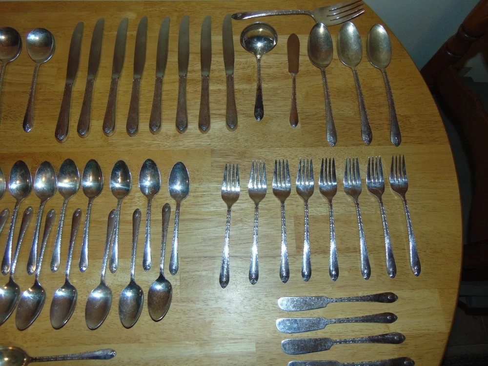 Vintage Wm. Rogers & Son IS "Exquisite" Silverware Flatware Set 1940 ~ 61 pcs. Set consist of 8 Knives, 8 Dinner Forks, 8 Salad Forks, 15 Teaspoons, 8 Butter Knives, 7 Soup Spoons, 1 Master Butter Knife, 1 Ladle, 3 Serving Spoons, 1 Serving Fork and 1 Sugar Spoon. Set weighs 5 lbs. 4 oz. and could use polishing. Low opening bid and no reserve. Buyer to pay shipping.