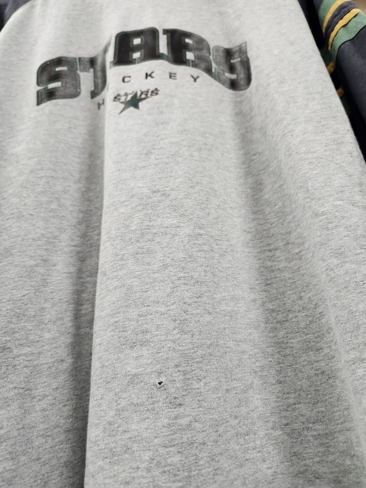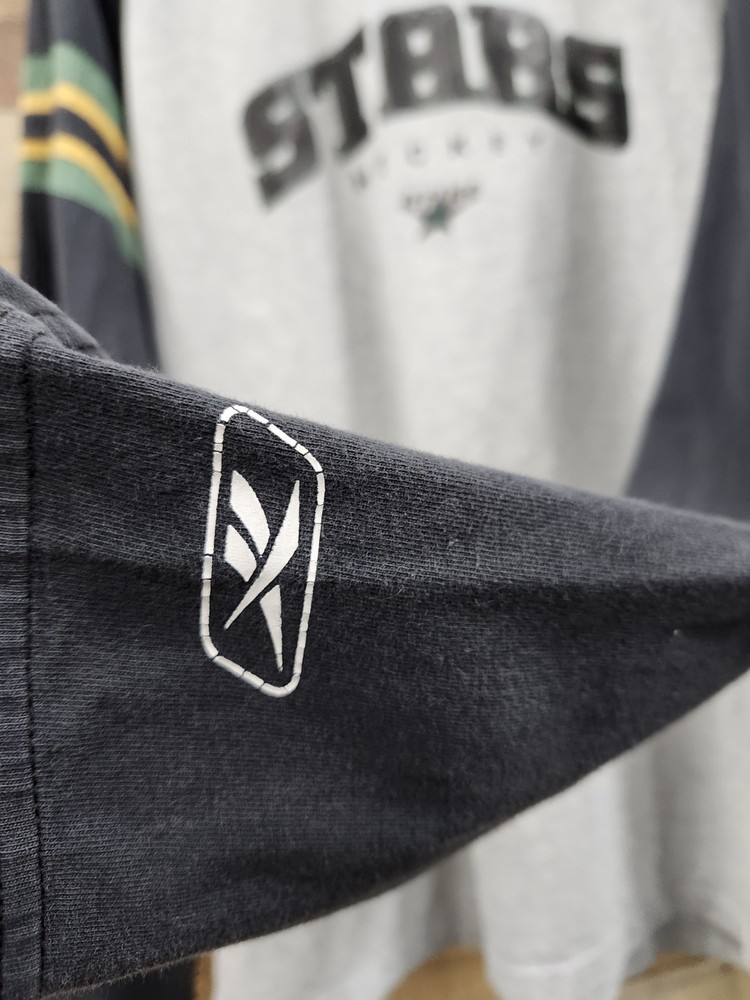 This vintage Y2k Reebok Dallas Stars Hockey T-Shirt in size XL features a graphic print with a crew neck and long sleeves, perfect for all seasons. Made from a comfortable cotton blend material with a knit fabric type, this shirt is machine washable and adorned with glitter, embroidered logo accents. The gray color and 90s sports theme make it a stylish addition to any man's wardrobe, representing the Dallas Stars in a unique and nostalgic way. I SHIP IMMEDIATELY 🚢 💖