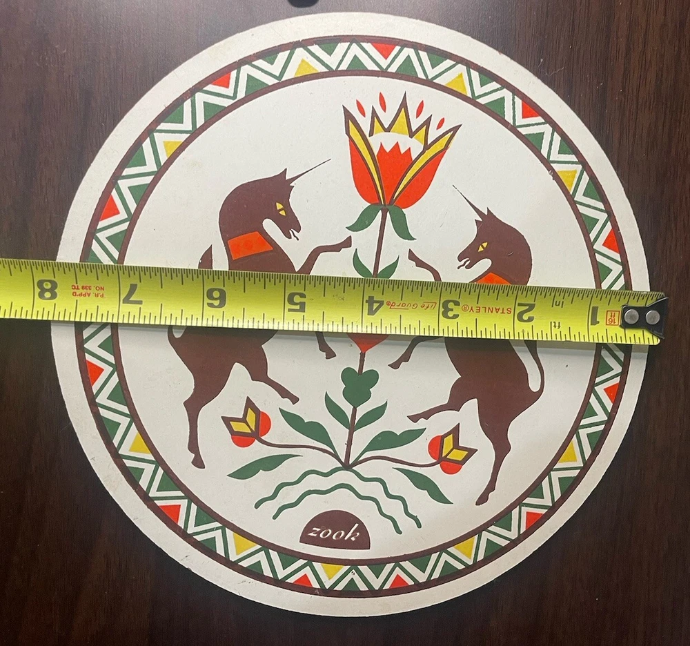 This vintage trivet from Pennsylvania Dutch Zook features a colorful design of unicorns and flowers, making it a unique addition to any kitchen or collection. This item serves as a functional trivet for hot dishes or can be displayed as wall art. The vintage touch adds character to this kitschy MCM piece, perfect for collectors or those who appreciate artful home decor. Very good vintage condition with minor wear, please see photos.