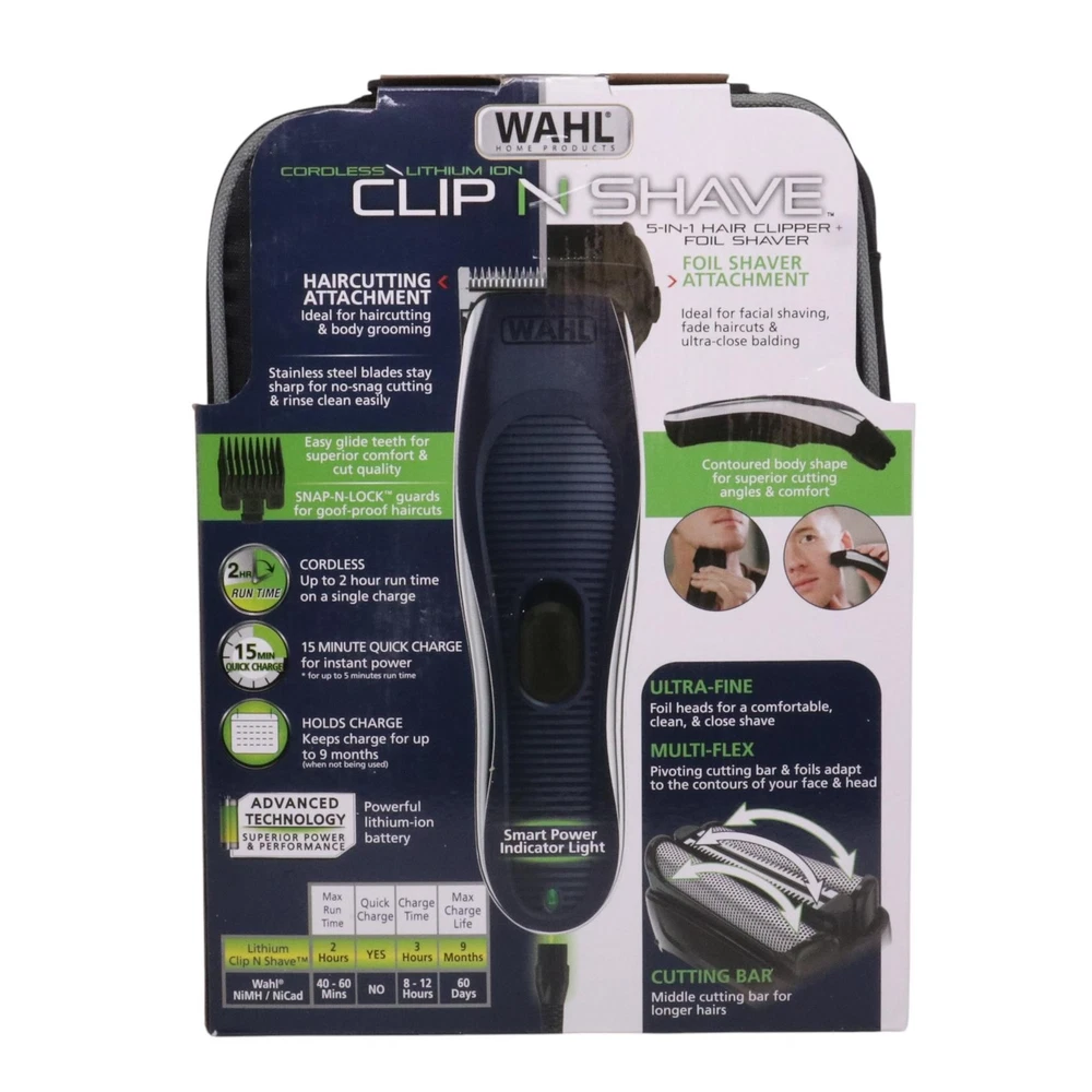 WAHL Home Clip N Shave Cordless Lithium Ion 5-in-1 Hair Clipper + Foil Shaver The Wahl® Cordless Lithium-Ion Clip 'N Shave™, a revolutionary addition to your grooming arsenal. This cutting-edge hair clipper offers unparalleled versatility, making it the ultimate choice for a complete hair cutting and face/body shaving. Features Details Shipping Weight: 0.0 pounds Item model number: 89523952 Fast & Free Shipping Orders are shipped out within 2-3 business days usually and delivered to your doorstep as quickly as possible. Competitive Pricing Our competitive prices are some of the lowest that you will find on the internet. Rest assured that you're getting a good deal when purchasing from us. 30-day Money Back Guarantee We are committed to making sure that you leave this transaction satisfied. If you're unhappy with the product for any reason, you may return it back for your money-back or a replacement if available within 30 days.