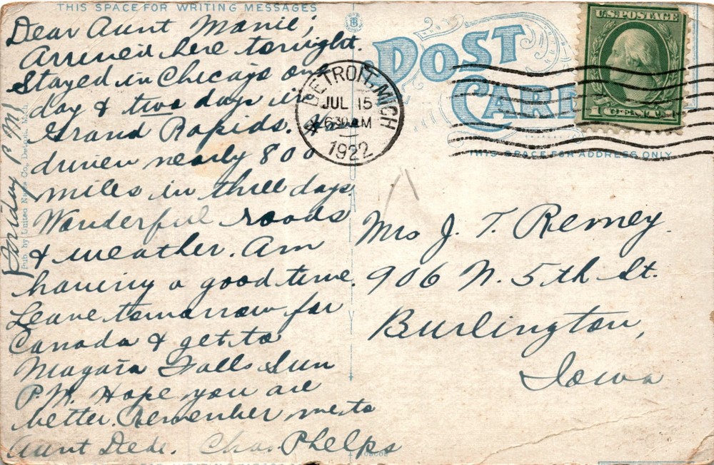 MAKE AN OFFER. THE MORE YOU BUY THE BETTER DEAL I WILL ACCEPT The postcard is a vintage image of Washington Boulevard in Detroit, Michigan. The writer, Mrs. J. J. Remey, is addressing her Aunt Manil, informing her of her travels. She mentions staying in Chicago for a day and two days in Grand Rapids before reaching Detroit. Mrs.