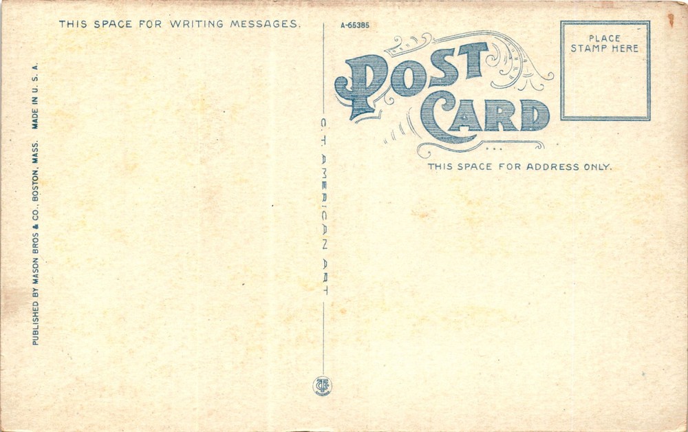The front of the postcard features a statue of George Washington in the public gardens of Boston, Massachusetts. The postcard was published by Mason Bros & Co., a company based in Boston. It was made in the U.S.A. and is part of the C. T. American Art series, with the serial number A-65385.