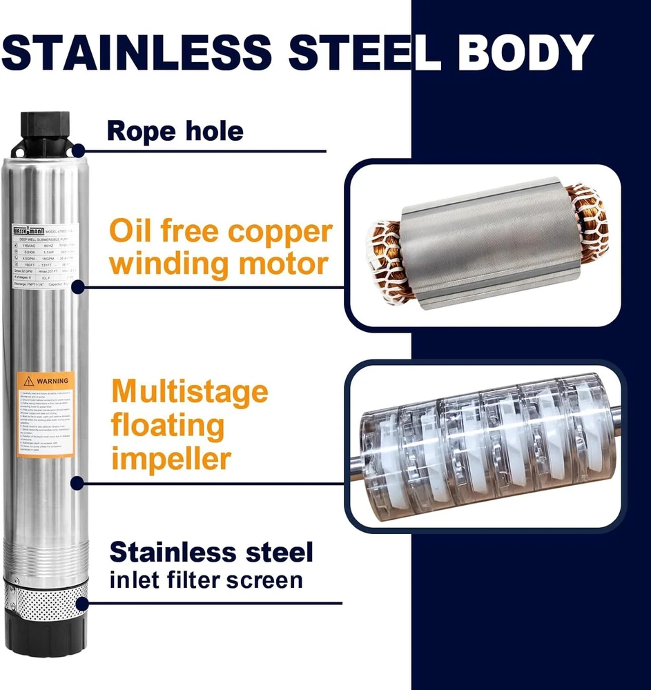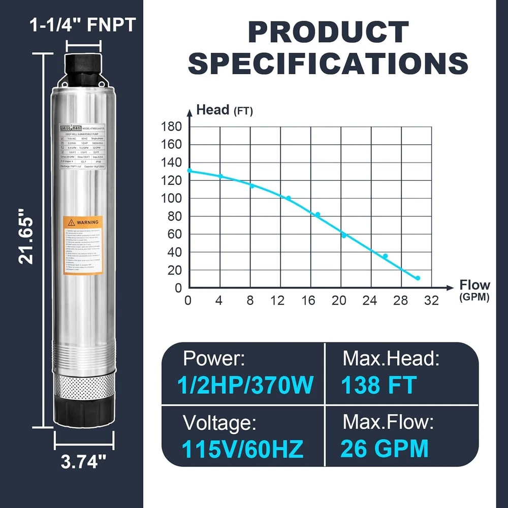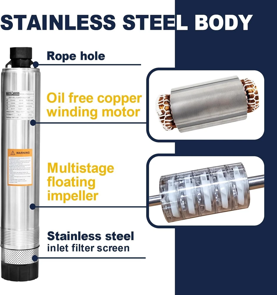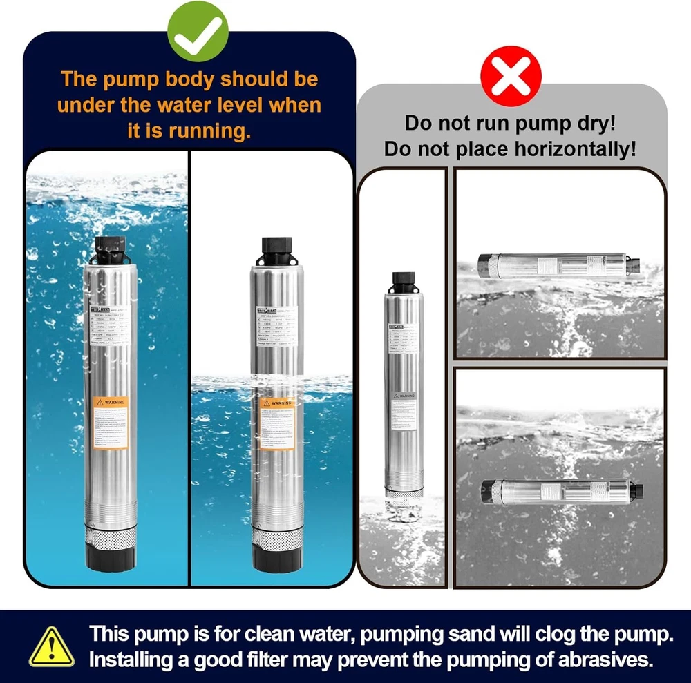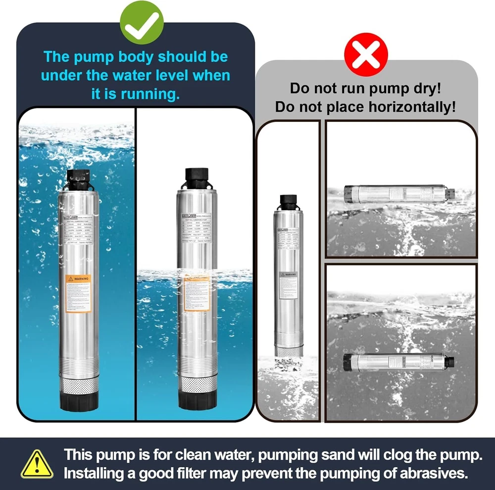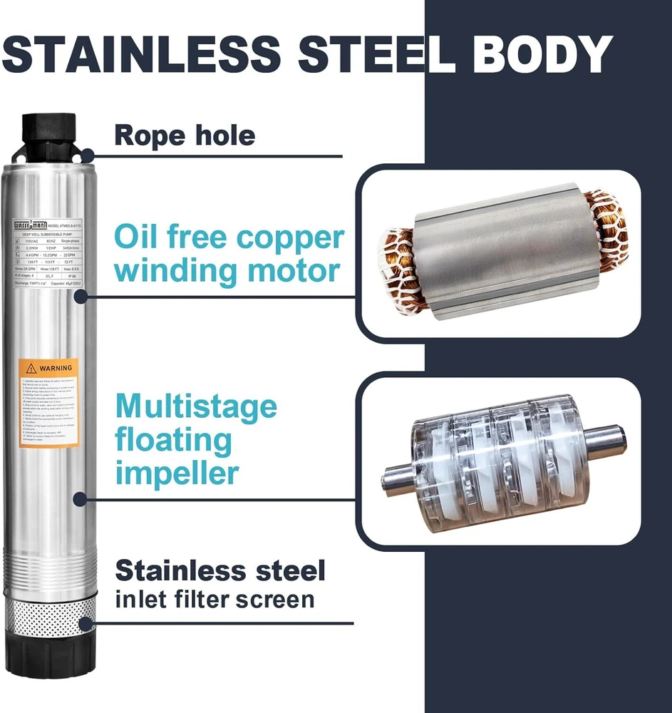 【ESSENTIAL PARAMETER】Stainless Steel Submersible Deep Well Pump rated voltage: 115V/60HZ;Rated power:1/2HP;Max flow:26GPM;Max head:138ft;Outlet:1-1/4" FNPT;For 4 inch well casings and bigger. 【HIGH QUALITY PUMP】Septic Submersible Pump Features:high quality stainless steel body;Built in capacitor start;Hermetically sealed motor is thermally protected to prevent overheating,for longer life and powerful start. 【APPLICABLE CONDITION】The water pump has no special requirement on well and water pipe, that means the pump can used in Steel pipe wells, ash pipe wells or soil wells, and if the pressure permit, steel pipe, hose or plastic pipe can be used as its water pipe. 【PREMIUM FILTRATION MESH】The filtration mesh of a submersible pump is made of stainless steel to filter impurities.You can add a layer of gauze in front of the filtration inlet for a new drilled well with excessive granular sediment. 【WIDE USE】4TMS series septic tank submersible pump is suitable for septic tank, fish pond, animal husbandry, water fountain extraction, agricultural irrigation and so on.