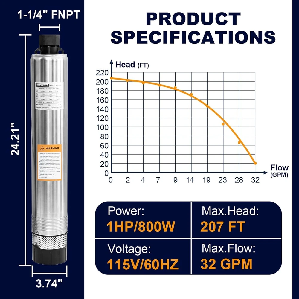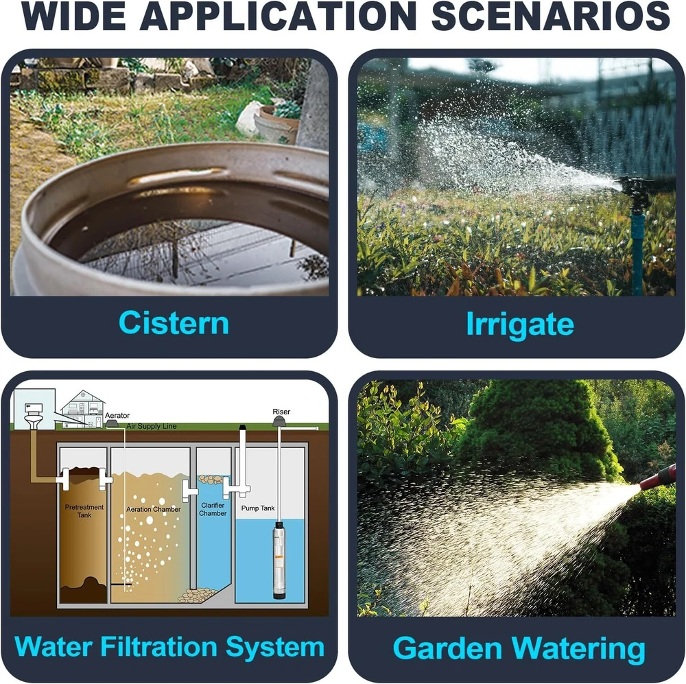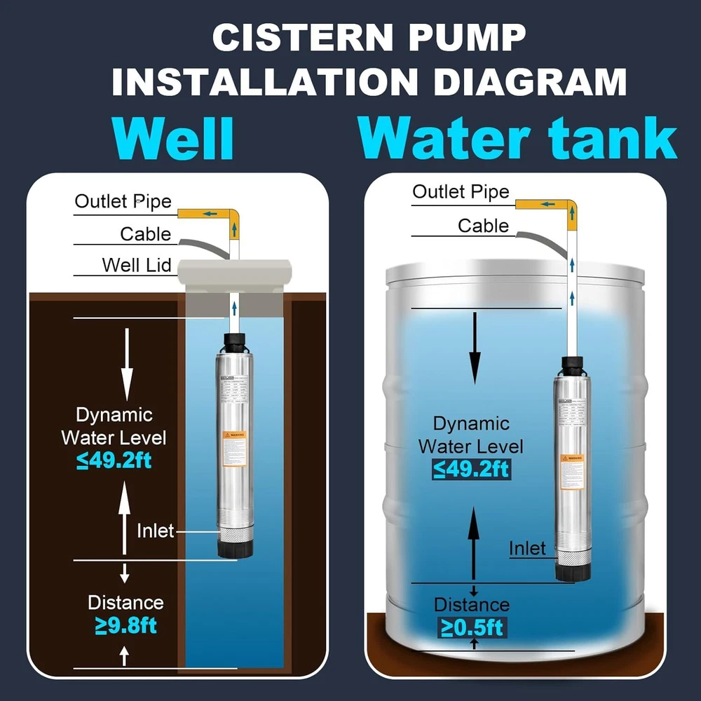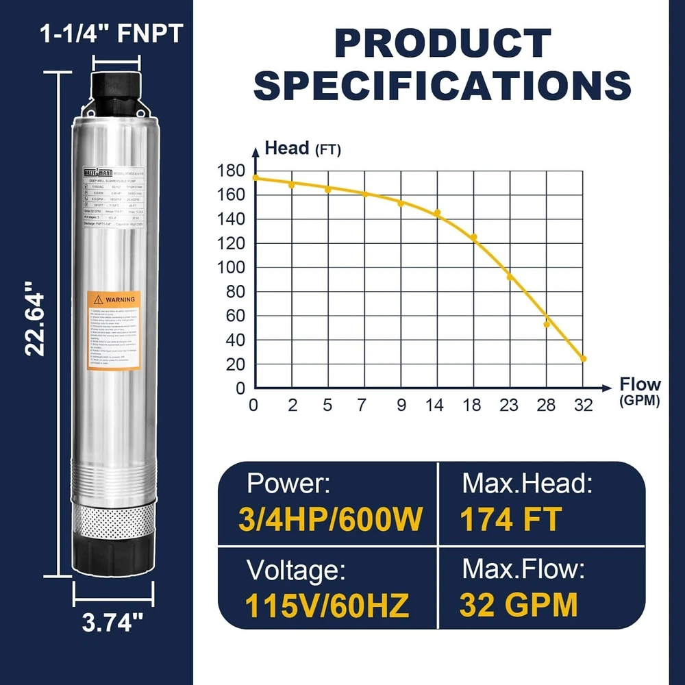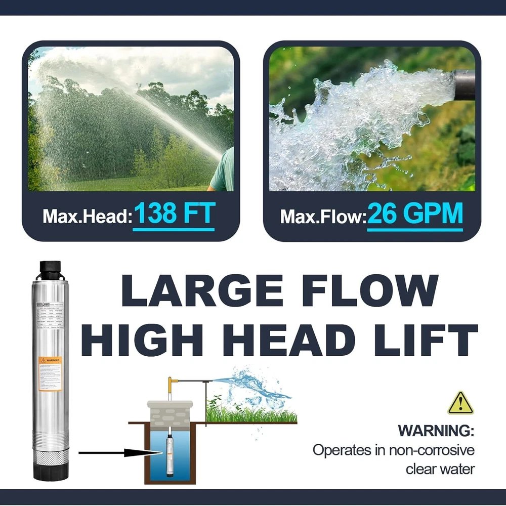 【ESSENTIAL PARAMETER】Stainless Steel Submersible Deep Well Pump rated voltage: 115V/60HZ;Rated power:1/2HP;Max flow:26GPM;Max head:138ft;Outlet:1-1/4" FNPT;For 4 inch well casings and bigger. 【HIGH QUALITY PUMP】Septic Submersible Pump Features:high quality stainless steel body;Built in capacitor start;Hermetically sealed motor is thermally protected to prevent overheating,for longer life and powerful start. 【APPLICABLE CONDITION】The water pump has no special requirement on well and water pipe, that means the pump can used in Steel pipe wells, ash pipe wells or soil wells, and if the pressure permit, steel pipe, hose or plastic pipe can be used as its water pipe. 【PREMIUM FILTRATION MESH】The filtration mesh of a submersible pump is made of stainless steel to filter impurities.You can add a layer of gauze in front of the filtration inlet for a new drilled well with excessive granular sediment. 【WIDE USE】4TMS series septic tank submersible pump is suitable for septic tank, fish pond, animal husbandry, water fountain extraction, agricultural irrigation and so on.