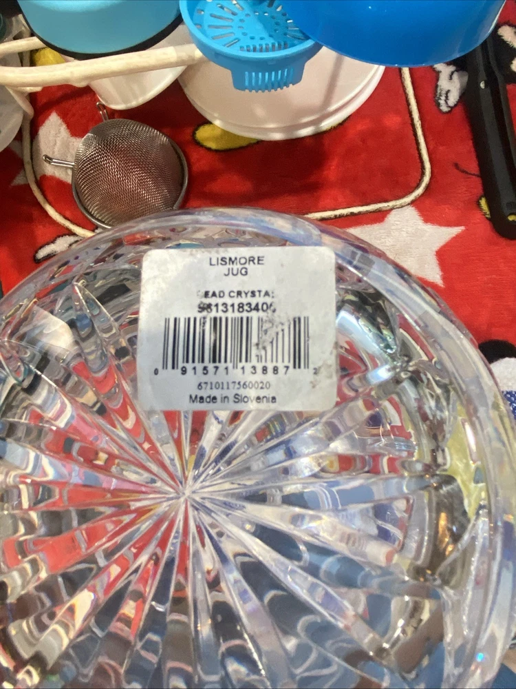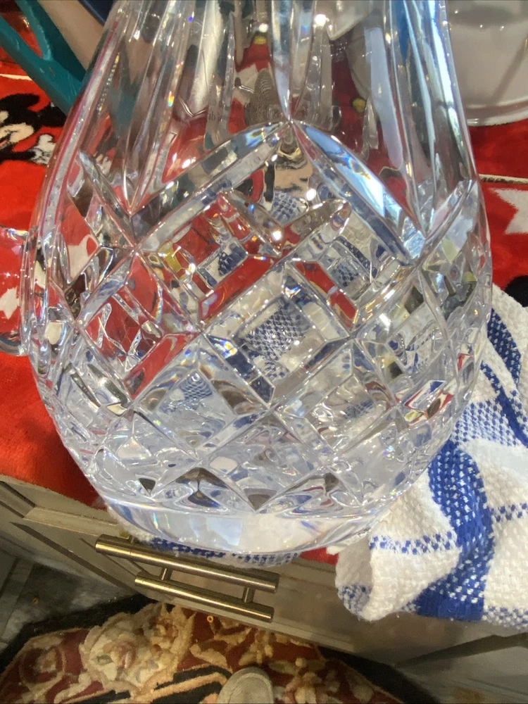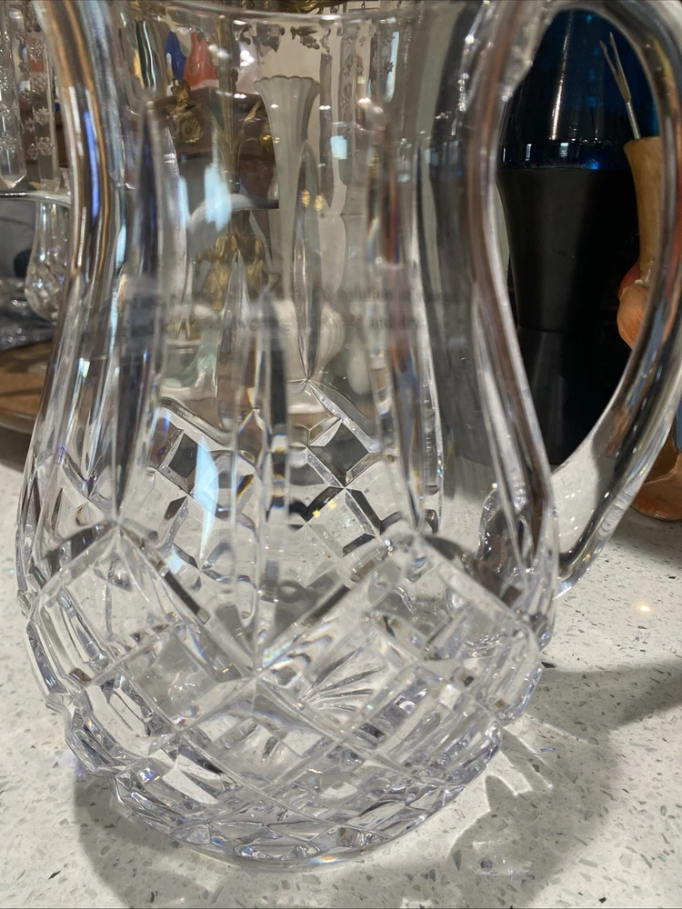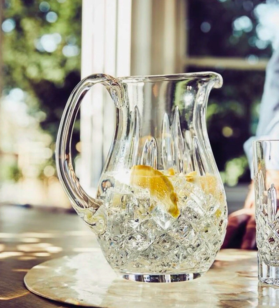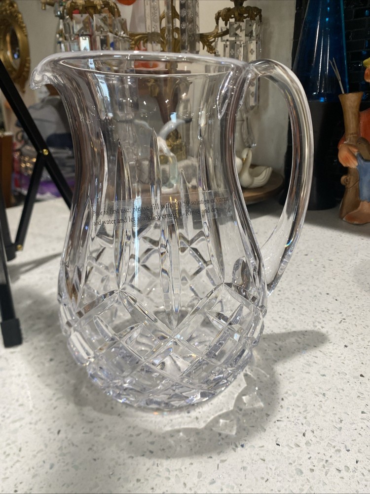 The Waterford Lismore Pitcher Jug is a stunning piece of crystal artistry, standing at 8 inches tall and boasting a generous capacity of 60 ounces. Made in Germany, this elegant pitcher features a classic diamond pattern and a glossy finish, adding a touch of sophistication to any dining or entertaining setting. With its Irish origins and exquisite craftsmanship, this Waterford piece exudes timeless elegance and impeccable style. Perfect for serving beverages or as a standout decorative display, this pitcher jug is a luxurious addition to any home.