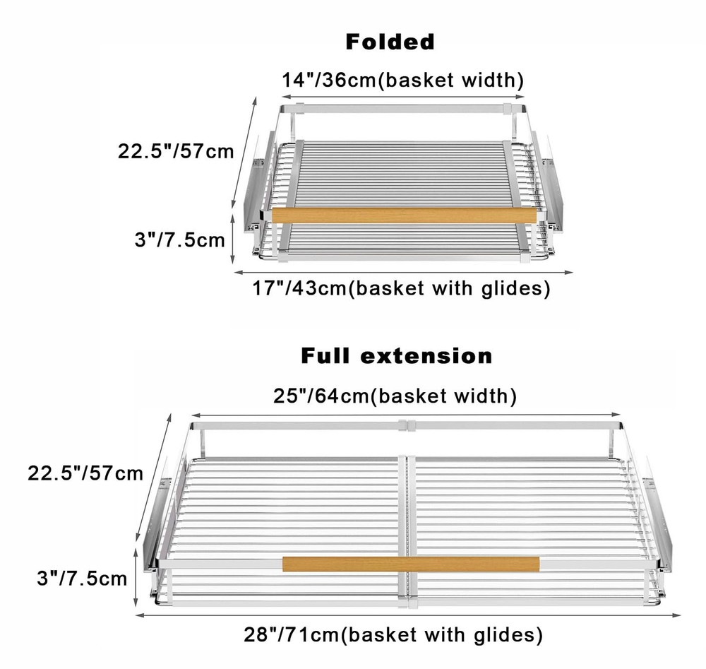 The Installation: The specific installation can be seen in our installation video. Resize slide bracket width with adjustment screws (≤1")to avoid the door hinges interfered with the drawer pulling out. Only takes a few steps, you will get a entire pull out organizer for cabinet. Great for your kitchen, bathroom, under sink and pantry storage organizing. Minimum width and depth required for the organizer installation. This Product NEEDS to Be FIXED with Screws to the side wall of the installation place. Each shelf organizer come with plastic shelf liner, which help close the gap between the bars for storing smaller items. Expendable & Adjustble:Measures 22.5"/57cm (D)x17"/43cm(W)x 3"/7.5cm(H); Expands from 17"/43cm to 28"/71cm width(including two slide guides). Customize to fit your drawers by expanding the tray for a perfect size, fits easily in most kitchen cabinets. Sturdy & Smooth Slide-out Organizer: Made out of heavy-duty metal frame construction and Using industrial-grade ball sliding system, even under the weight of heavy portable equipment (such as kitchen mixers, pots and pans and other kitchen utensils), it can slide smoothly without unpleasant noise. Space-saving Organizer:This slide out cabinet organizer can maximize your cabinet space. Makes it super easy to store, organize, and access your stand mixers, pots, pans, baking sheets and other kitchen accessories. And it conveniently slides out so you don’t have to dig way back in the cabinet when you are looking for what you need!