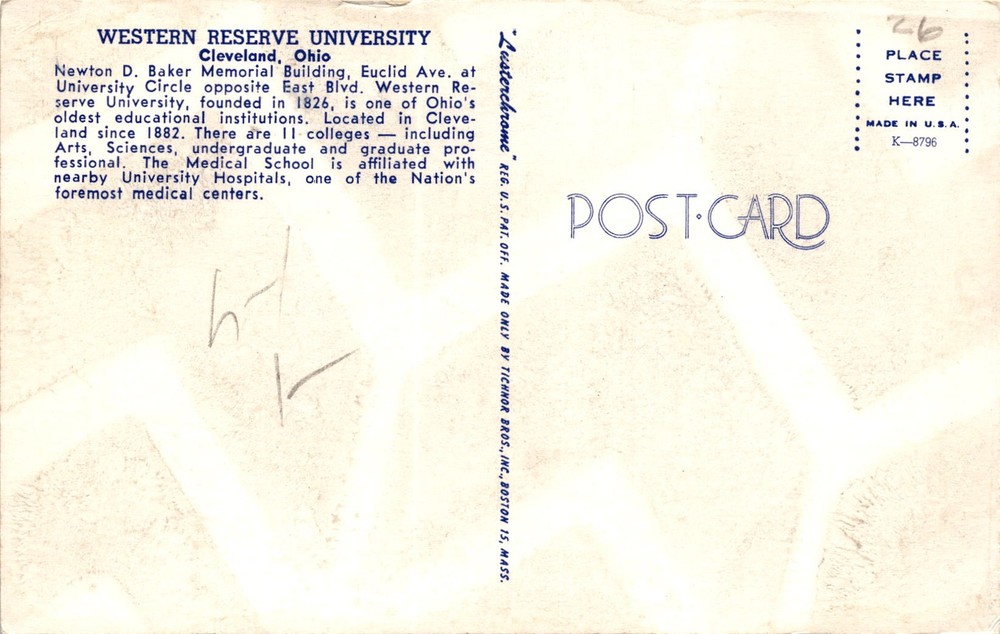 MAKE AN OFFER. THE MORE YOU BUY THE BETTER DEAL I WILL ACCEPT The postcard features an image of the Newton D. Baker Memorial Building at Western Reserve University in Cleveland, Ohio. Founded in 1826, Western Reserve University is one of the oldest educational institutions in Ohio, with a presence in Cleveland since 1882. The university comprises 11 colleges, including Arts, Sciences, undergraduate, and graduate professional programs.