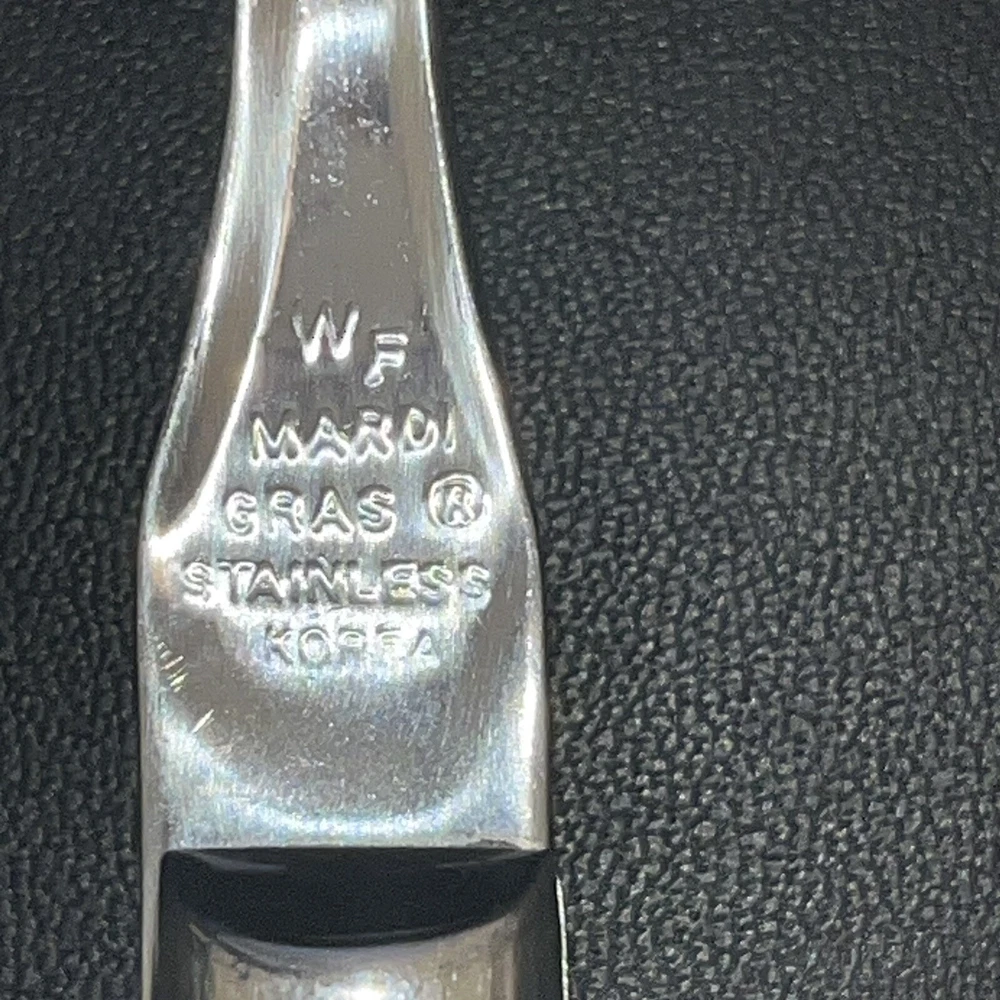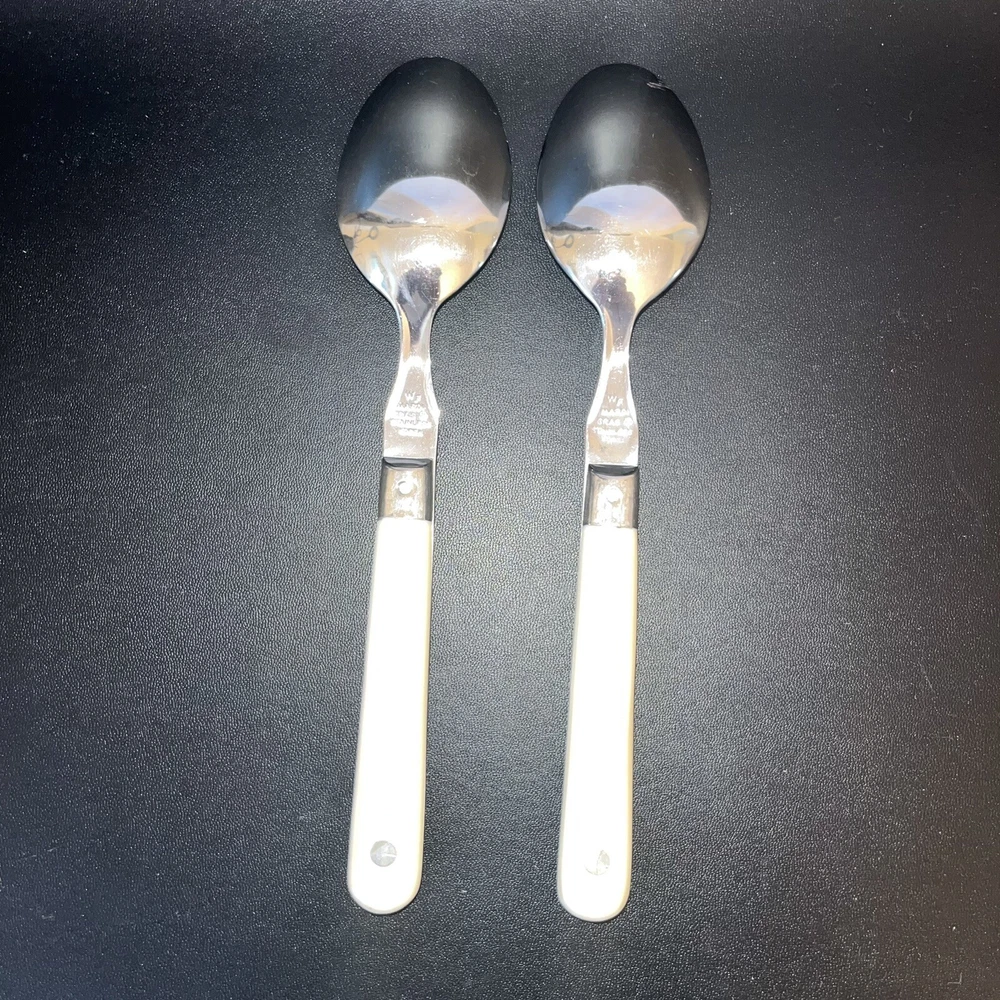 WF Mardi Gras Stainless White Ivory Plastic Handle Washington Forge Tablespoons Set of 2. Handles are discolored - cream or pinkish tone. There is a smudg from use on one spoon. See photo.
