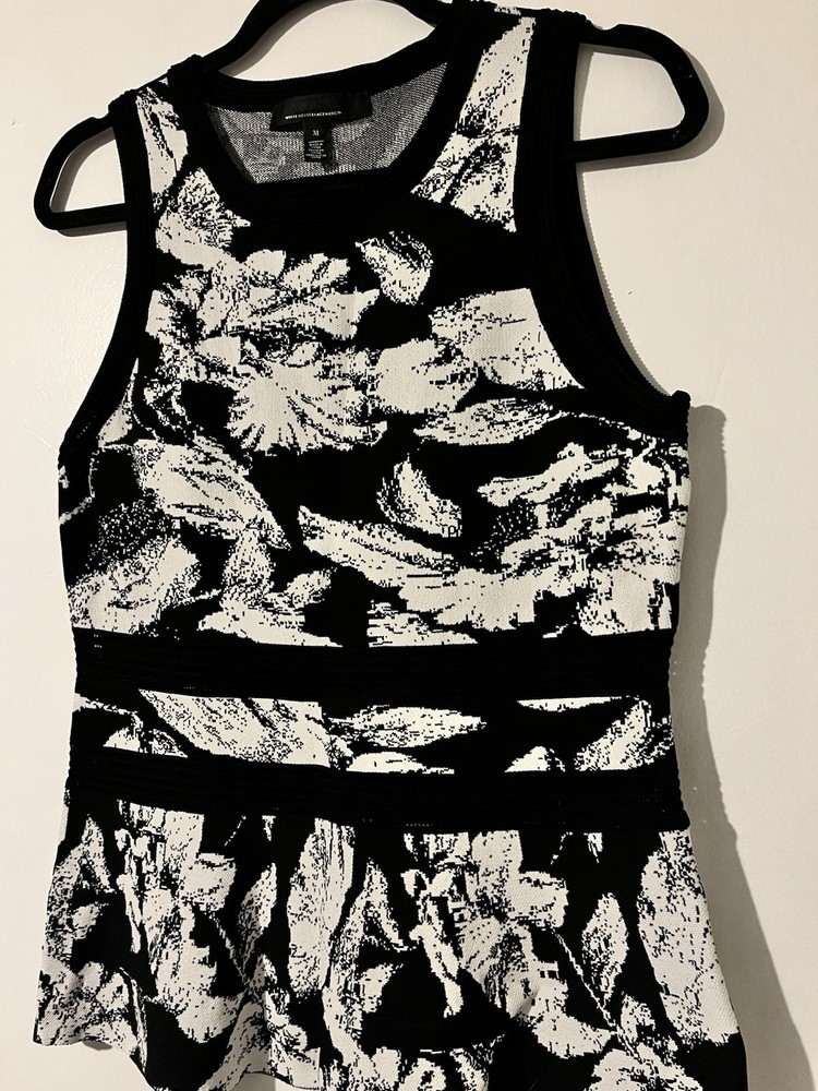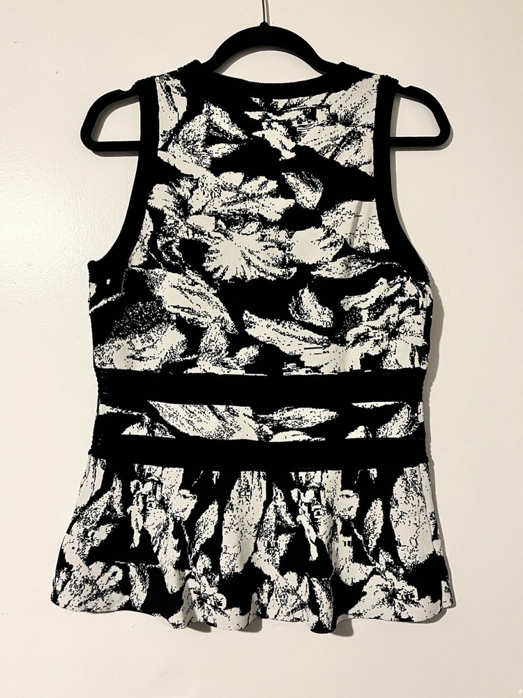 This WHBM Woman's Black and White Peplum Top in size Medium is a versatile and stylish addition to any woman's wardrobe. The sleeveless design, round neckline, and pullover closure make it perfect for casual occasions during the summer, fall, or spring seasons. Made from polyester with a stretchy material, this top offers a regular fit and is machine washable for easy care. The black color and basic style make it a timeless piece that can be paired with jeans or skirts for a chic and effortless look.