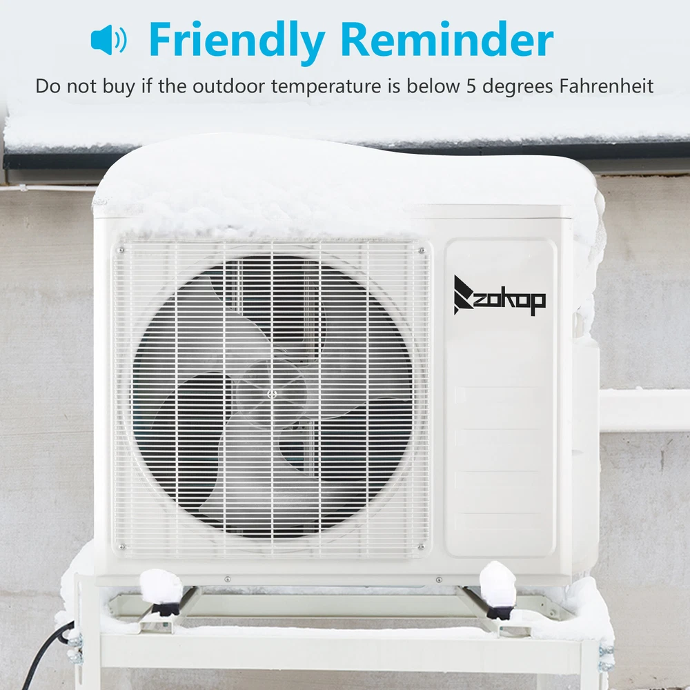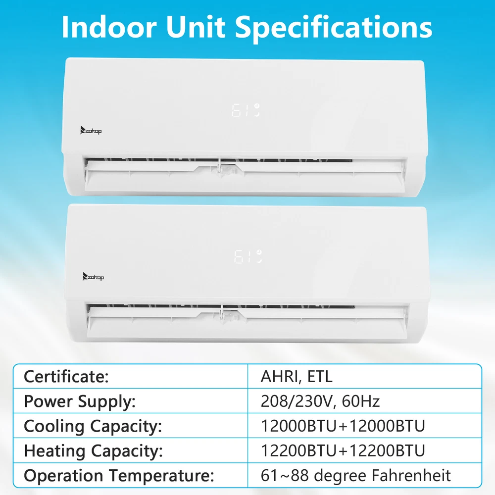 listing template VISIT OUR STORE SIGH UP FOR EMAIL WIFI 18000 BTU Ductless Dual Zone Mini Split Air Conditioner & Heat Pump 19 SEER ZOKOP Dual 2 Zone Ductless Mini Split Air Conditioner Heat Pump System, 19 SEER2 Ductless AC with 2 Indoor Air Handlers, 1 Outdoor Condenser, 25ft Installation Kit (12K+12K) Introductions : ZOKOP smart Split Type Type Inverter Air Conditioners with heating function are made with high quality compressor, high speed pure copper motor & inner spiral copper tube which are powerful to quickly cool down / warm your home, office, garage or apartment for maximum comfort in quiet operation, perfect appliance in hot Summer or cold Winter. Comparing with others, machine featured with high SEER grade, which means that it is more energy efficient and much money saving! This unit also has Sleep, Turbo, ECO, Mute and Timer functions. These functions help you enjoy the true individual comfort. Let the ZOKOP Mini Split Air Conditioner 2-Zone be the solution to your home's heating and cooling needs. Features: [MULTIPLE ROOMS] Comes with 2 indoor air handlers 12,000 BTU + 12,000 BTU with separate controller for individual rooms and 1 outdoor condenser. Enjoy individual temperature controls in each room for ideal climate control. This unit provides cooling and heating for up to 1100Sq. Ft ( eachindoor unit recommended area 550 Sq. Ft-) and able to work in environments as low as 5 degrees Fahrenheit. 2 pcs 24.6ft copper pipes (Standard size 1/4" & 3/8" outer dimension) and 2 installation kits included. The length for drain pipe is 78.7". Featured with Cooling, Heating, Dehumidifying and Fan only modes in one compact unit. It is ideal for using in home's bedroom, living roo, kitchen, office, apartment, garage and so on. [Energy Saving] ZOKOP the speed of the air conditioner equipped with frequency converter directly affects the service efficiency of the air conditioner. The frequency converter is a control system used to control & adjust the speed of the compressor to make it always in the best speed state, so as to improve the energy efficiency ratio (at least 30% more energy-saving than the conventional air conditioner). This 19 SEER2, 12000BTU+12000BRU, 208/230V~60Hz, AHRI Certified AC unit with a heat pump(up to 5℉/-15℃) is featured high quality compressor for more efficient cooling and longer working life; Higher SEER grade & Eco-friendly design which leads you for money saving ( please confirm voltage before making purchase) . [Quiet Cooler & Heater] Ultra Silent at only 27-42 dB(A) and beautifully built adds a touch of elegant charm to your room.In sleeping & mute mode, It's able to maintain the temperature while you are sleeping. And you can use the 24-hour timer in combination to free you from additional worries. Featured with 4-way swing function, unit provides scientific airflow in your room to suit your comforts in just a few minutes.Best choice to decorate your home. [Smart Operation] Operating this conditioner is an easy-understanding and enjoyable cooling experience (61-88degree Fahrenheit ). We can set all functions on remote control (Fan Speed Selection, Sleep Mode, 24 Hour Timer, ECO Mode, Turbo Mode, and Mute Mode). Built-in microprocessor chip & sensor in the remote controller makes it more convenient to operate the air conditioner from a distance. Digital LED display controls offer precise temperature adjustments and the remote control lets you control the air conditioner from across the room. [Washable Air Filter] This indoor AC machine comes with a permanently washable and easy cleaning air filter. Keep your air conditioner running more efficiently by cleaning the filter once a month. Specifications : 2*I ndoo r Unit : 1. Color: White 2. Power Supply: 208/230V, 60Hz 3. Cooling : Rated Capacity: 12000Btu/h Rated SEER2: 19Btu/W.h Rated EER2: 10Btu/W.h 4. Heating: Rated Capacity: 12200Btu/h HSPF2 Rating (Region IV): 8.5Btu/W.h 5. Operation temperature: (16~31)degree Celsius/(61~88)degree Fahrenheit 6. Use the air conditioner in the following temperature conditions: Indoor(cooling/heating): 17 ~32degree Celsius(63 ~90degree Fahrenheit)/0 ~27degree Celsius(32 ~80degree Fahrenheit) Outdoor(cooling/heating): 15 ~55degree Celsius(59 ~131degree Fahrenheit)/-15 ~24degree Celsius(5 ~75 degree Fahrenheit) 7. Moisture removal: 1.6L/h 8. Indoor air circulation/Hi : 650m³/h 9. Indoor noise level at cooling(Turbo/High/Med./Low/Mute): 42/39/34/29/27dB(A) 10. Application Area: Up to 550 sq.ft 11. Certificate : AHRI, ETL 12. Indoor Dimensions: 81.1x29.2x20.5cm(31.9x11.5x8.1inch) 13. Indoor Package dimensions: 88.5x36.6x27.8cm(34.8x14.4x10.9inch) 14. Indoor Net weight: 9.5kg/20.9Ibs 15. Indoor Gross weight: 12.7kg/28Ibs 1* Outdoor Unit: 1. Cooling Capacity: 18000BTU/h 2. Heating Capacity: 20000BTU/h 3. SEER2: 20.0BTU/h.W 4. Rated Voltage: 208/230V~60Hz 5. Refrigerant type: R410A/1850g/65.3ozs 6. Outdoor Dimensions: 84.5×38×69.9cm(33.27x14.97x27.5inch) 7. Outdoor Package dimensions: 96×43×75cm(37.79x16.92x29.53inch) 8. Outdoor Net weight: 44kg/97lbs 9. Outdoor Gross weight: 47.5kg/104.7lbs 2*Copper pipes : 1. Connecting Pipe:Gas 3/8''-24.6FT/7.5M Liquid 1/4''-24.6FT/7.5M 2. Signal Cable Length: 24.6FT/7.5M 3. Drain Hose:6.6FT/2M Package Includes : 2* Indoor box includes : 1 x Indoor Unit 1 x Remote Control 1 x Screw Pack 1* Outdoor box includes: 1 x Outdoor Unit 4 x Outdoor feet rubber 2*Copper pipes box includes: 1 x Copper pipes set(24.6FT) 1 x Signal Cable(24.6FT/7.5M) 1 x Drain pipe(6.6FT) 1 x Drain pipe adapter 2 x Sealant 2 x Wall sleeve cover 2 x Pipe tape 1 x Insulation pipe 1 x Wall sleeve You might like this more>> Portable Princess Castle Play House Blue Large Kids Play Tent $23.79 Double Shoe Rack Closet Shelf Storage Organizer $19.49 Oil Painting Easel Sketch Box Portable Folding $57.49 FCH L-Shaped Corner Computer Desk Home Office Desk $109.99 10 Tier Durable Storage Organizer 30 Pair Shoe Tower $18.99 24 Slots PU Leather Wrist Watch Box Display Case Orga