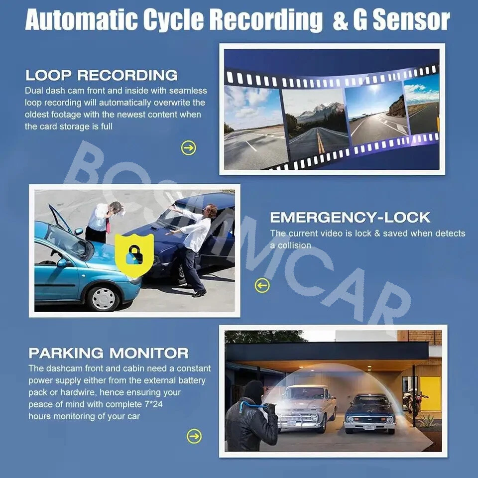 Product View Detail 3 Channel Dash Cam Video Recorder Three Lens WiFi Car DVR Camera with Rear View Night Vision Loop Recording G-Sensor Wifi 3 Channel Dash Cam Three Lens Car DVR HD1080P Interior Camera Vehicle Recorder Video Registrator Dashcam Camcorder Warm tips: Our products are available with WIFI version The new high-definition 3-lens dash cam features built-in WiFi support for iPhone and Android phone connectivity, making it easy for your phone to view videos. Mobile App Connection Cell phone APP connection, real-time view of the data, 2.4Ghz wifi download speed, at any time to download driving video. How to Link WIFI You need to press the M menu button for 5-10 seconds and then it will show the WIFI module, the WIFI QR code is also in the menu bar, and you can eventually link your phone to view the video. Product Function 1. Support 4-32G memory card(not included memory card ) 2. Parking monitoring 3. Loop Recording 4.170° wide angle 5.2 inch screen 6. Support camera function 7.1080P resolution 8.4 ir LEDs 9.G-senor& LOCK 10.Motion Detection Product Parameter Screen size: 2 inches Power: DC 5V 2A G-sensor: support Picture in picture: support Parking monitoring: support DDR: Built-in 64M Night vision fill light: support Lens angle adjustable: support Anterior chamber angle: 170° Internal angle: 110° Rear camera angle: 110° Front camera resolution: 1080P Camera interior resolution: 480P Rear view camera resolution: 480P Front camera aperture: F2.0 Video Resolution: 1080P FDH / 720P/VGA Storage compression: H.264 Video Format: AVI Image Format: JPEG Back view camera cable length: 6m/2.5mm plug Product included 1*Dash Camera 1*Bracket 1*User Manual 1*Car Charger 1*Rearview Camera with 6M Cable About Formatting The Memory Card: When installing a memory card for the first time, be sure to format the memory card on the DVR. After formatting, the DVR can correctly match the memory card. Formatting Steps: After installing the memory card, please enter the DVR menu, find the format option, and click to format the memory card. (Important: Formatting the memory card on the computer is an incorrect operation. Please be sure to format the memory card on the DVR's menu option.) About WIFI Connection: Before connecting to the DVR on the phone, it is necessary to install the WIFI connection app "Viidure APP" in advance. You can search for "Viidure" installation in the Apple App Store or Google App Market. Steps: (1) In standby mode, long press the "M" key to enter the DVR menu and enter the WIFl setting menu; (2)In the wifi menu of the DVR, check to obtain the wifi SSID name and password; (3)Open the "Viidure" APP on your phone, enter the configuration mode, turn on the wifi function of the phone, follow the prompts to find the SSID wifi signal of the DVR and enter the password to connect; (4)After successful configuration, you can connect and operate the DVR through the "Viidure" APP. About 24-Hour Parking Monitoring: (Need to extra order Buck line ) If you need the 24 hour parking monitoring function, you can order the corresponding Buck Line accessories to replace the car charger. Through Buck Line, the DVR power can be obtained directly from the car battery or car ACC, so that the DVR can maintain normal recording work even when the car is turned off.(Since different car models have different battery interfaces or ACC interfaces, it is not recommended to install it by yourself. It is recommended to find a professional to install the Buck Line.) Shipping Policy Payment Method Returns Policy Shipping Policy Payment Method Returns Policy Copyright © 2017 DataCaciques Home Payment Shipping About us Contact us BCSMMCAR Store Categories Store Categories Other Product View Detail 3 Channel Dash Cam Video Recorder Three Lens WiFi Car DVR Camera with Rear View Night Vision Loop Recording G-Sensor Wifi 3 Channel Dash Cam Three Lens Car DVR HD1080P Interior Camera Vehicle Recorder Video Registrator Dashcam Camcorder Warm tips: Our products are available with WIFI version The new high-definition 3-lens dash cam features built-in WiFi support for iPhone and Android phone connectivity, making it easy for your phone to view videos. Mobile App Connection Cell phone APP connection, real-time view of the data, 2.4Ghz wifi download speed, at any time to download driving video. How to Link WIFI You need to press the M menu button for 5-10 seconds and then it will show the WIFI module, the WIFI QR code is also in the menu bar, and you can eventually link your phone to view the video. Product Function 1. Support 4-32G memory card(not included memory card ) 2. Parking monitoring 3. Loop Recording 4.170° wide angle 5.2 inch screen 6. Support camera function 7.1080P resolution 8.4 ir LEDs 9.G-senor& LOCK 10.Motion Detection Product Parameter Screen size: 2 inches Power: DC 5V 2A G-sensor: support Picture in picture: support Parking monitoring: support DDR: Built-in 64M Night vision fill light: support Lens angle adjustable: support Anterior chamber angle: 170° Internal angle: 110° Rear camera angle: 110° Front camera resolution: 1080P Camera interior resolution: 480P Rear view camera resolution: 480P Front camera aperture: F2.0 Video Resolution: 1080P FDH / 720P/VGA Storage compression: H.264 Video Format: AVI Image Format: JPEG Back view camera cable length: 6m/2.5mm plug Product included 1*Dash Camera 1*Bracket 1*User Manual 1*Car Charger 1*Rearview Camera with 6M Cable About Formatting The Memory Card: When installing a memory card for the first time, be sure to format the memory card on the DVR. After formatting, the DVR can correctly match the memory card. Formatting Steps: After installing the memory card, please enter the DVR menu, find the format option, and click to format the memory card. (Important: Formatting the memory card on the computer is an incorrect operation. Please be sure to format the memory card on the DVR's menu option.) About WIFI Connection: Before connecting to the DVR on the pho
