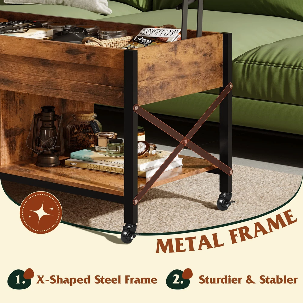 【LIFT-TOP Design】 Our coffee table features a sturdy lift-top design that effortlessly raises and lowers with stability and safety in mind. Crafted with a robust metal framework, it ensures durability while providing a secure platform for your belongings. 【Spacious Storage】With a hidden compartment and two open shelves, this coffee table offers plenty of room to stash away essentials. Whether it's laptops, books, or gaming gear, you'll find the storage both generous and reliable. 【Product Dimension】Measuring at 19.69"D x 41.34"W x 20.2"H, this table is just the right fit for your living space. Plus, it can handle up to 11 lbs on the lift top and a whopping 44 lbs in the hidden compartment, making it both practical and versatile. 【Sturdy and convenient】Crafted from high-quality MDF board and a robust metal frame, this coffee table is built to last. It features four caster wheels and four adjustable feet at the bottom, allowing for easy movement and protecting your floors from scratches. 【Easy to Install】With the included detailed assembly instructions, tools, and clearly marked parts, you can complete the installation in just 30 minutes. If you have any questions, our customer support is always here to help.