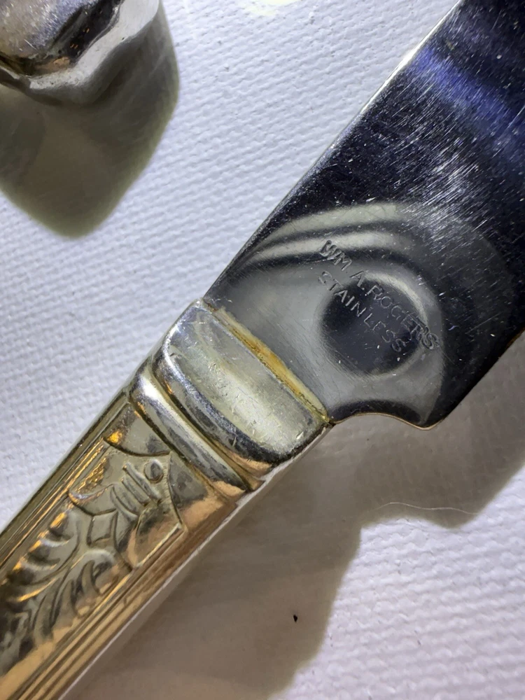 Elevate your dining experience with the WM Rogers Silver Plate Set of 6 Dinner Knives, a testament to classic elegance and craftsmanship. Each knife in this set boasts the fine attention to detail and superior quality that is synonymous with the WM ROGERS and son brand, known for their exceptional silverplate tableware. This set of antique silver plated flatware is a striking addition to any table setting, perfect for those who appreciate the beauty and heritage of silverware. The sophisticated design and durable composition ensure these knives are not only a visual delight but also a practical choice for daily use or special occasions.