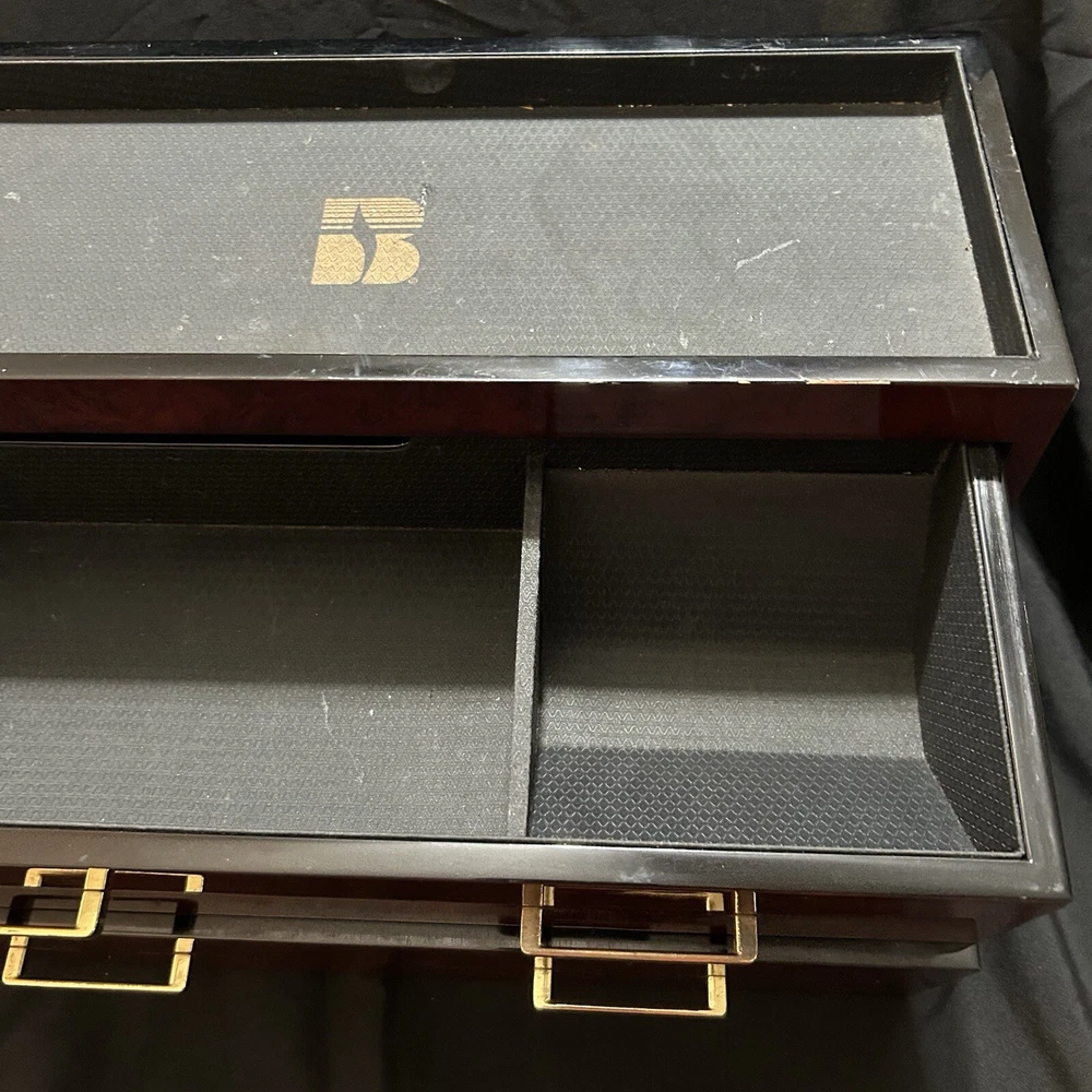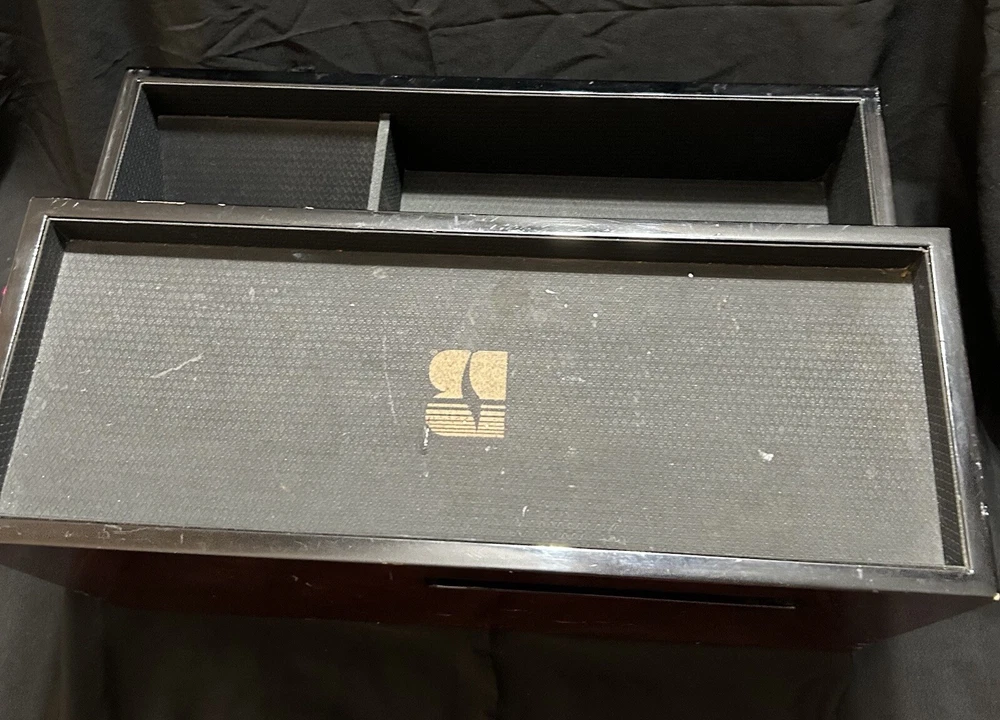 WOLF Meridian 2 Drawer Valet with Charging Station & Pen Box 15in Reddish Brown 15 x 8 x 6 The charging station is a hole in the back through where you can set your phone to charge. You will be receiving exactly what you see in pictures Good used condition. There are several little imperfections from use and aging such as scratches and some small chips. One of the compartments’ dividers is loose but it works perfectly. Please study pictures carefully before purchasing. Feel free to ask us any questions. Thank you for visiting our store!