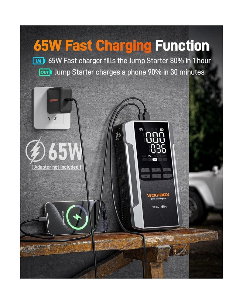 WOLFBOX 4000A Jump Starter with 160PSI Air Compressor, 12V Car Battery Booster, 65W Fast Charge, 24000mAh Portable Tire Inflator, LED Display for 10L Gas & 10L Diesel Engines, LED Light, Jumper Cables Description Features: Newly Upgraded All-in-one Jump Starter and Air Compressor - Built-in 24000 mAh battery and a peak current of 4000A, it can start a completely dead 12V car battery (up to 10L gas or 10L diesel engines). It can also inflate the tires of pickup trucks and below, combining multiple functions in one device 65W Fast Charge - With USB-C 65W port, USB-A ports (12W/18W) and upgraded 160W DC continuous output, it can be fully charged in as fast as two hours. It's also a 24,000 mAh mobile power bank, ready to power tablets, phones and other devices Inflate a Pickup Truck in 2.5 Minutes - With a powerful 45 liter per minute (160 PSI) motor, it takes just 2 minutes 30 seconds to inflate a 315/70 R17 pickup truck tire from 30 PSI to 36 PSI, and 1 minute 20 seconds to inflate a 275/70 R17 SUV tire, making quick work of insufficient tire pressure Booster & 400 Lumen Lights - Offers a powerful booster for starting vehicles in low voltage conditions and is 3-5 times brighter than typical equipment with its 400-lumen LED flashlight. Includes distress, strobe, and high beam modes, making it an essential emergency device Operates down to -4F & 10 Types Protections - The portable battery jump starter with air compressor, rated at IP64 for protection, ensures resilience in harsh environments. Operates at -4F and survives the cold Product Details: Brand: WOLFBOX Product Dimensions: 2.17"D x 5.28"W x 9.37"H Item Weight: 5.3 Pounds Amperage: 600 Milliamps Peak Output Current: 4000 Amps Brand: WOLFBOX Product Dimensions: 2.17"D x 5.28"W x 9.37"H Item Weight: 5.3 Pounds Amperage: 600 Milliamps Peak Output Current: 4000 Amps Manufacturer: WOLFBOX Automotive Fit Type: Universal Fit Model: MegaVolt24 Air Item Weight: 5.3 pounds Item model number: megavolt 24 air Batteries: 1 Lithium Ion batteries required. (included) Manufacturer Part Number: MegaVolt 24 Air Date First Available: February 11, 2025 Delivery We Do Not Ship Outside of the Continental US. Return Policy All items qualify for returns within 30 days of receipt. Buyer is responsible for return shipping on any item that is not damaged. Feedback We take our reputation seriously, we buy and sell online, so we understand the value of trust. If you are unsatisfied with your order, please contact us and we will work with you to resolve it to your satisfaction.