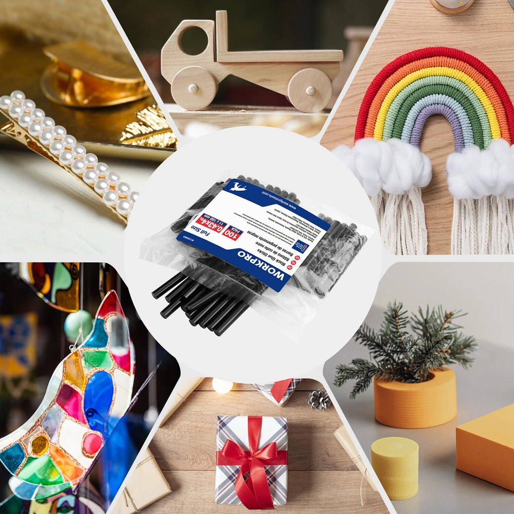 Product Description 【100 PCS Full Size Sticks】 Comes with 100 packs of black hot melt glue sticks for most repair use, 0.43" diameter x 4" length full-size hot glue stick fits most glue guns on the market. 【Strong adhesive & Good flexibility】 Hot glue sticks full size are made of quality flexible resin EVA, which has fast curing speed, strong adhesion, and certain toughness. Easily Melts and Sticks to Most Surfaces with Great Flexibility. 【Environmentally Friendly Nontoxic】 Made of environmentally friendly, non-toxic high-quality materials to ensure that no harmful substances and odors are produced during operation. The glue stick is of high purity, has no impurities, and will not produce bubbles. 【All Temp】 The hot glue gun sticks are suitable for high, dual and low-temperature full-size glue guns, providing great convenience for all types of projects. Low temp can bond delicate materials like fabrics, and high temp can bond heavier materials like ceramics and metals. 【Wide Appliaction】 Hot Melt Adhesive Glue Sticks are widely used in wood, paper, cardboard, metal, textile, cork, glass, and various plastics, and are perfect for electronic appliances, general repairs, home holiday decorations and DIY art crafts. Brand WORKPRO Material Resin Item Form Stick Special Feature Fast Drying, Non Toxic Color Black Item Package Quantity 1 Package Dimensions 10.24 x 7.87 x 2.36 inches High Transparency Clear without bubbles and impurities Stays Flexible Good flexibility and luster, Strong adhesion and great toughness High Viscosity Pos sess great adhesion properties, works on many hard-to-bond surface Full Size Glue Sticks Pack of 100 pcs high-strength full size Hot Glue Sticks for so many activities applications