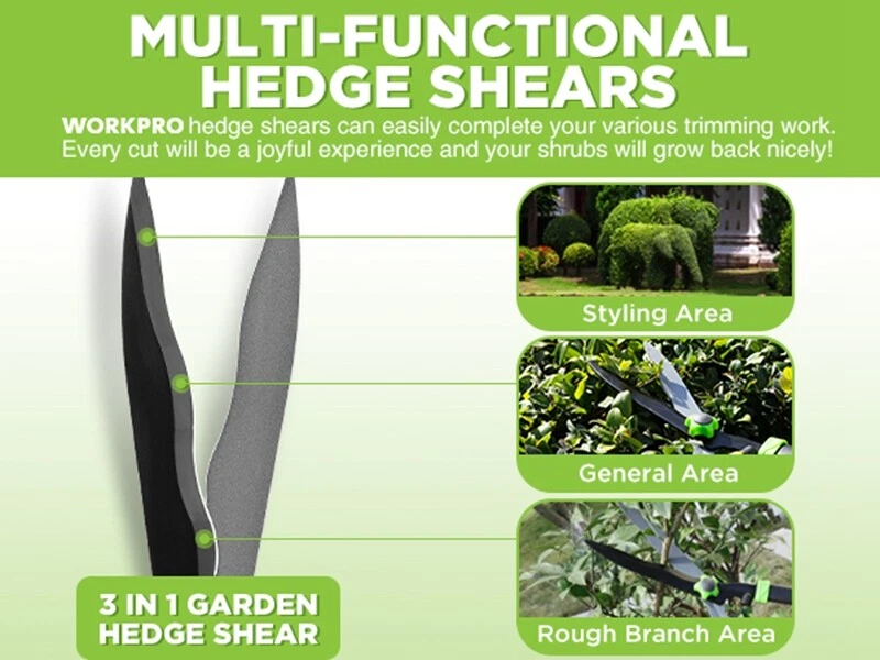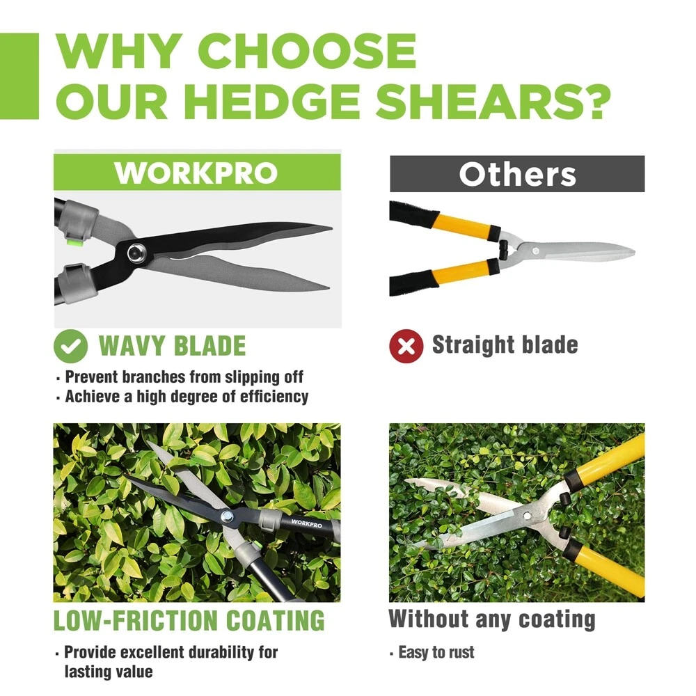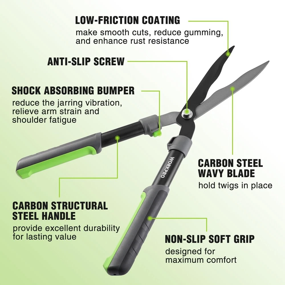 [ IDEAL HEDGE SHEARS ] - 23" hedge shears equipped with steel wavy blade, egonomics handle and shock absorbing bumper, is ideal garden tool for pruning tasks like making high or hard-to-reach cuts, trimming flower stems, maintaining your herb garden, and more to encourage overall plant health. [ CLEAN, EFFORTLESS CUTS ] - The steel wavy blades with low-friction coating are heat-treated and contoured for clean, effortless cuts that prevent branches from slipping off. Your bushes and trees will keep healthy and attractive with clean, smooth cuts! [ LABOR-SAVING DESIGN ] - The 14°ergonomic angle of our bush cutter reduces work impact, minimizes wrist fatigue, and prevents bending while trimming. Position the shears blade-up for flat cuts and flip them for circular or arc cuts. Elevate your trimming game with our user-friendly design. [ SHOCK ABSORBING BUMPER ] - Incorporating a shock-absorbing bumper for responsive and comfortable stops, our garden hedge trimmer minimizes impact force during tough bush cuts. This feature reduces wrist and shoulder pain, enhancing overall comfort and control during operation. [ ERGONOMIC HANDLES ] - Ergonomic handle with non slip grip of our precision bush shears ensure a secure grip in any position, providing durability and comfort for all your gardening tasks. With WORKPRO Garden Clippers, every cut becomes a joy, and your shrubs thrive! anufacturer HANGZHOU GREATSTAR INDUSTRIAL CO.,LTD Part Number 23" hedge shear Item Weight 3.57 pounds Package Dimensions 24.65 x 8.46 x 2.56 inches Country of Origin China Item model number 23" hedge shear WORKPRO HEAVY DUTY HEDGE SHEARS SHOW DETAILS Steel Wavy Blade Keep the cut in the cutting area of the shears and do not slip. Shock Absorbing Design Reduce noise and vibration during operation. Efficeient Cut-14° Bevel This design helps users maintain a comfortable and efficient posture using the hedges shears. Ergonomics Handle Soft grip enhance comfort and control, and reduce fatigue at work. MULTIFUNCTIONAL GARDEN PRUNERS