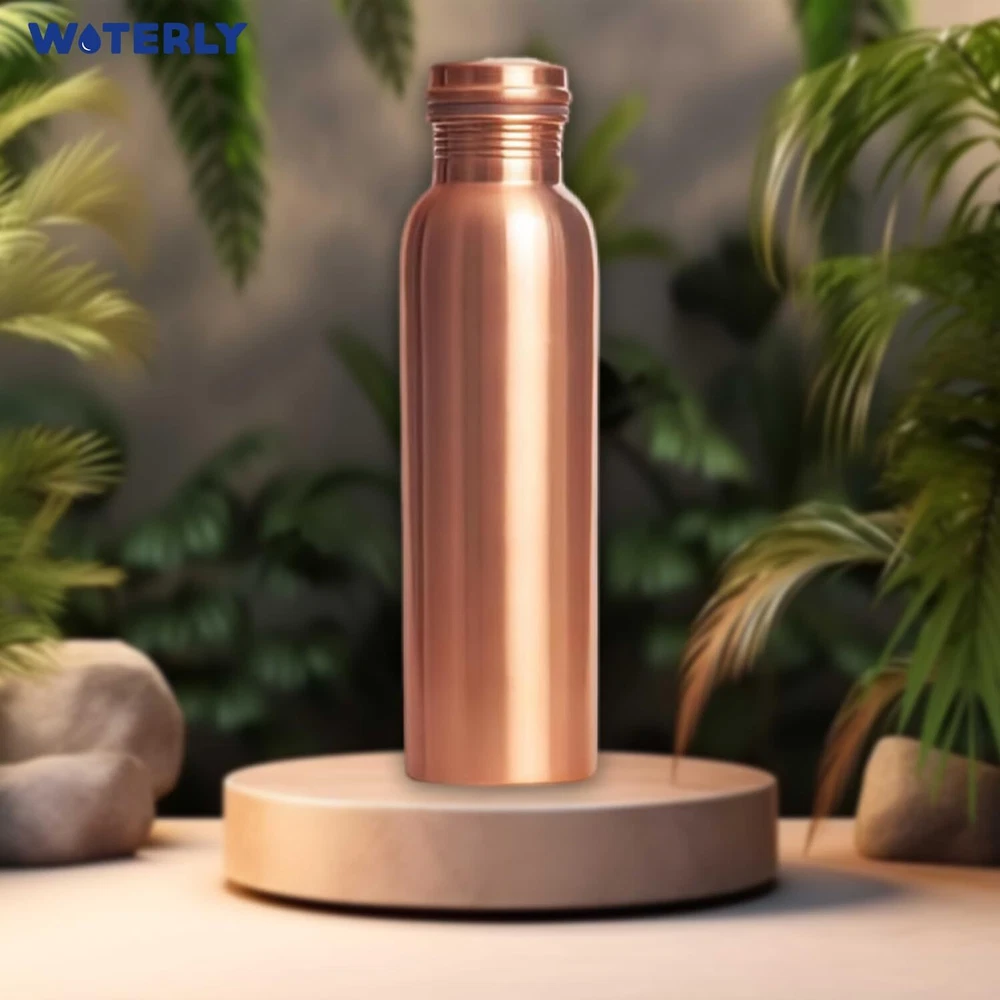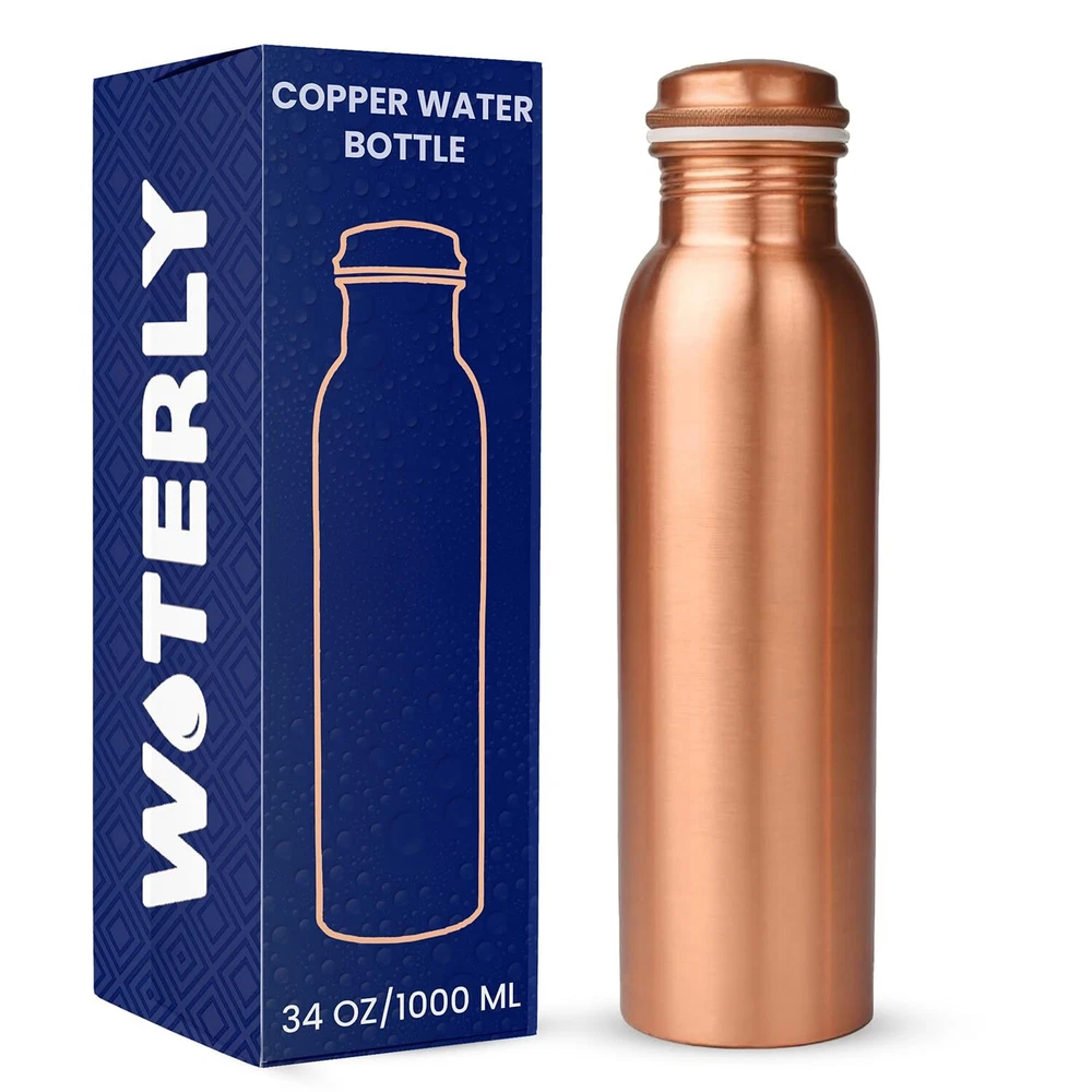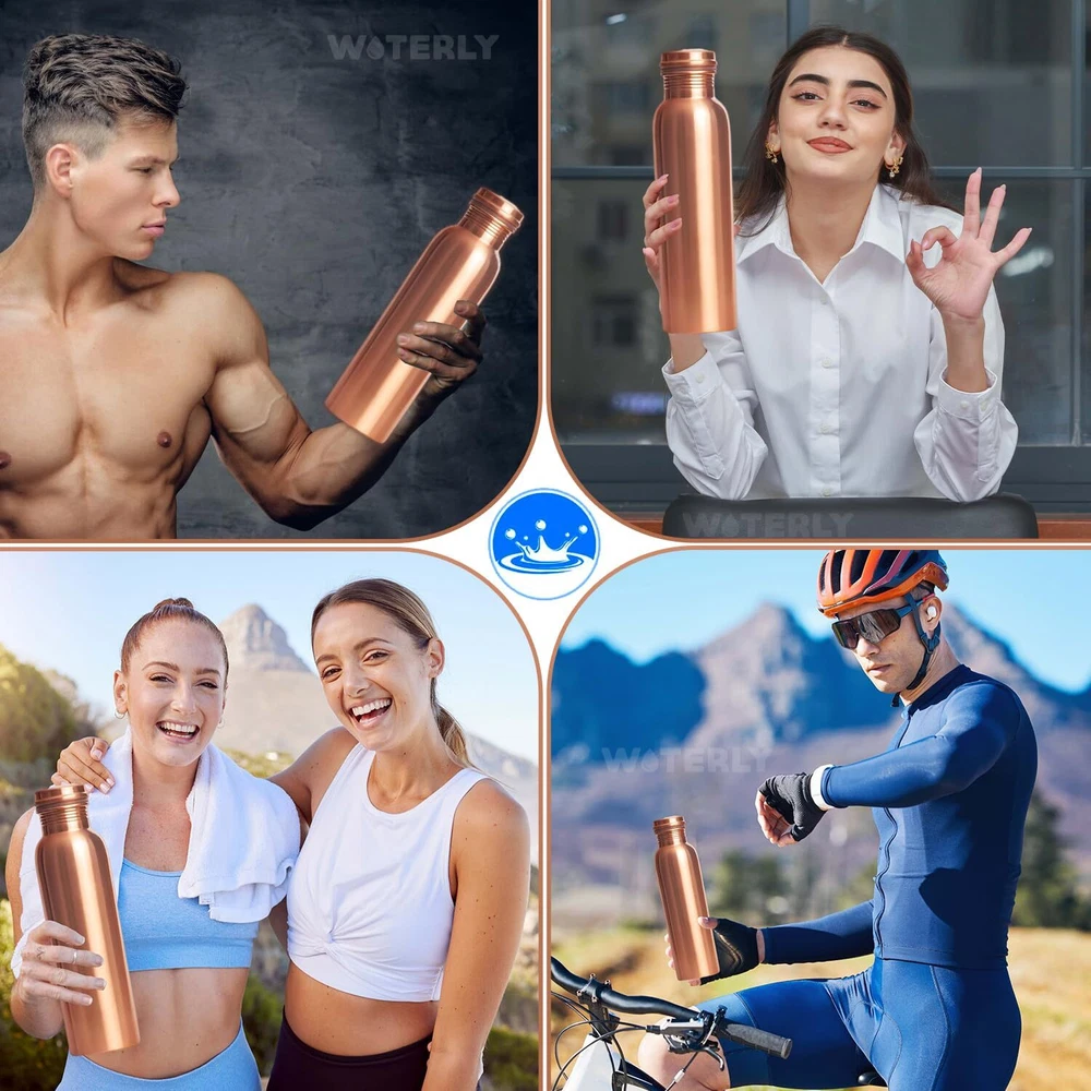 CAPACITY : WOTERLY Copper Water Bottle Having 34 Oz (1000 Ml) Capacity, This Pure Copper Water Bottle Is Perfect For Staying Hydrated During Long Workouts Or Yoga Sessions. It Holds Enough Water To Keep You Refreshed For Hours Without Needing A Refill. BENEFITS OF COPPER : Our copper bottles offers numerous health benefits, such as improved digestion and enhanced immunity. According to Ayurveda, drinking from copper vessels balances the body's and promotes overall wellness. Choose WOTERLY for a healthier lifestyle and a more sustainable planet. 100% Pure Copper Water Bottle : WOTERLY Experience our Pure Copper Bottle, crafted for exceptional health benefits. Embrace Ayurvedic wisdom for overall wellness, combining stylish and functionality in every sip of drinking water START TO ENJOY THE TASTE OF WATER : Discover The Refreshing Taste Of Water With Our Copper Bottle , Infused With Essential Minerals For Natural Health Support. Keep Hydrated All Day With Our Reusable 1-liter Bottle, Ensuring Cold And Delicious Water. Enjoy Pure, Revitalizing Hydration!