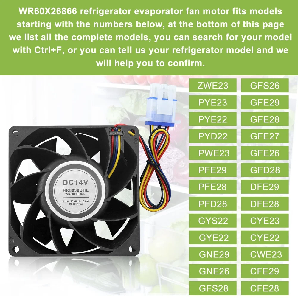 🛠[COMPATIBILITY]:WR60X26866 Refrigerator Evaporator Fan Motor fit for G.E. refrigerator, We have a list of suitable models at the bottom, which you can search by "ctrl+F", If you are not sure whether WR60X26866 is fit for your model, please feel free to contact us before ordering, let us know your refrigerator model, we will check for you 🛠[REPLACES PART]: WR60X26866, WR60X29099, WR02X13733, WR60X10341, WR60X10356, WR60X10357, WR60X24303, WR60X26030, WR60X26033, WR60X26866-24PK, 4546026, AP6278228, PS12172983, EAP12172983, 239D1412P006, V80E14MS2A3-57A611, AP5985039, PS11721915, Please check carefully before buying 🛠[FUNCTION]:WR60X26866 evaporator fan motor circulates air through the fresh food compartment for effective cooling, keeping foods fresh or frozen, WR60X26866 fixes the following symptoms 🛠Abnormal refrigerator temperature 🛠Noise caused by aging of evaporato fan motor 🛠Fridge and Freezer are too warm 🛠[EASY TO INSTALL]:Before installation, please cut off the power supply, and wear gloves to protect your hands, The evaporator fan motor is usually on the back wall of the cold room. After finding the old motor, remove it and then install the new WR60X26866 evaporator fan motor(Take a picture of your device before disassembly to save time on reassembly) 🛠[BUY WITH CONFIDENCE]: The WR60X26866 refrigerator evaporator fan motor supports 180 days return and exchange,We have a professional after-sales service team, if you have any question about this WR60X26866 evaporator fan motor, please feel free to contact us through amazon email or question and answers, we will solve your problem within 24 hours. Don’t hesitate to solve the refrigerator problem easily