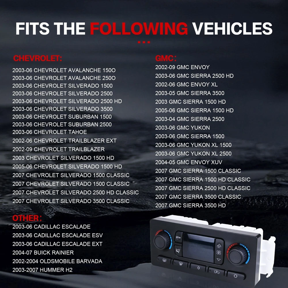 Store Categories Store Categories High Pressure Fuel Pump Liftgate Actuator Struts Oxygen Sensors Rear View Backup Camera Climate Control Panel Tire Press Monitoring System Master Power Window Switch Other Cowtotal Autoparts,Your Best Aftermarket DIY & DIFM Partner. Product Description Pa cka g e includes: 1 x HVAC Control Module Fitme nt : (For Reference Only): 2003-2007 Hummer H2 For GMc Models 2002-2009 GMC EnVOy 2002-2006 GMC EnVoy XL 2003-2006 GMc Sierra 1500 2003 GMC Sierra 1500 HD 2005-2006 GMCSierra 1500 HD 2003-2004GMCSierra 25002003-2006 GMC Sierra 2500 HD2003-2005 GMCSierra 3500 2003-2006 GMC Yukon 2003-2006 GMC Yukon XL 15002003-2006 GMCYukon XL 2500 2004-2005 GMC Envoy XUV 2007 GMC sierra 1500 Classic 2007 GMC Sierra 1500 HD Classic2007 GMC Sierra 2500 HD Classic2007 GMC Sierra 3500 Classic 2007 GMC Sierra 3500 HD For cadillac Models 2003-2006 Cadillac Escalade 2003-2006 Cadillac Escalade ESV 2003-2006 Cadillac Escalade EXT For chevrolet Models 2003-2006 Chevrolet Tahoe 2002-2009 chevrolet Trailblazer 2002-2006 Chevrolet Trailblazer EXT 2003-2006 ChevroletAvalanche 1500 2003-2006 Chevrolet Avalanche 2500 2003-2006 Chevrolet Silverado 1500 2003 Chevrolet Silverado 1500 HD 2005-2006 Chevrolet Silverado 1500 HD 2003-2006 Chevrolet Silverado 2500 2003-2006 Chevrolet Silverado 2500 HD 2003-2006 Chevrolet Silverado 3500 2003-2006 Chevrolet Suburban 1500 2003-2006 Chevrolet Suburban 2500 2007 Chevrolet silverado 1500 Classic 2007 Chevrolet Silverado 2500 HD Classic 2007 Chevrolet Silverado 3500 Classic Features: 100% Brand New. According to o riginal factory specifications, perfect match to original car . Made of high quality material. Parts are from certified professional factory. Specifications: Interchange Part Number:599-211XD, 599211XD, 599-211, 599211 OE/OEMPartNumber:10367041, 10367042, 10399657, 15077479, 15079112, 15085358, 15105215, 15105969, 15107730, 15132070, 15133519, 15136332, 15137655, 15165918, 15175897, 15185639, 15192450, 15195331, 15195380, 15195564, 15201969, 15202099, 15203179, 15214766, 15220310, 15220319, 15222482, 15763065, 15814152, 15832311, 15832314, 15832316, 15832318, 15845093, 15855848, 15855849, 21997426, 21997427, 21998695, 21999159, 21999163 Manufacturer Part Number:599-211xd Connector Quantity: 2 Housing Color: Black Mounting Hardware Included: No Mounting Type:Bolt On Note: Pleas e Check Carefully To Make Sure the OE Number And Picture are Exactly Listed Are The Same As Your Orignal One. If You are Not Sure Whether It Fits, Please send VIN number to us. No Instruction Included, professional installation is highly recommended . Payment Policy Shipping Policy Returns Policy Warranty Payment Policy 1. We accept Paypal, Credit Card, Veno,Goggle Pay,American Express,Discover, Direct Debit, VISA, eCheck, or othe r methods, please kindly check Paypal for more information. 2. For multiple purchases, please add items to your Ebay shopping cart and pay once for entire order. Shipping Policy 1. All items will be shipped to buyer's ebay address. 2. All items will be shipped within 24 working hours upon receipt of payment, and multiple items might be combined shipping. 3. In most cases, delivery takes around 3-7 business days, it's highly depended on the efficiency of the shpping carrier. If your item doesn't arrive on time, please contact us immediately for further assistance. Please note there is no local pickup service available. 4. We do appreciate your purchase here. If you are astisfied with the item as well as our service, please kindly leave us a Positive Feedback to help develop our bu siness. Th ank you in advance. Returns Policy We have a friendly and dedicated customer support teams to handle any problems you come up with our products. Please contact us first via email or message for replacement, refund or technical problem caused by any reason. Warranty 30 Days Free Return and Money Back Guarantee. If you are not satisfied with your purchase, you can return the item with original packaging back to us for full refund, not any re-stock fee. The return cost should be paid by buyer. 5 Year Unl imited Mileage Quality Guarantee If you receive any w rong items, or damage during the transportation or defect items, we will accept the return and pay the return freight. Please noted that the return cost should be prepaid by buyer, we will issue the refund of return cost to buyer after inspecting the faulty item. The full refund or replacement will be available for all faulty items, including the original shipping cost. Please kindly contact us b efore return, our representatives will send you the detailed return instruction. The guarantee will be only for the cost of the item, we will not responsible for installation or other fees like labor expenses, towing expenses, additional repair expenses or other related expenses. Copyright © 2023 Dianxiaomi