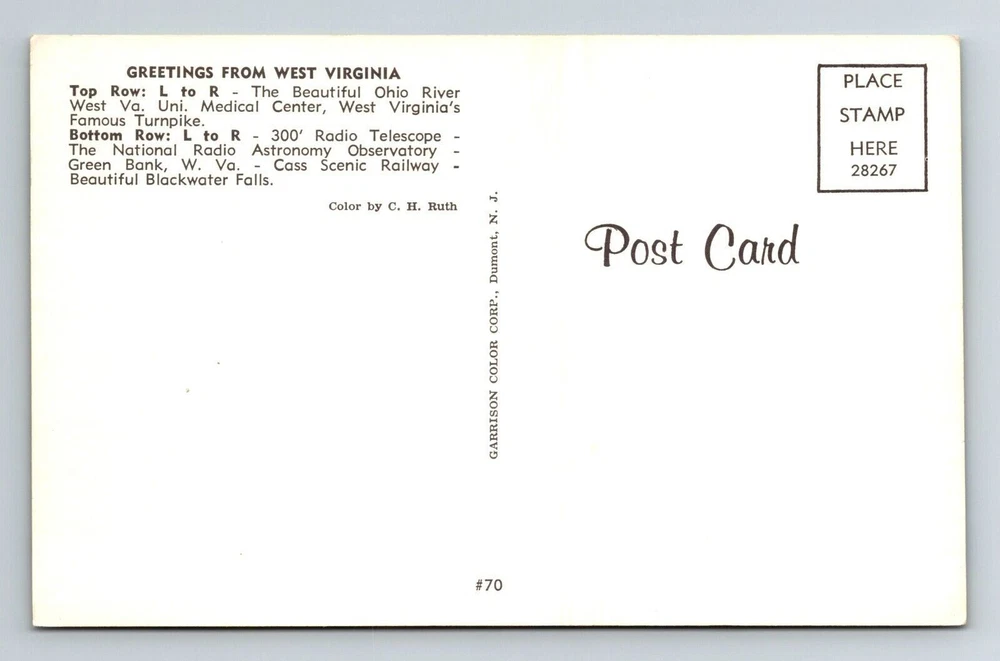 Region: West Virginia Type: Printed (Lithograph) Unit of Sale: Single Unit Original/Licensed Reprint: Original Subject: Cities & Towns Country/Region of Manufacture: United States Country: USA Continent: North America City: West Virginia Era: Chrome Postage Condition: Unposted Theme: Cities & Towns
