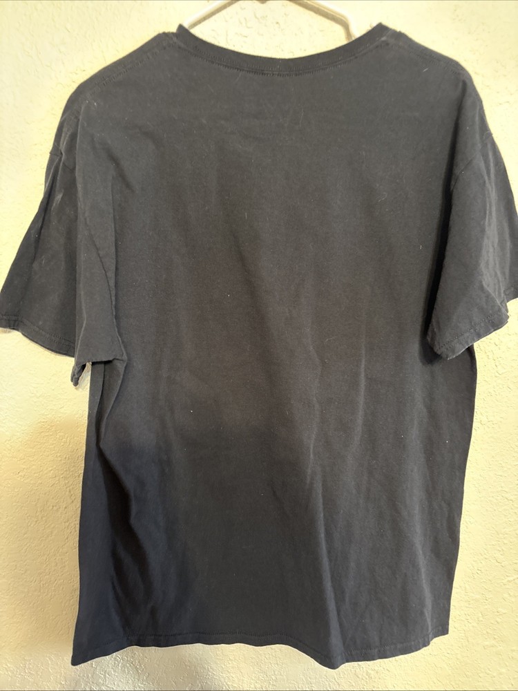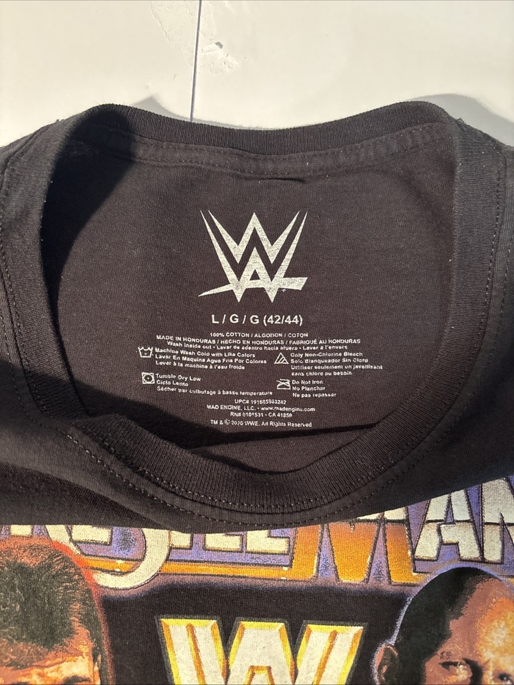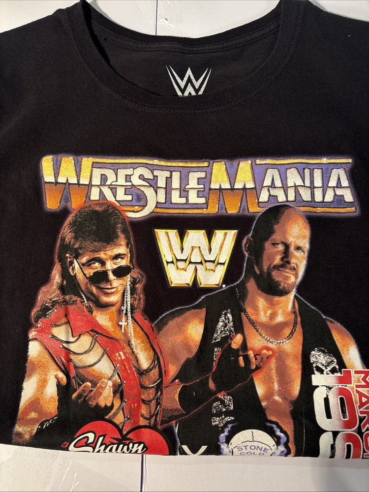 The WWE Wrestle Mania 14 1998 Shawn Michaels Stone Cold Graphic T-shirt in size Large is a vintage style shirt featuring a retro reproduction of the iconic WrestleMania XIV event. This black shirt made of 100% cotton with a crew neck and short sleeves is accented with the WWE logo and graphics of Stone Cold and Shawn Michaels, capturing the essence of 90s pro wrestling. Perfect for all seasons, this machine washable shirt is a must-have for fans of WWE WrestleMania and wrestling in general.